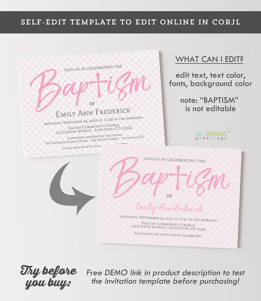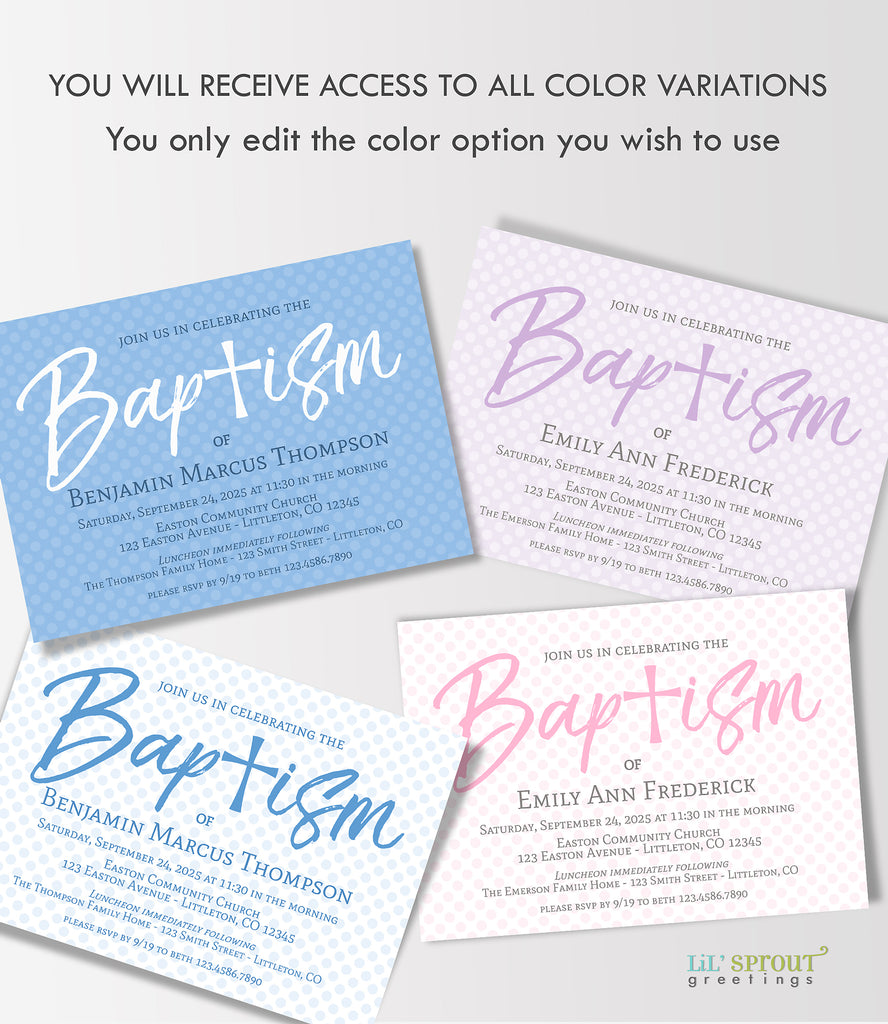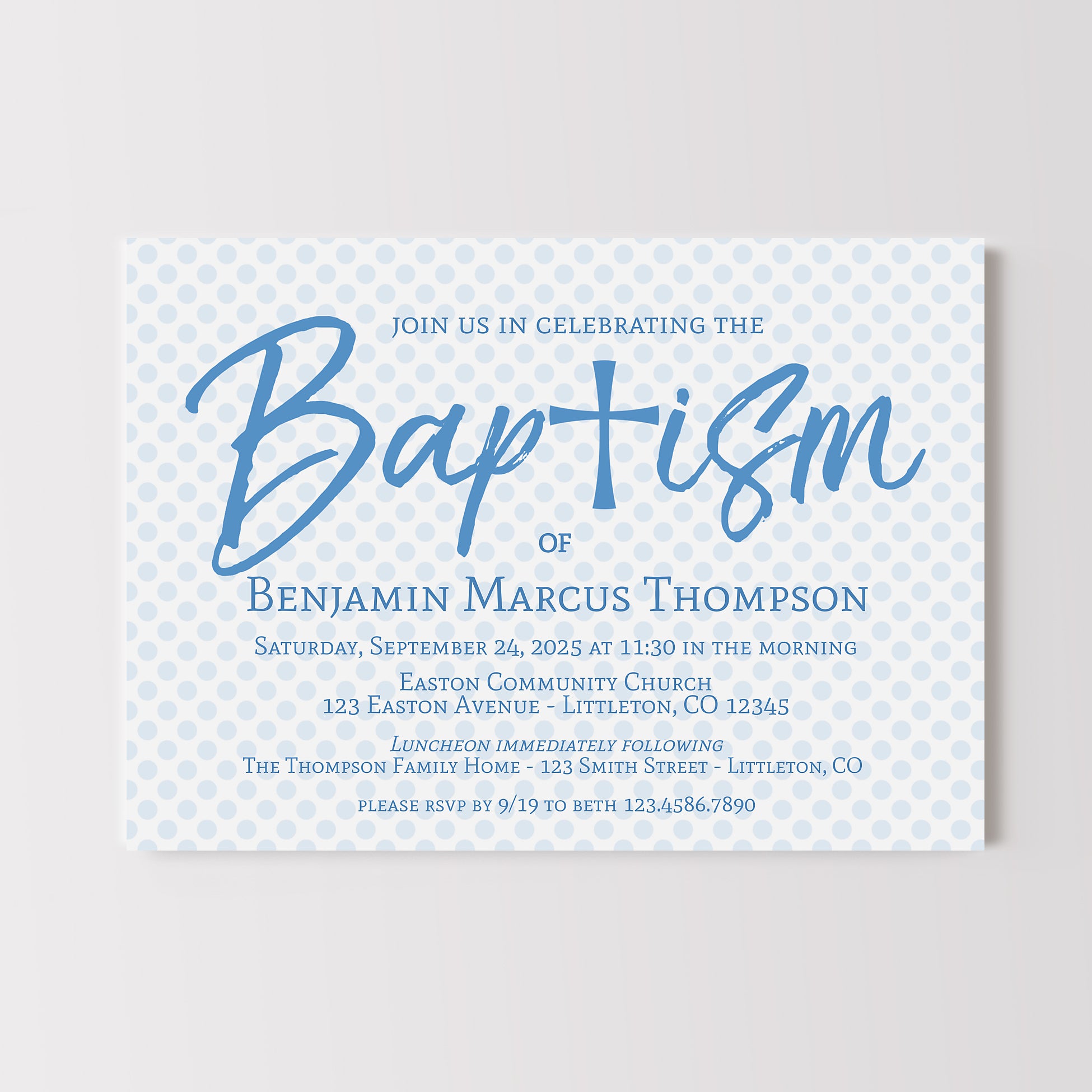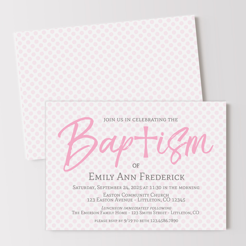 This simple baptism invitation template features a polka dot background and a cross for the letter T in baptism. Choose from four color options.