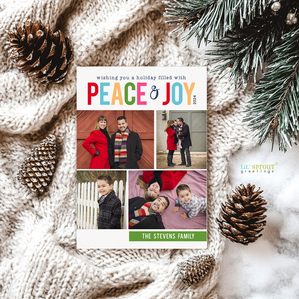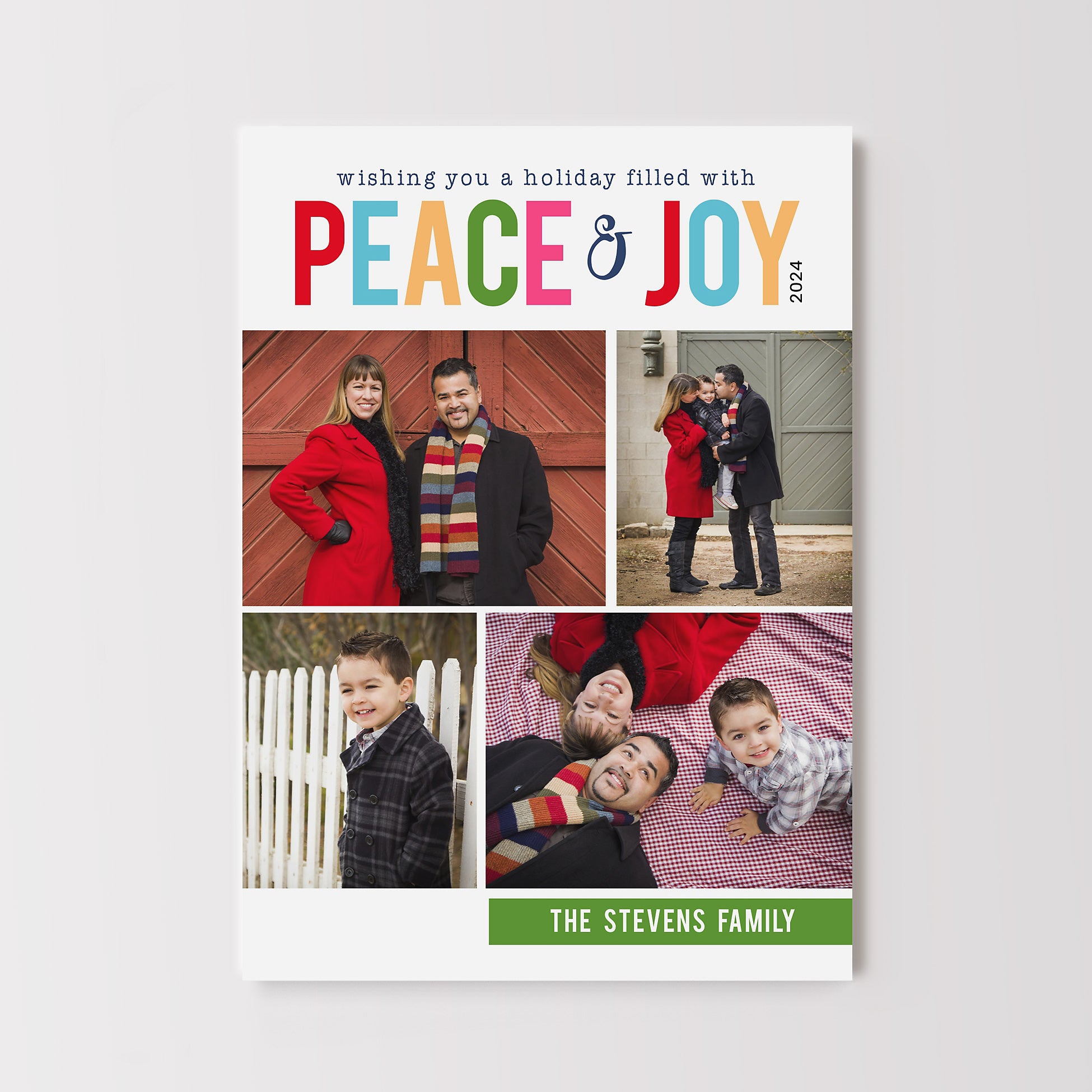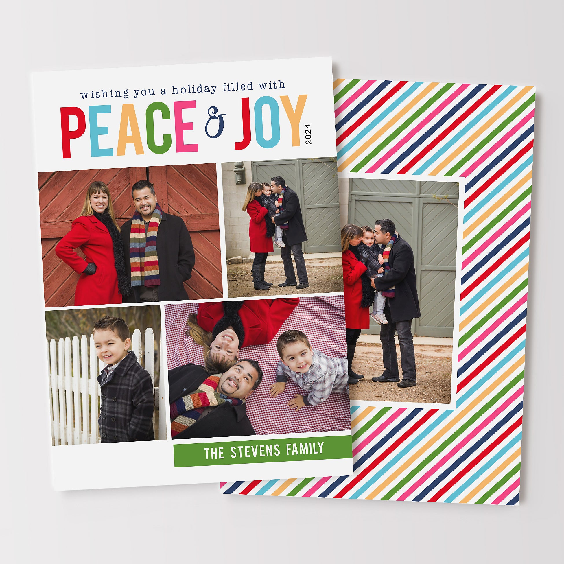 Colorful Christmas card with four photos on the front and a rainbow striped background. Add an additional family photo to the back side if you'd like.