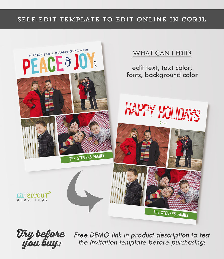 Our invitation templates are formatted for editing on Corjl, an in-browser template editor that allows you to login, add your text and photos to your card template and download the completed files. No software or experience is necessary. Edit from a computer or a mobile device. Use your completed files to print your invitation or send it digitally.