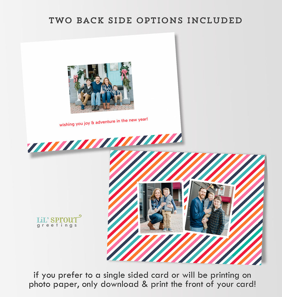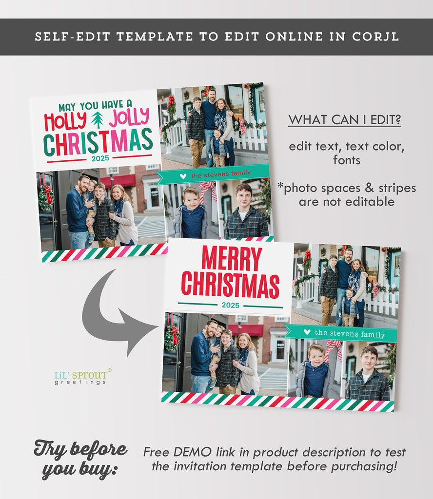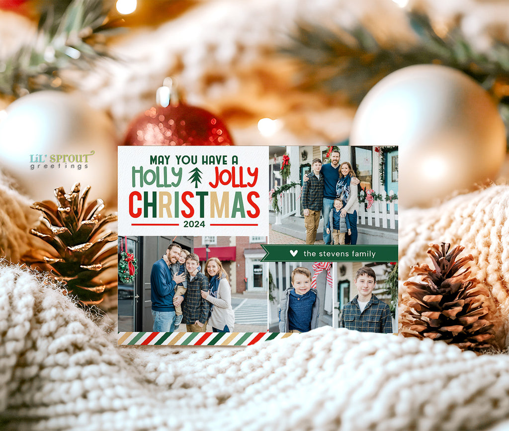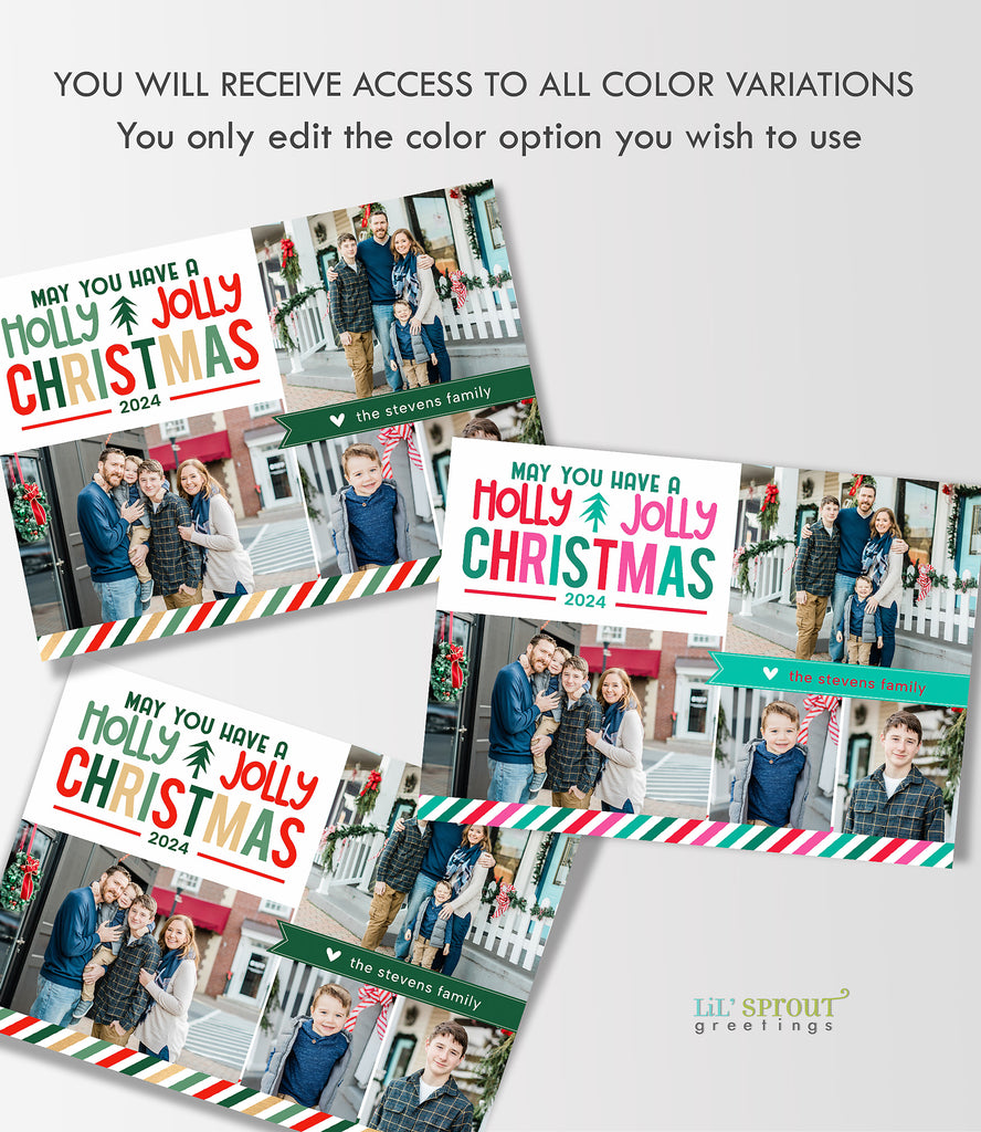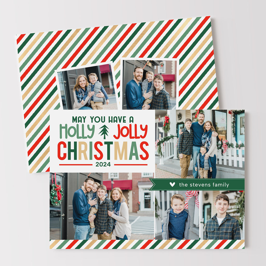 Colorful Christmas card template with a "holly jolly" themed and striped border. Choose from three fun color choices.