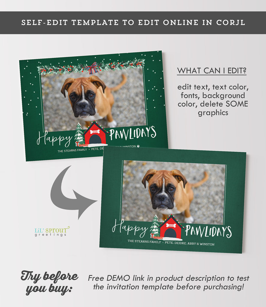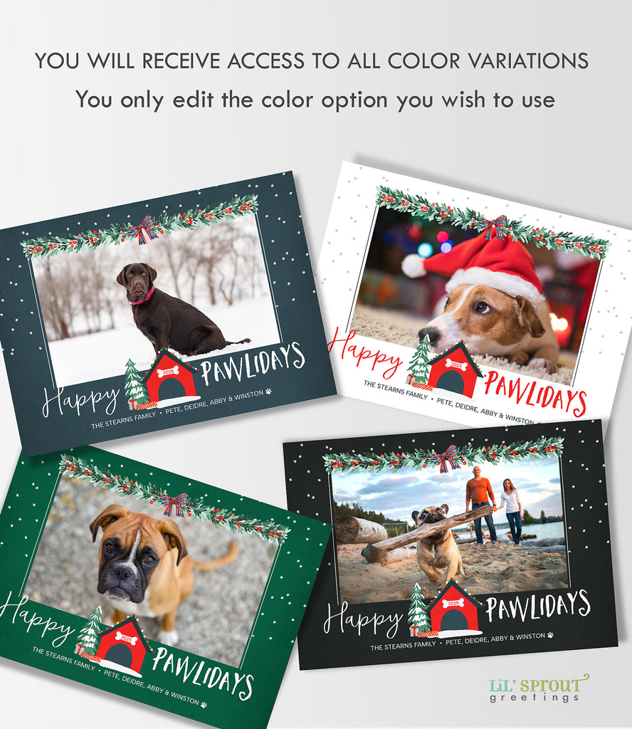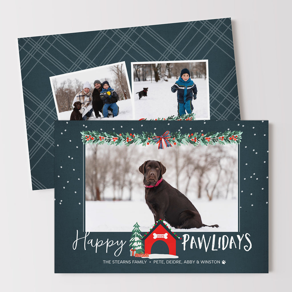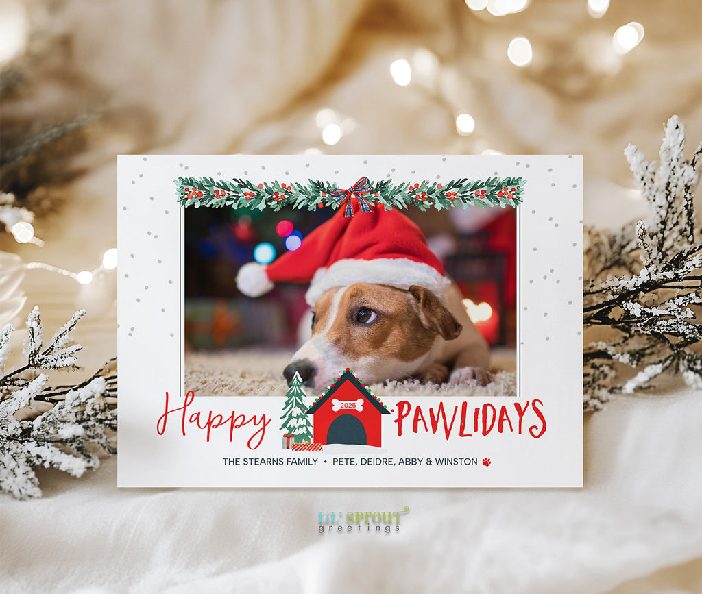 Fun pet holiday card template with a Christmas themed dog house. A single photo of your dog or family is featured and framed with holiday themed garland along with a Happy Pawlidays message.