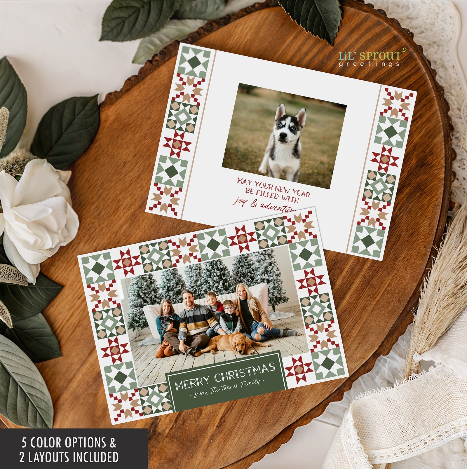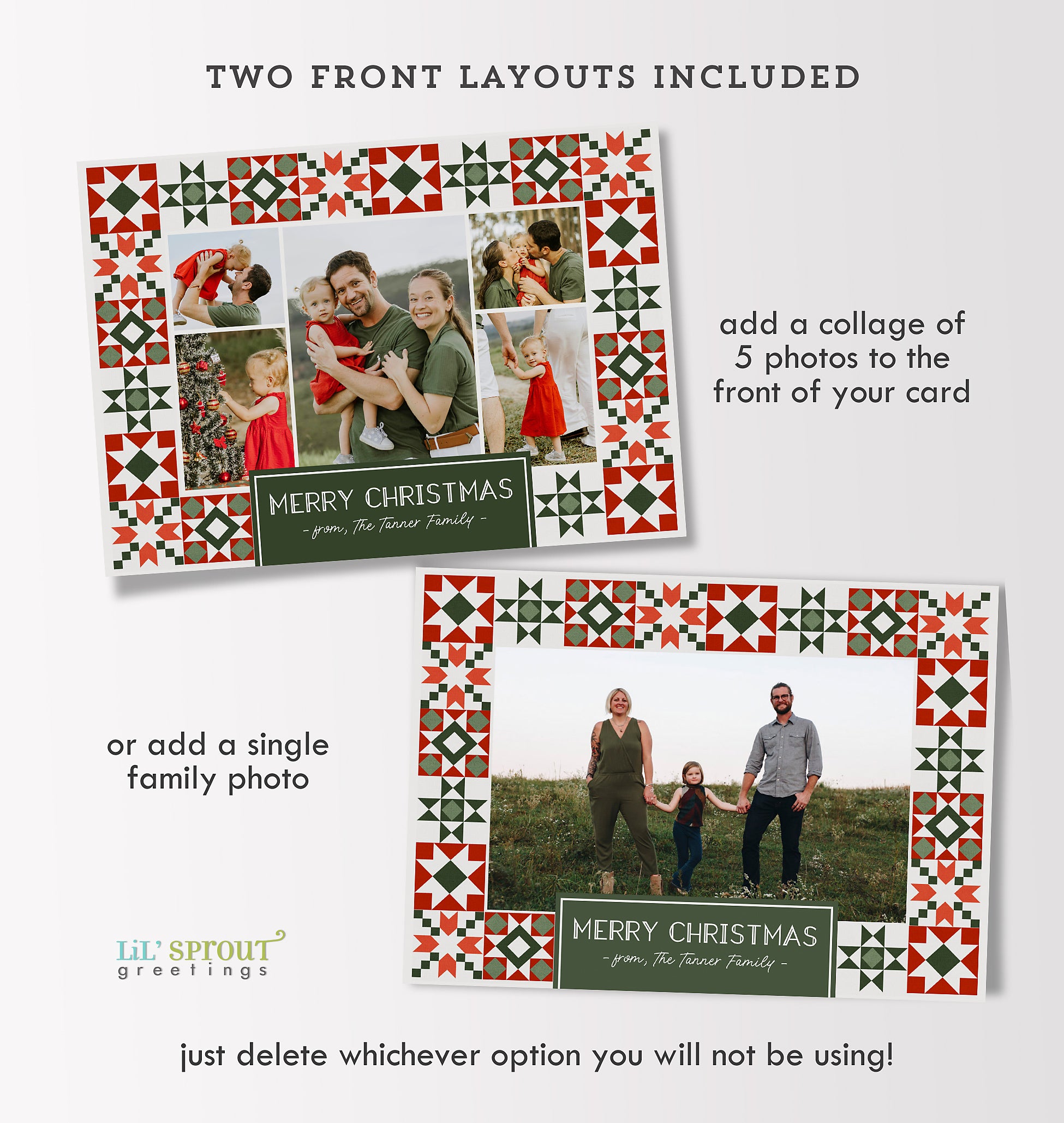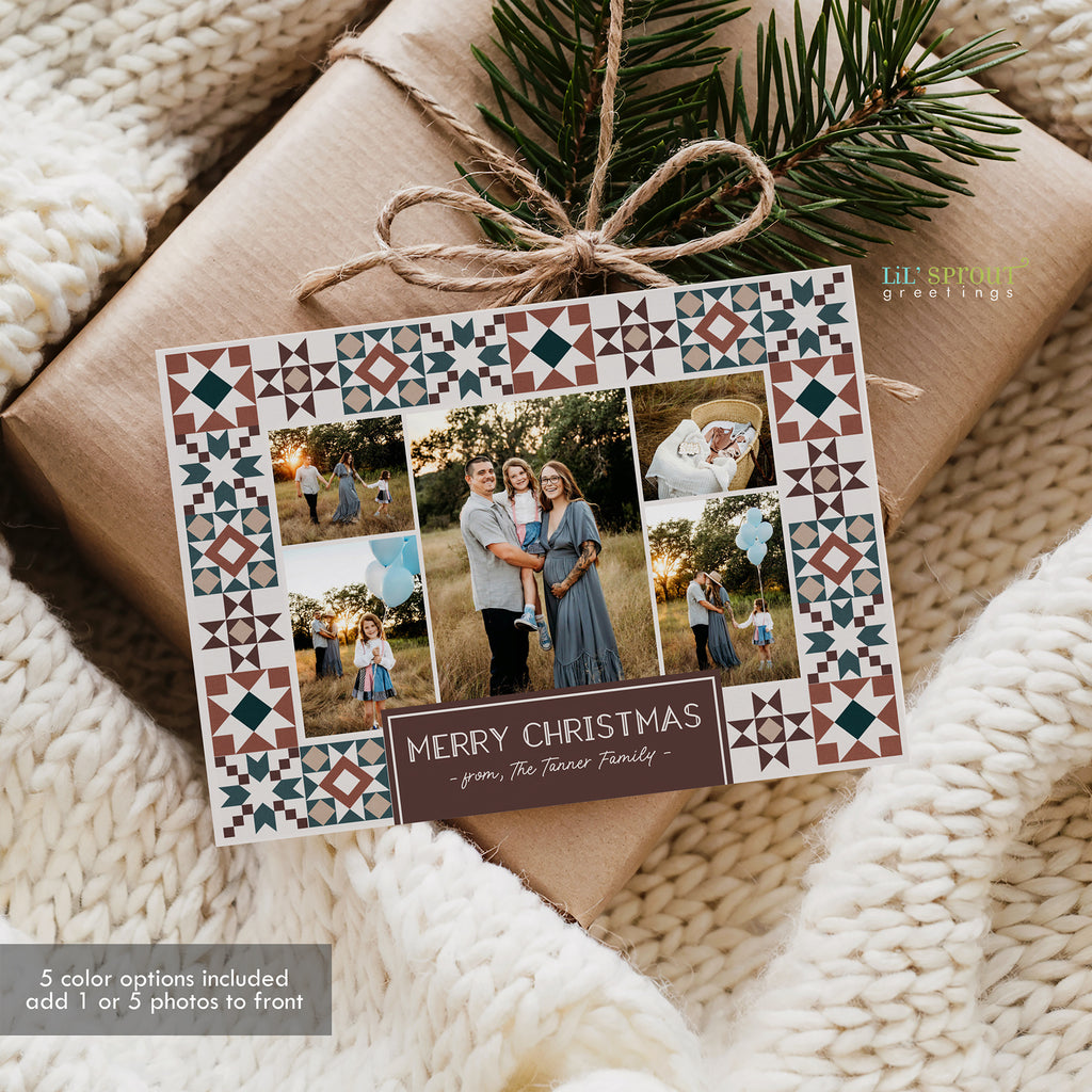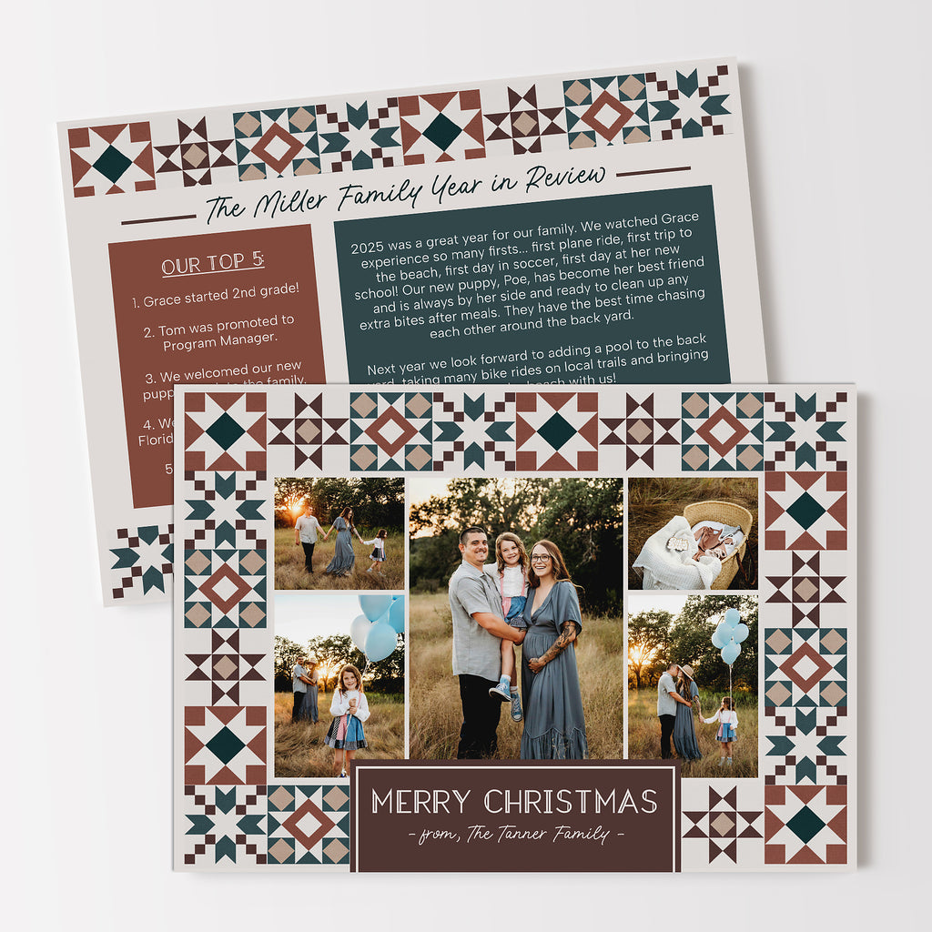This trendy quilt pattern Christmas card frames your horizontal photo in a border of Christmas stars in quilted style. Five cozy color options are included from jewel tones, to rustic red and blue, or more traditional red and green shades. There are two layouts for the front side: use a single photo or add a collage of five photos. The back side includes two options: add a photo and few lines of text or include a full "year in review" / family update. Tip: if you prefer brighter colors try changing the background color to white.