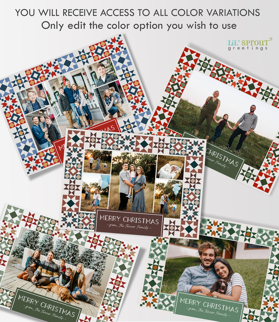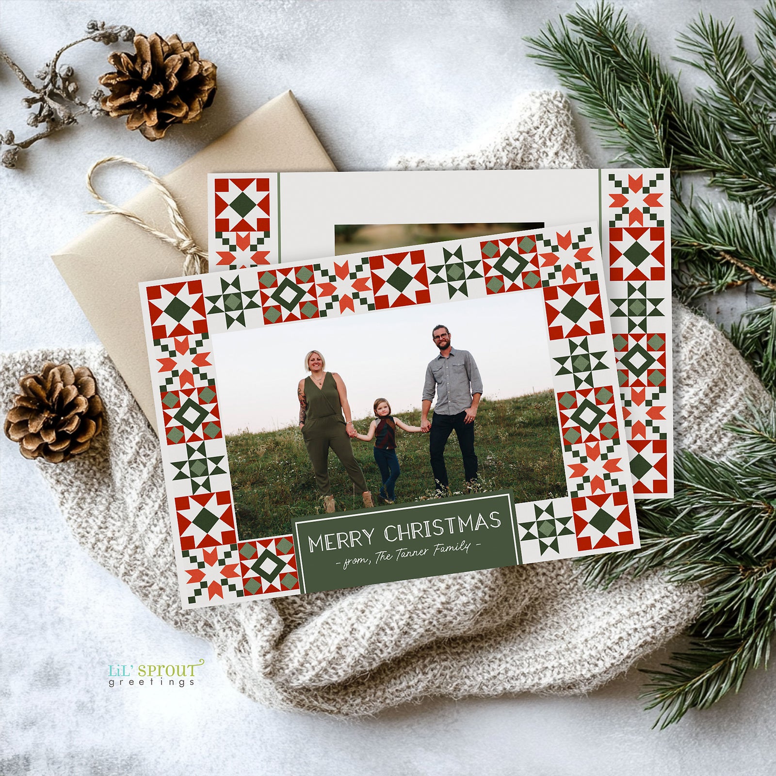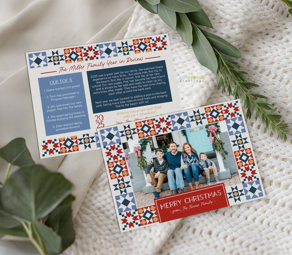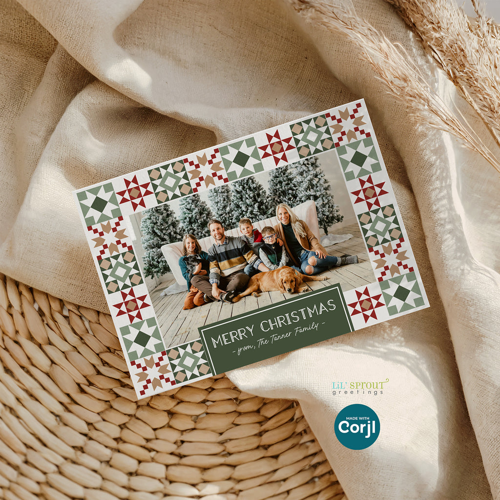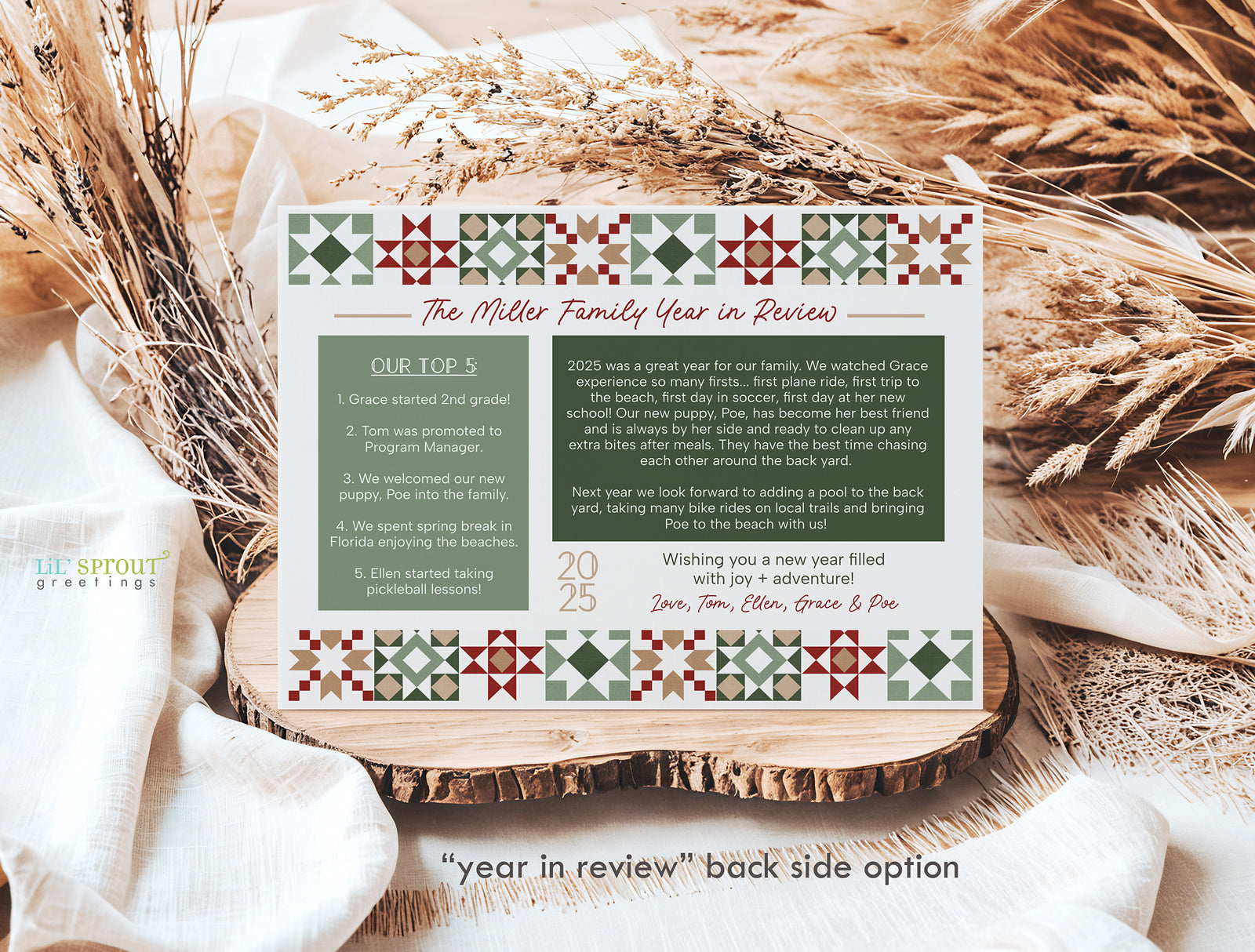 This trendy quilt pattern Christmas card frames your horizontal photo in a border of Christmas stars in quilted style. Five cozy color options are included from jewel tones, to rustic red and blue, or more traditional red and green shades. There are two layouts for the front side: use a single photo or add a collage of five photos. The back side includes two options: add a photo and few lines of text or include a full "year in review" / family update. Tip: if you prefer brighter colors try changing the background color to white.