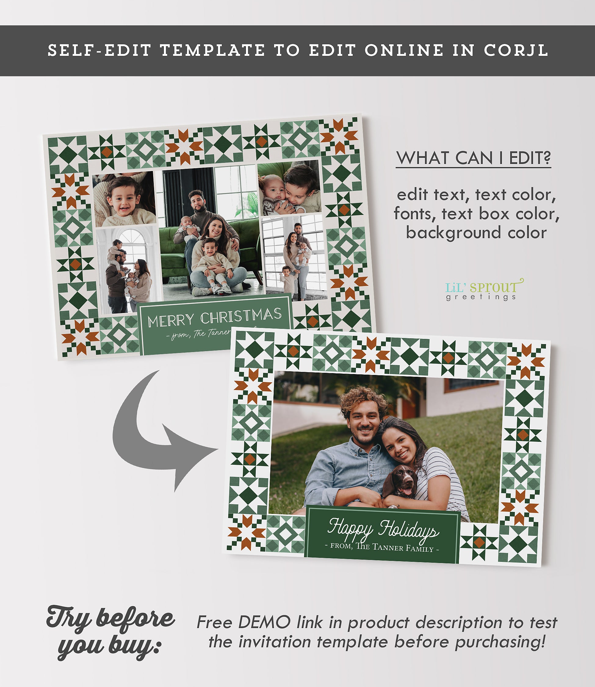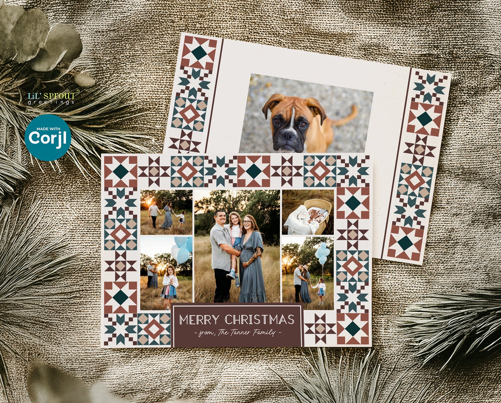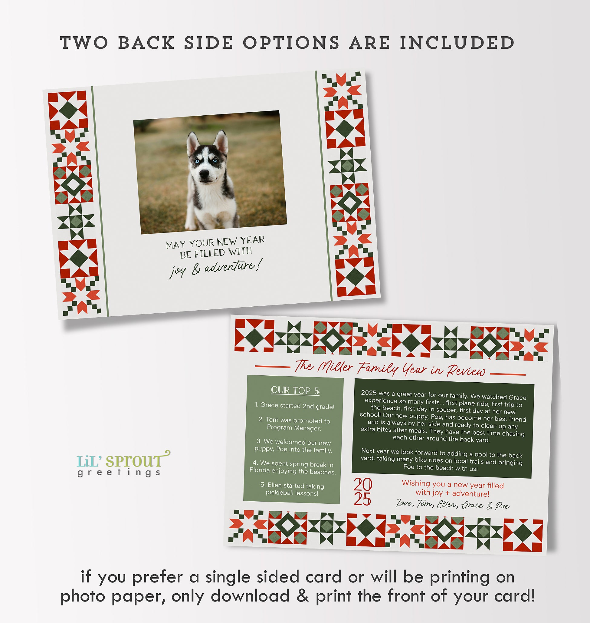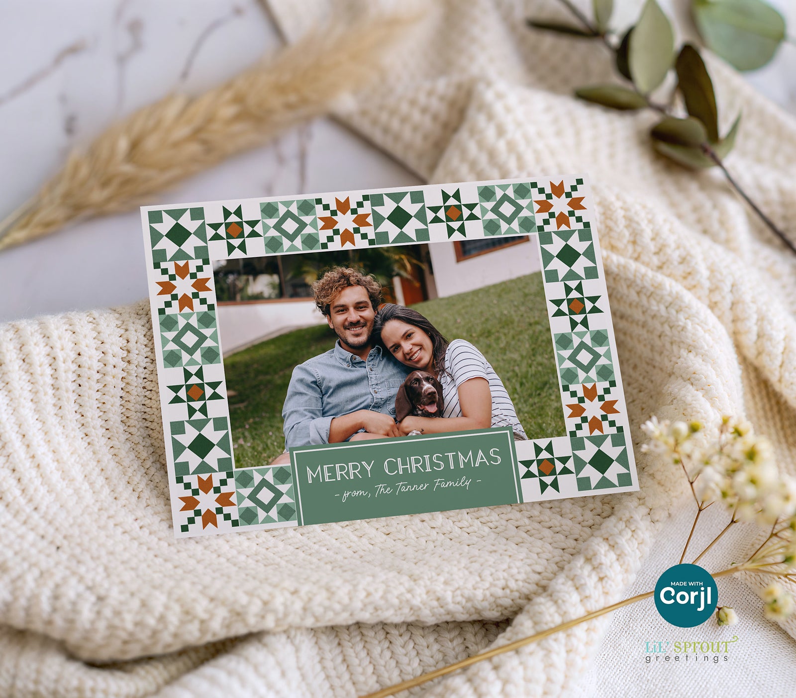 This trendy quilt pattern Christmas card frames your horizontal photo in a border of Christmas stars in quilted style. Five cozy color options are included from jewel tones, to rustic red and blue, or more traditional red and green shades. There are two layouts for the front side: use a single photo or add a collage of five photos. The back side includes two options: add a photo and few lines of text or include a full "year in review" / family update. Tip: if you prefer brighter colors try changing the background color to white.
