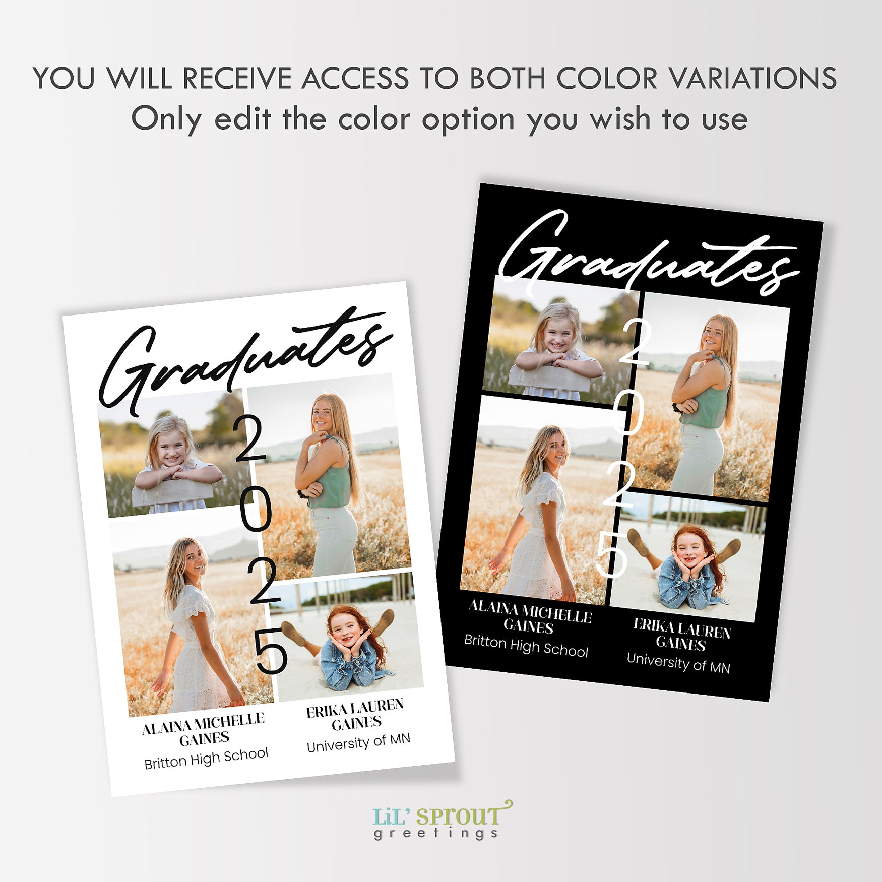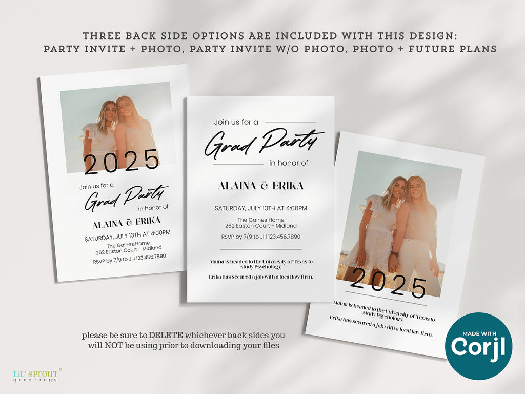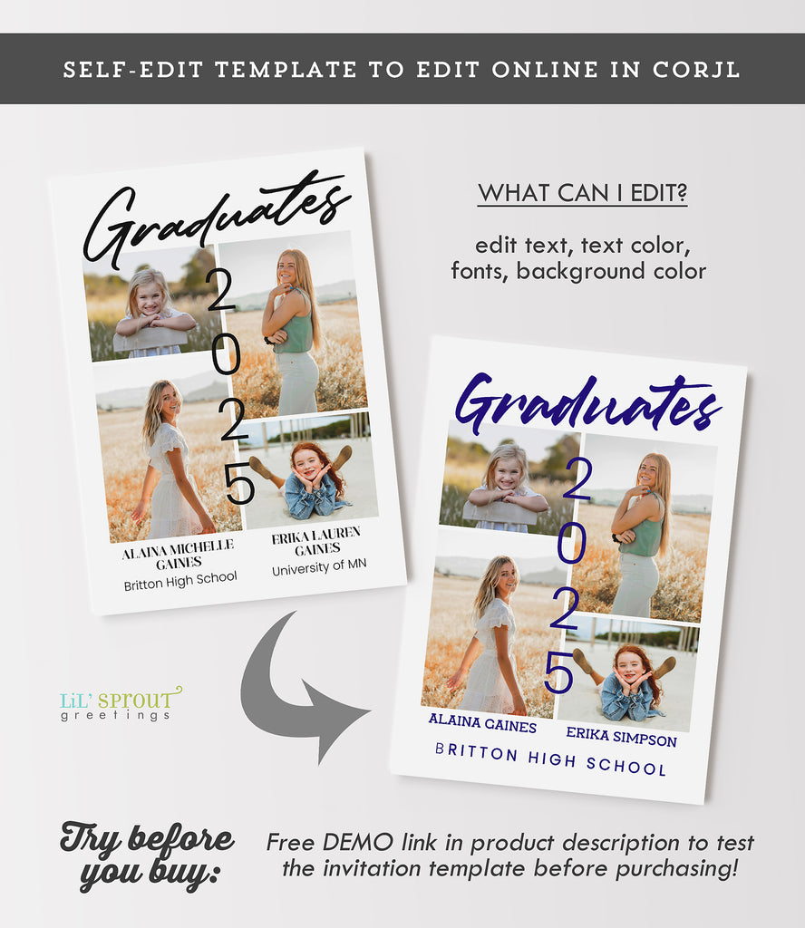 Two person grad invitation for siblings, cousins or friends sharing a celebration. Use a senior photo & childhood photo on the front. Back side options allow you to include a party invitation, additional photos, and future plans. Colors can be customized on this graduation announcement.