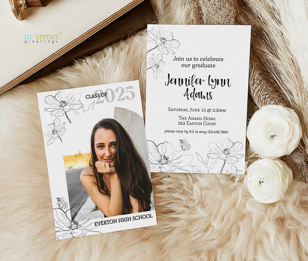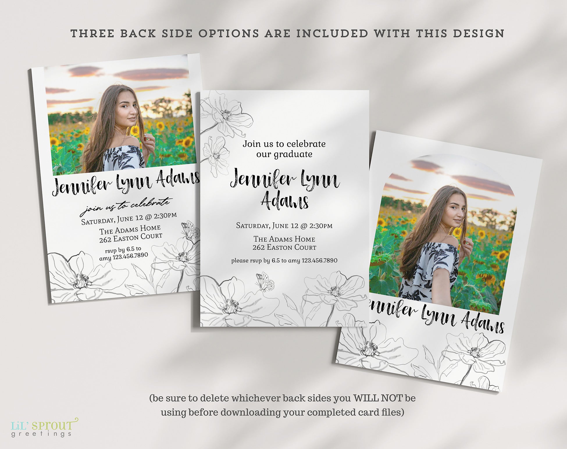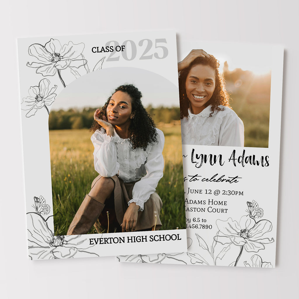 This floral graduation announcement template is a modern minimalist style card with a simple black and white color scheme. The front side is in a grad announcement format with an arch photo and the back side is available in four different options. Choose from a text only grad party invite, photo only, or photo and party details, or for the back. The background color is editable on this grad template.