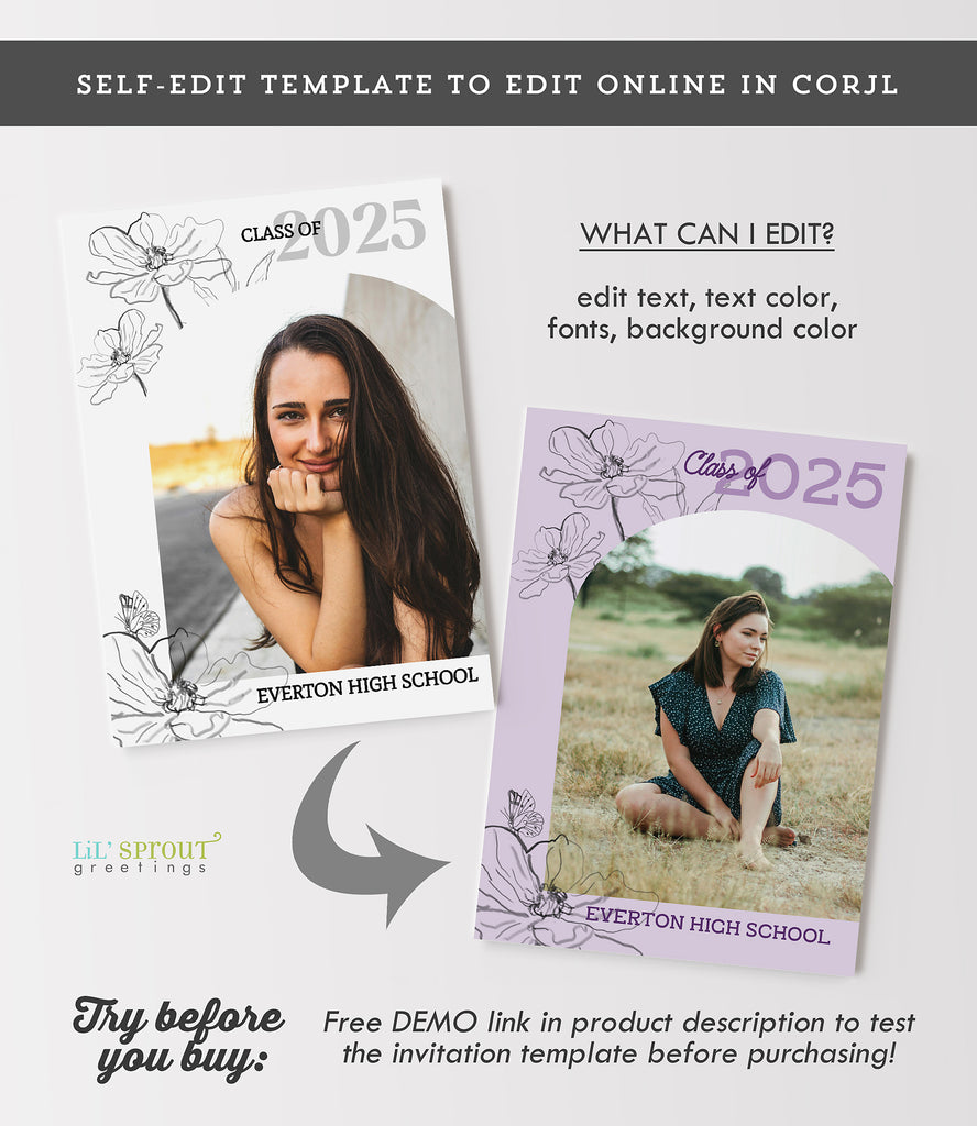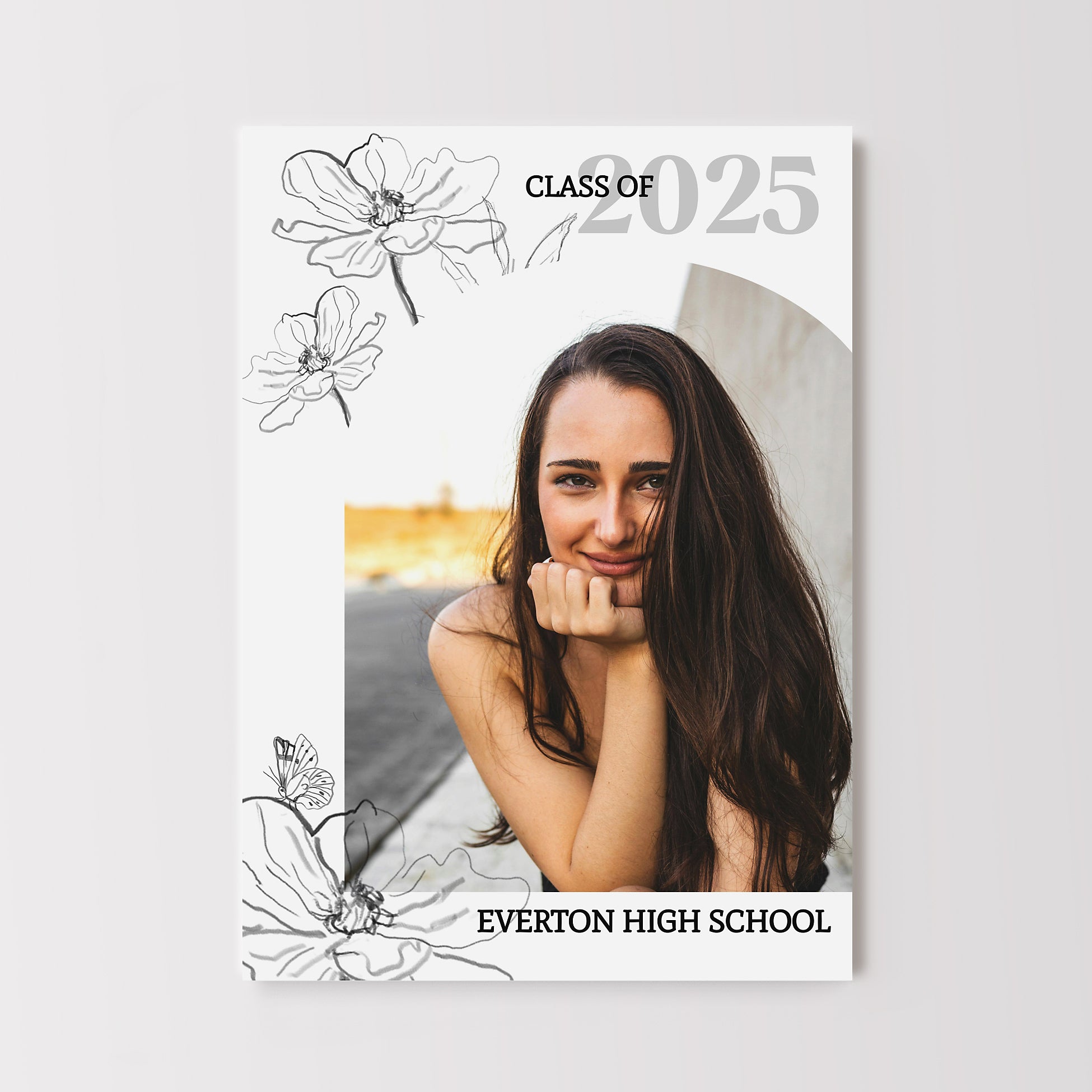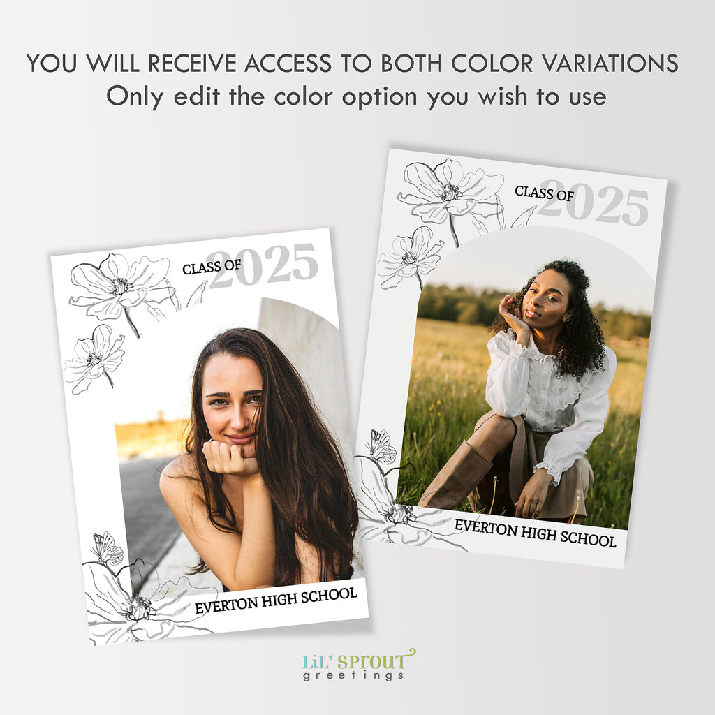 This floral graduation announcement template is a modern minimalist style card with a simple black and white color scheme. The front side is in a grad announcement format with an arch photo and the back side is available in four different options. Choose from a text only grad party invite, photo only, or photo and party details, or for the back. The background color is editable on this grad template.