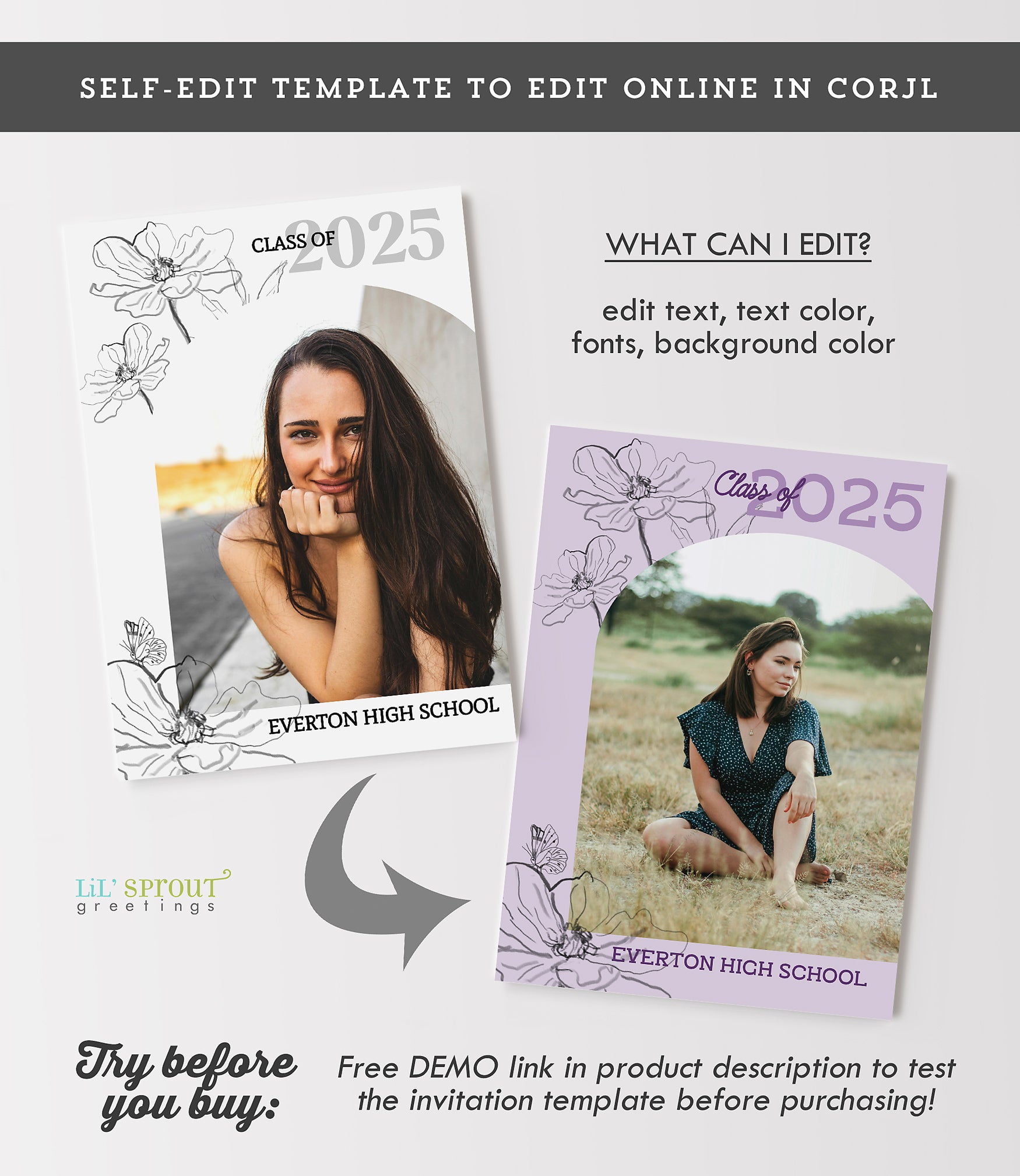 Our invitation templates are formatted for editing on Corjl, an in-browser template editor that allows you to login, add your text and photos to your card template and download the completed files. No software or experience is necessary. Edit from a computer or a mobile device. Use your completed files to print your invitation or send it digitally.