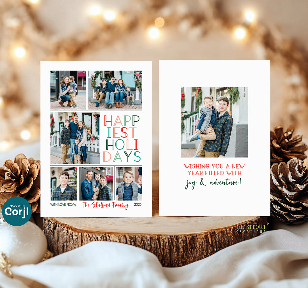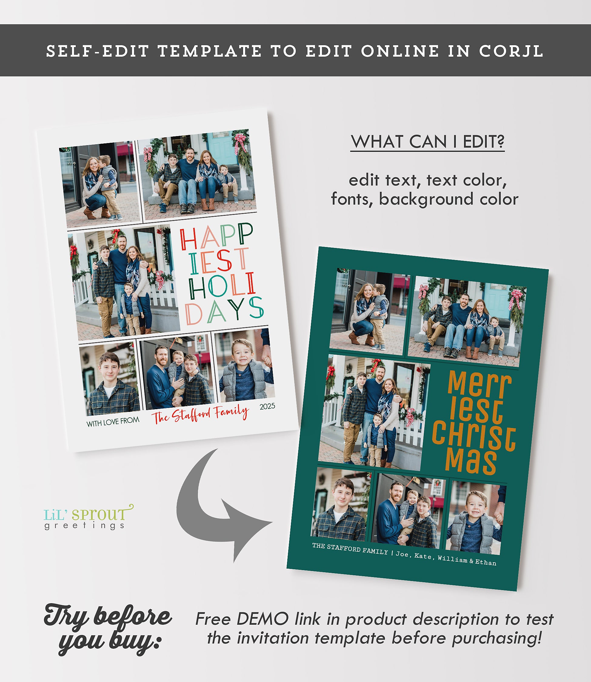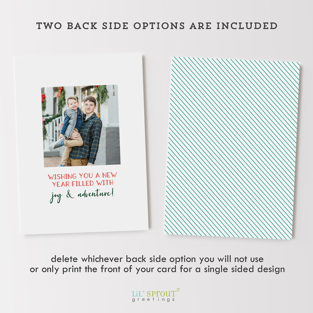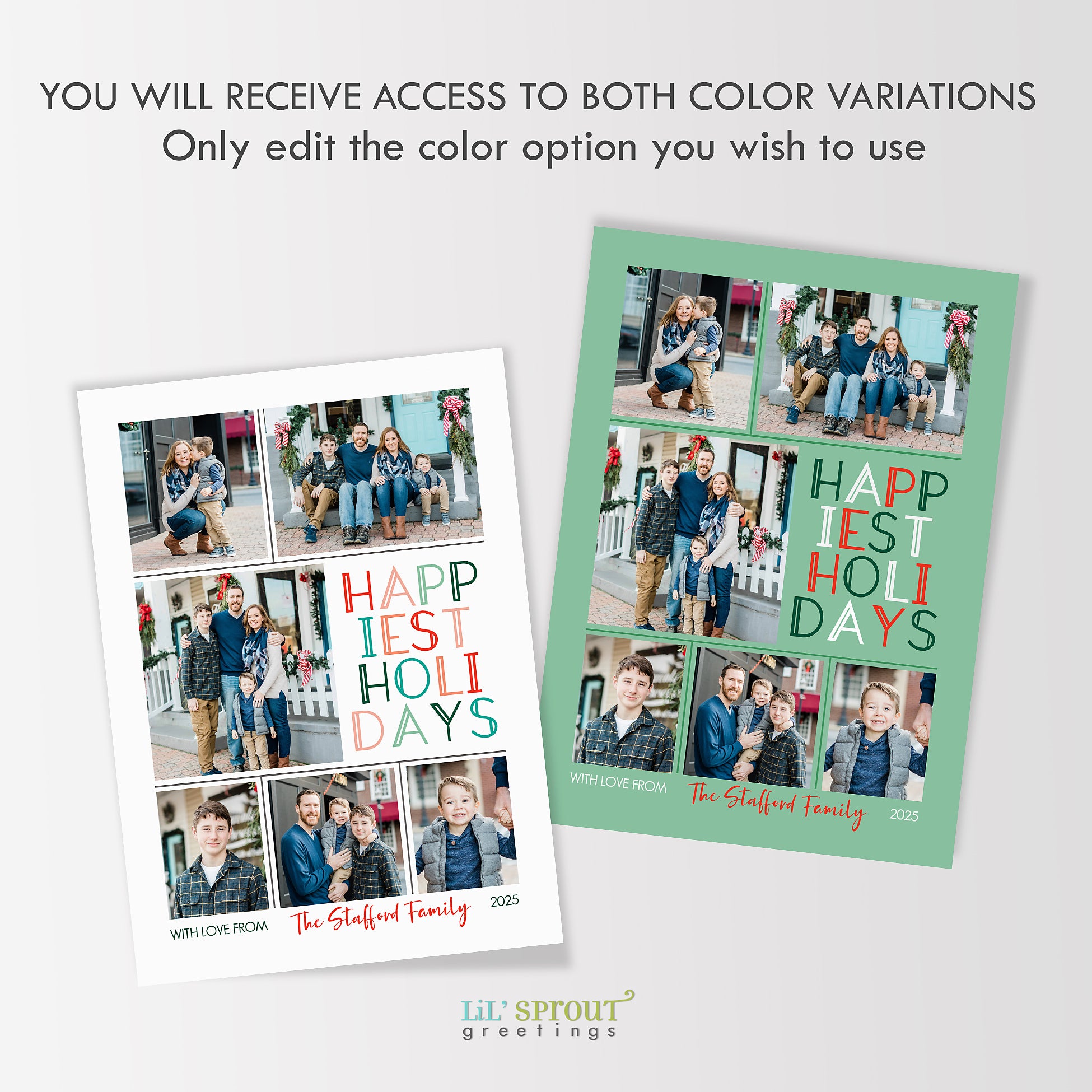 This multiple photo holiday card features 6 photos in a grid format with colorful text. Choose from one of our 2 color choices or customize the colors when editing your template online in Corjl. Change the text to make this a new years card! Two back side options are also included: one allows you to add an additional photo and ample room for text, the other is a simple striped pattern.