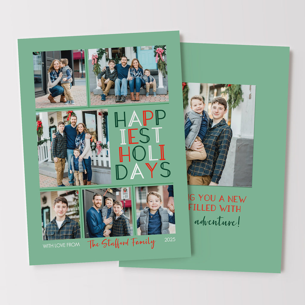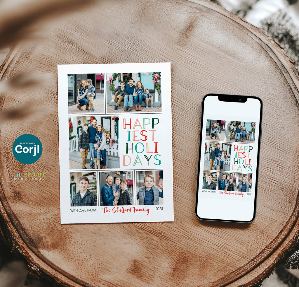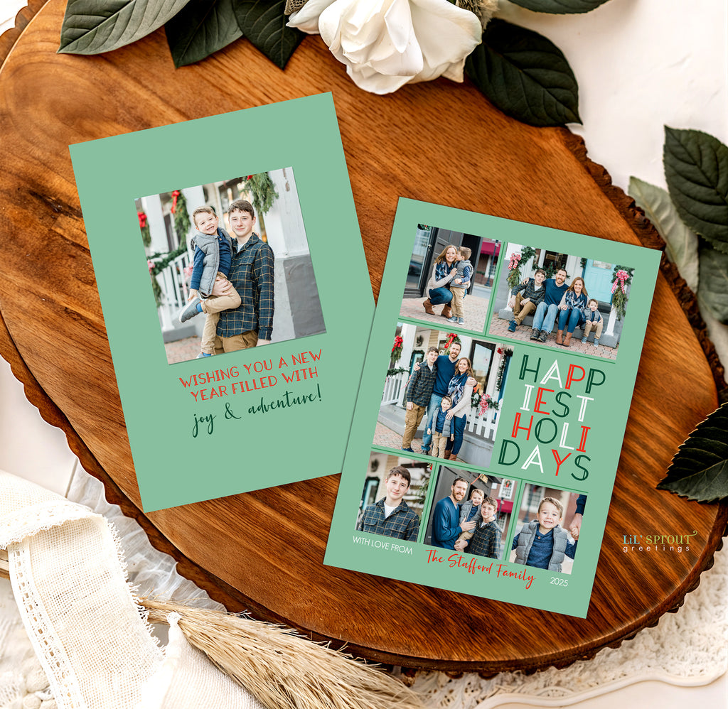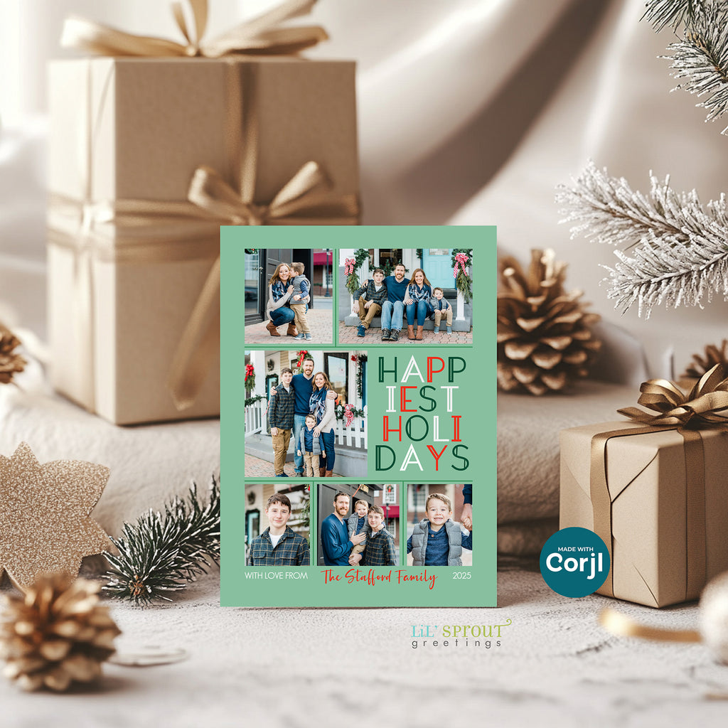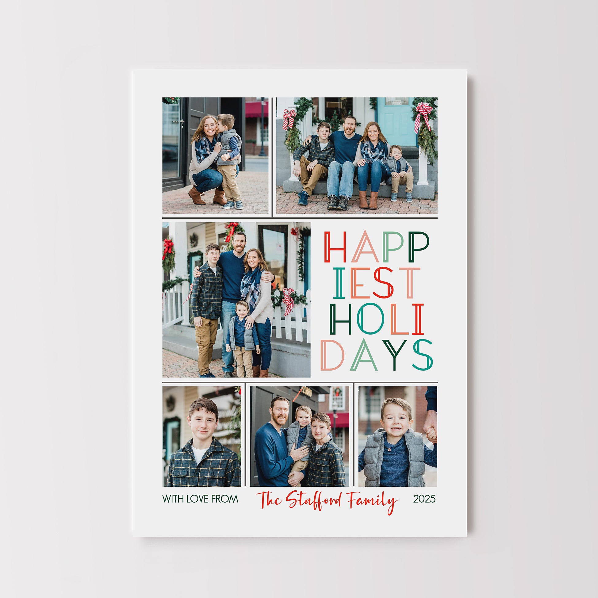 This multiple photo holiday card features 6 photos in a grid format with colorful text. Choose from one of our 2 color choices or customize the colors when editing your template online in Corjl. Change the text to make this a new years card! Two back side options are also included: one allows you to add an additional photo and ample room for text, the other is a simple striped pattern.