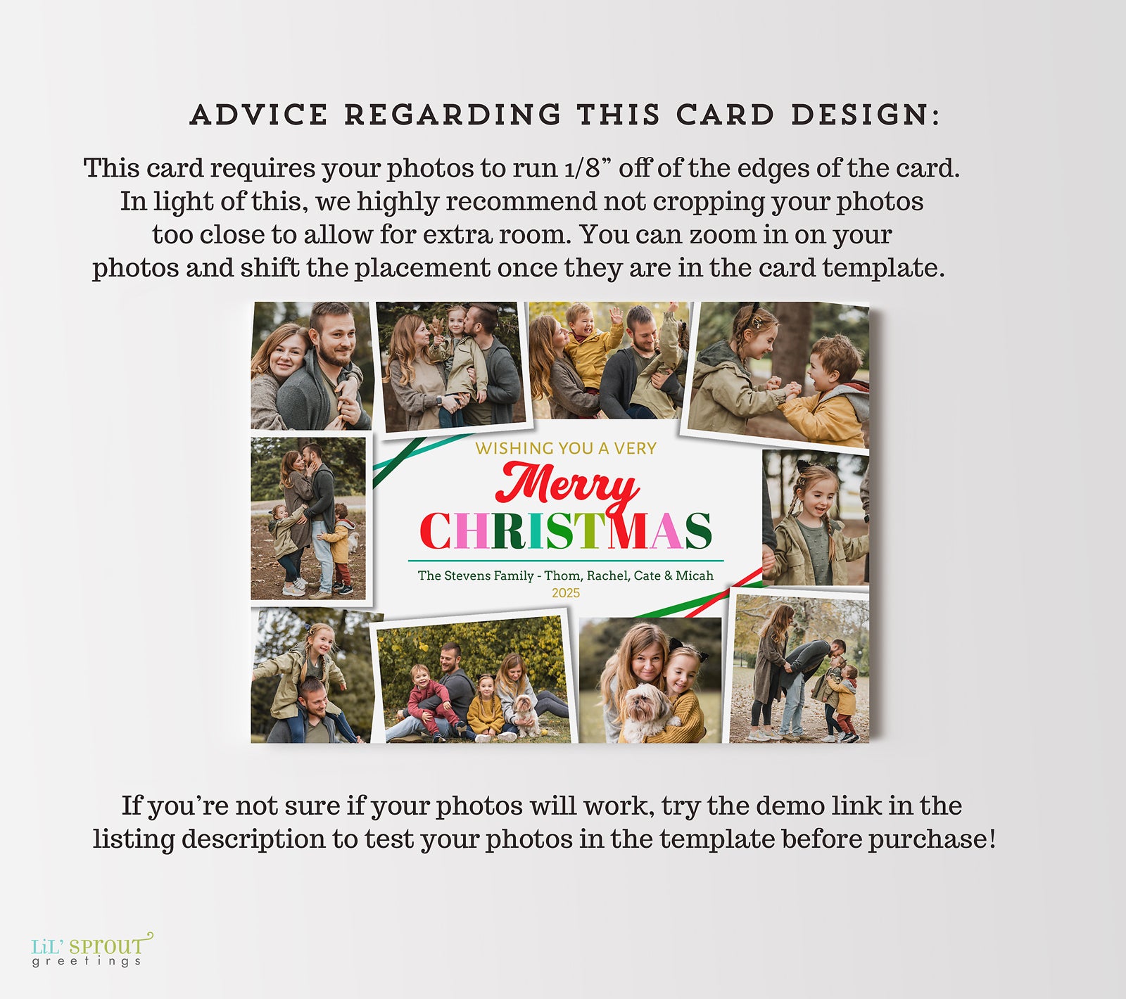 A note about this card design: the photos run 1/8" off the edge of the card to give the "border-free" appearance. Due to this it is best to not crop your photos very close and to allow extra space for the cropping. You can zoom in and shift your photos once they are in place on the template.