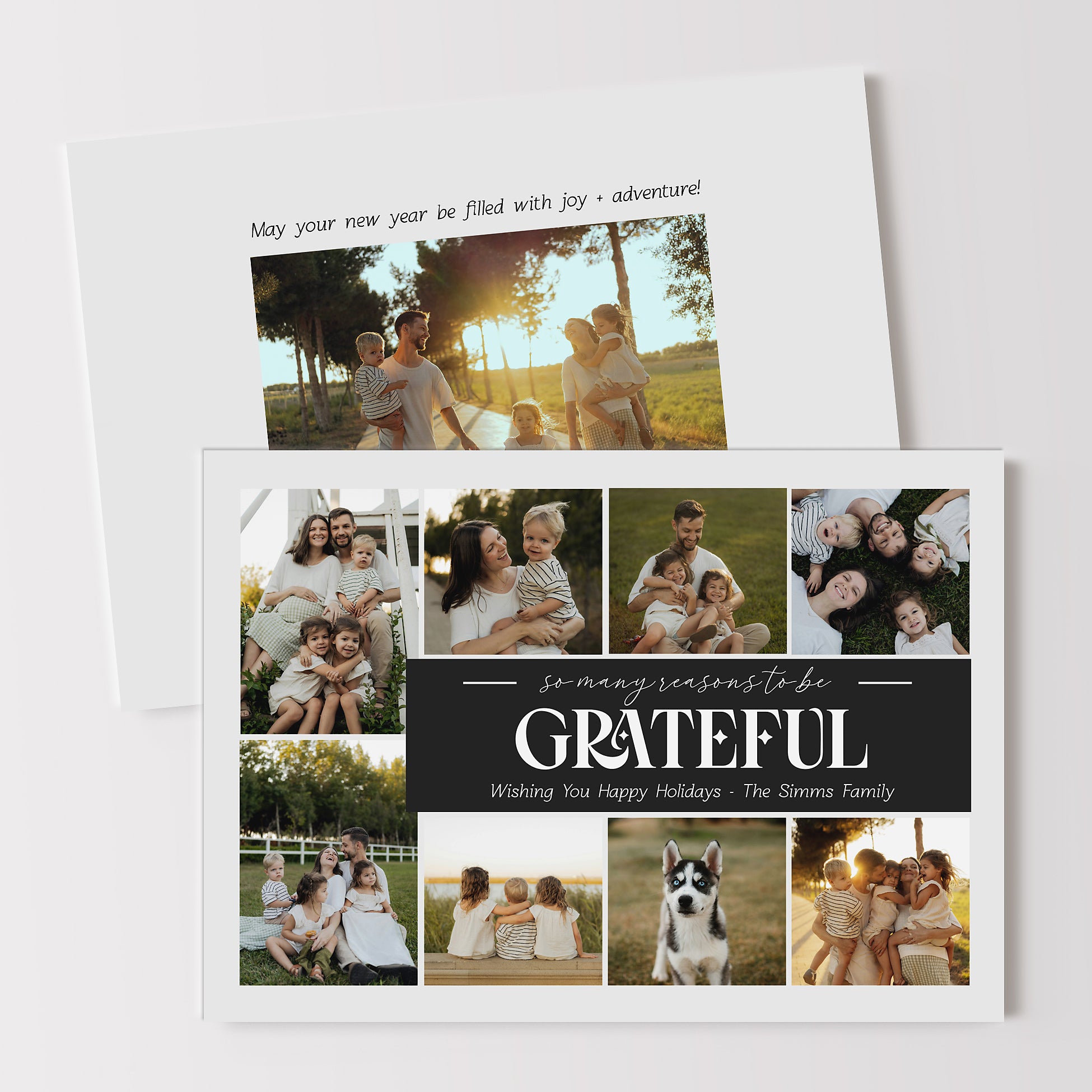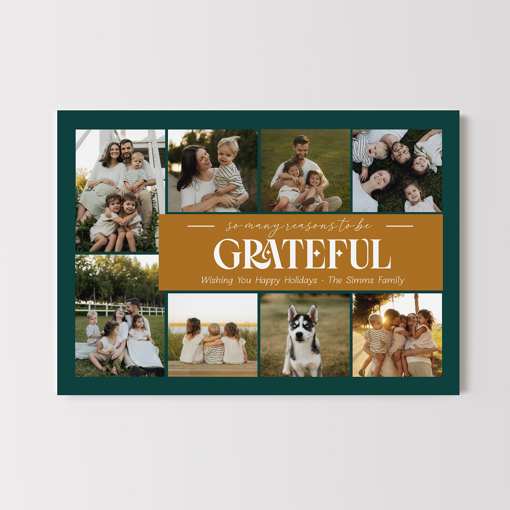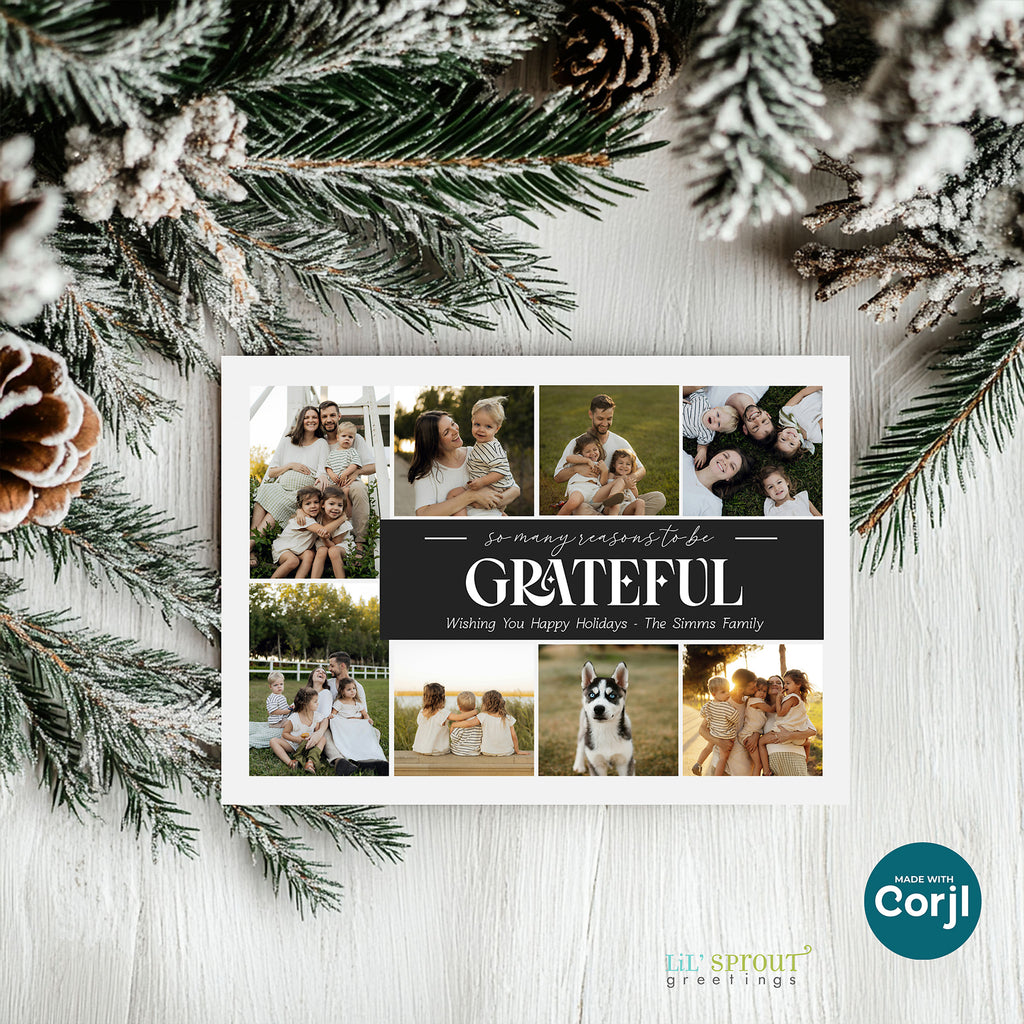 This multiple photo holiday card template lets your share 8 photos of your "reasons to be grateful". Choose from one of our three color options or completely personalize this card template online in Corjl. Edit the colors, fonts and wording, add your photos and download the digital file to print your cards or send them via email or text.