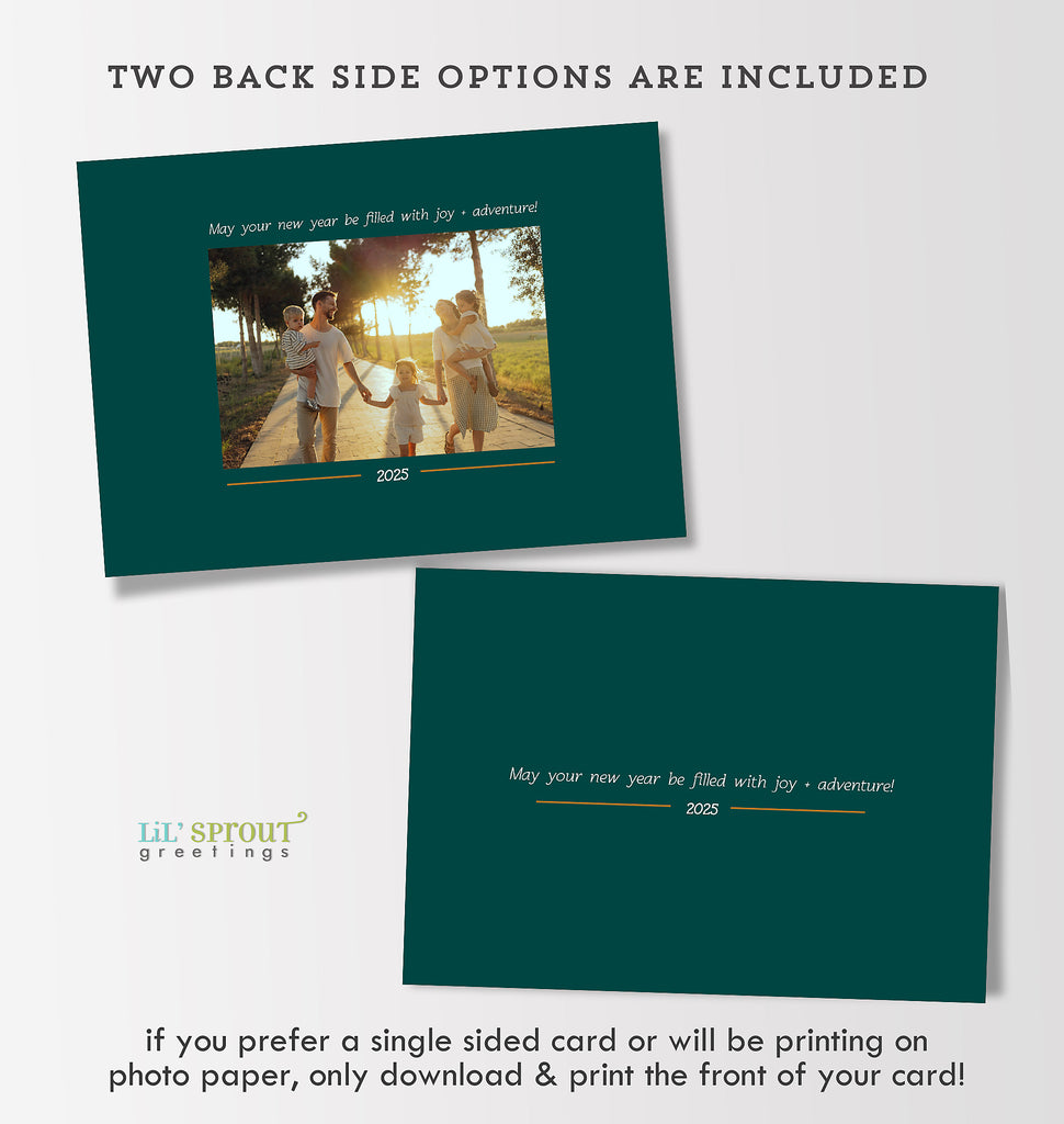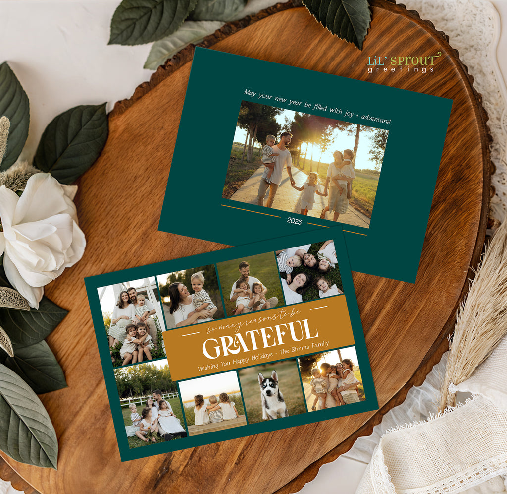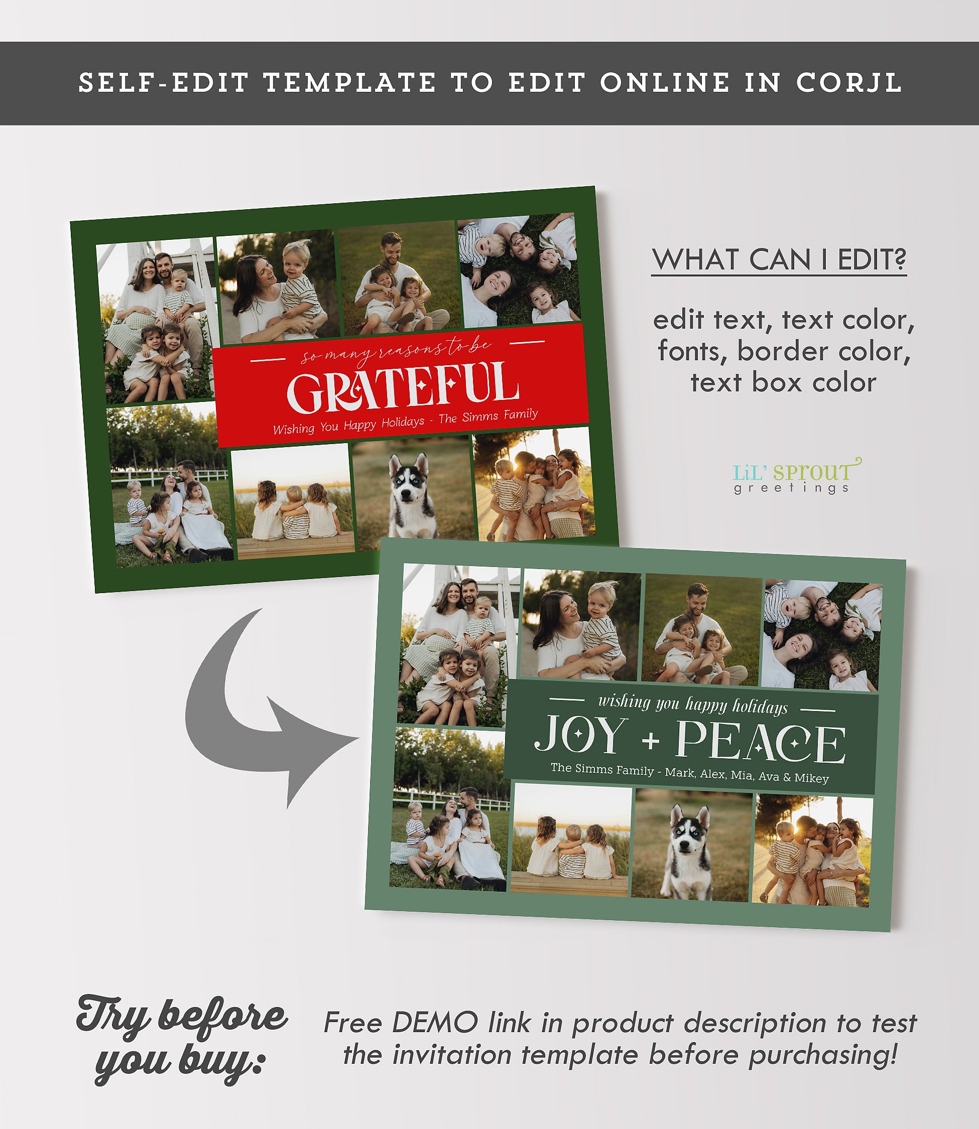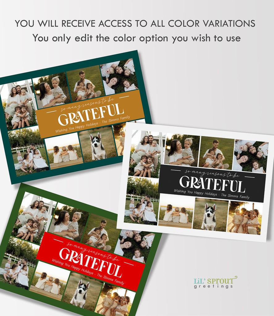 This multiple photo holiday card template lets your share 8 photos of your "reasons to be grateful". Choose from one of our three color options or completely personalize this card template online in Corjl. Edit the colors, fonts and wording, add your photos and download the digital file to print your cards or send them via email or text.