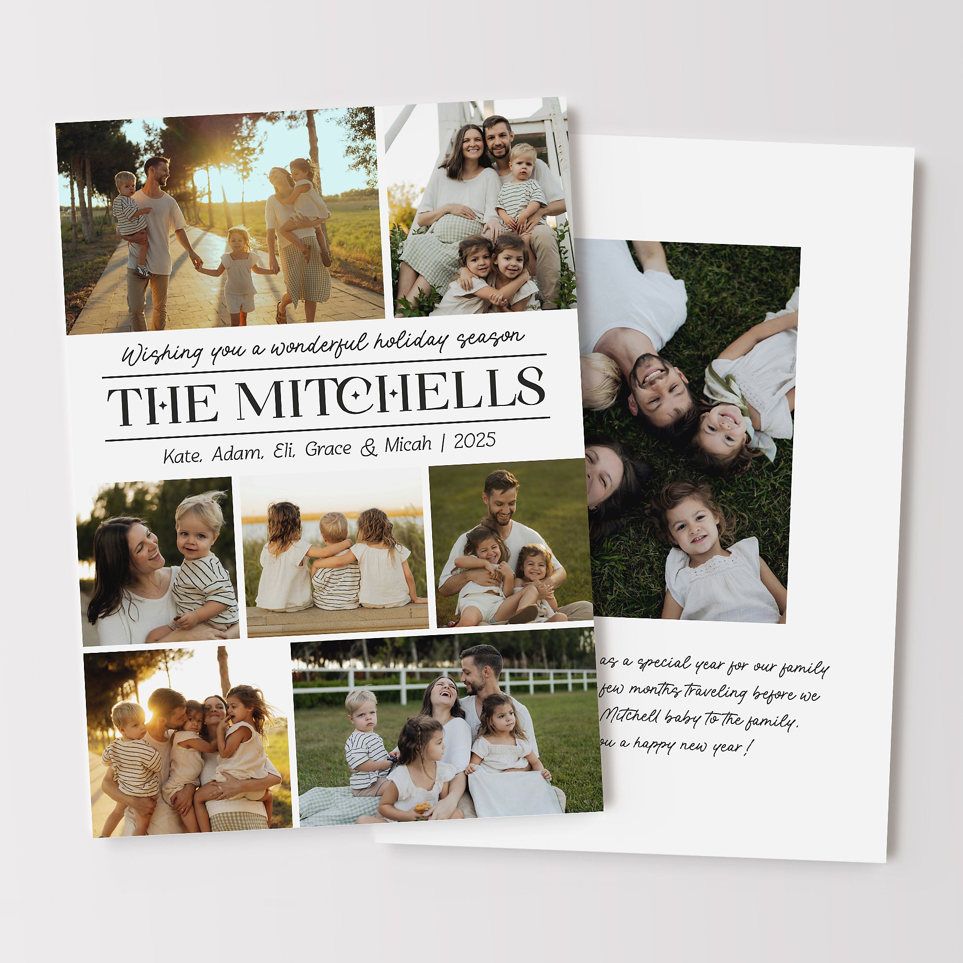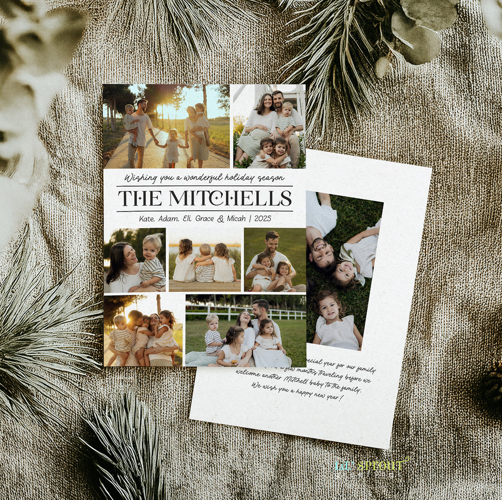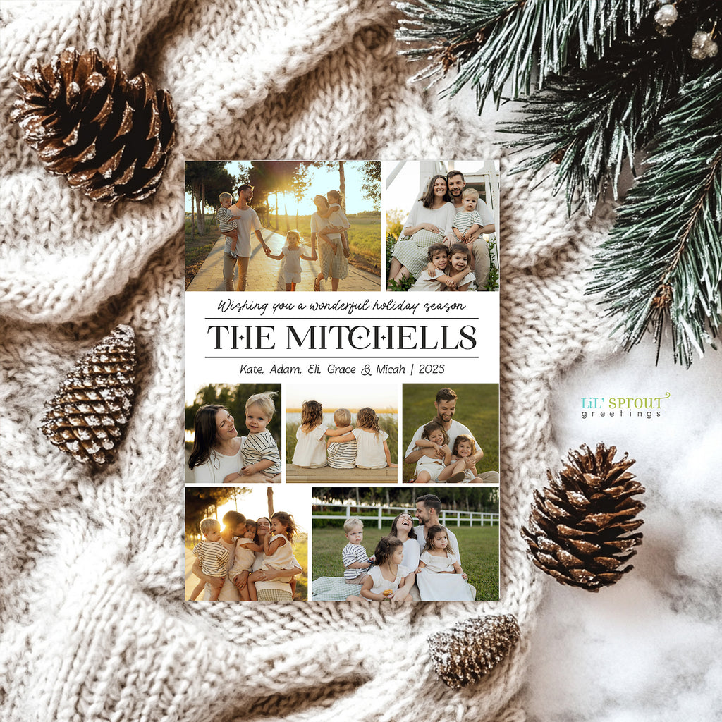 Modern holiday card design featuring 7 photos in a simple collage style on the front along with the family name. On the back side there is ample room to add a year in review or family update in several paragraphs of text. An additional photo may also be added to the back side.