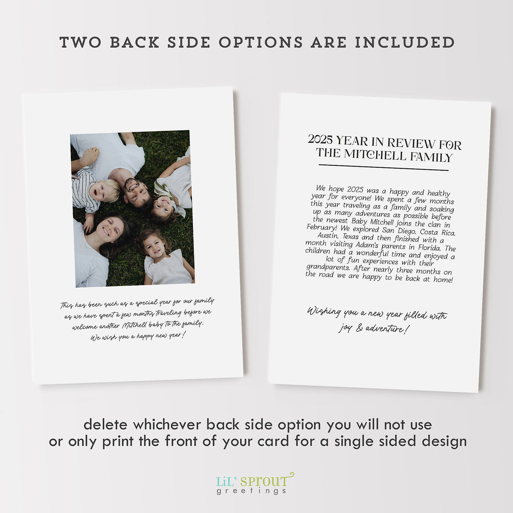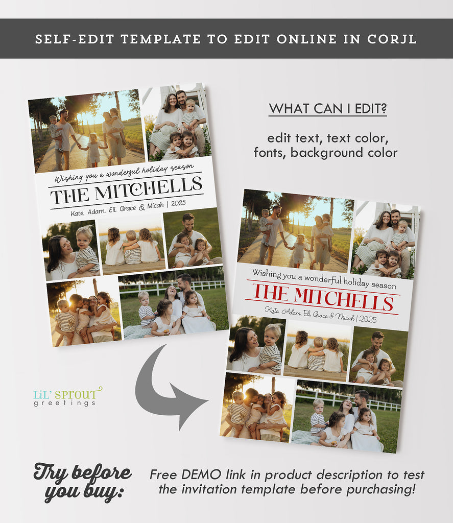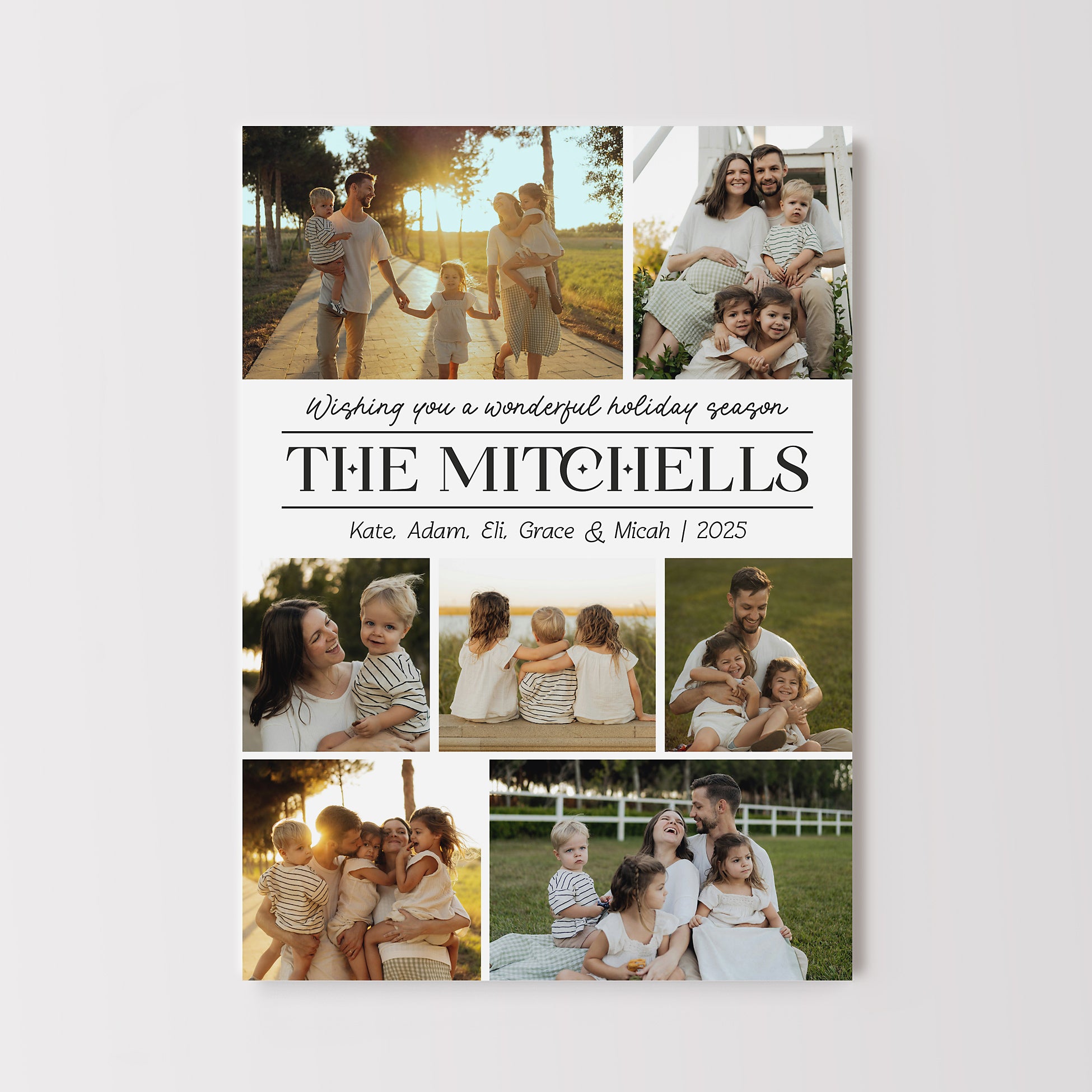 Modern holiday card design featuring 7 photos in a simple collage style on the front along with the family name. On the back side there is ample room to add a year in review or family update in several paragraphs of text. An additional photo may also be added to the back side.
