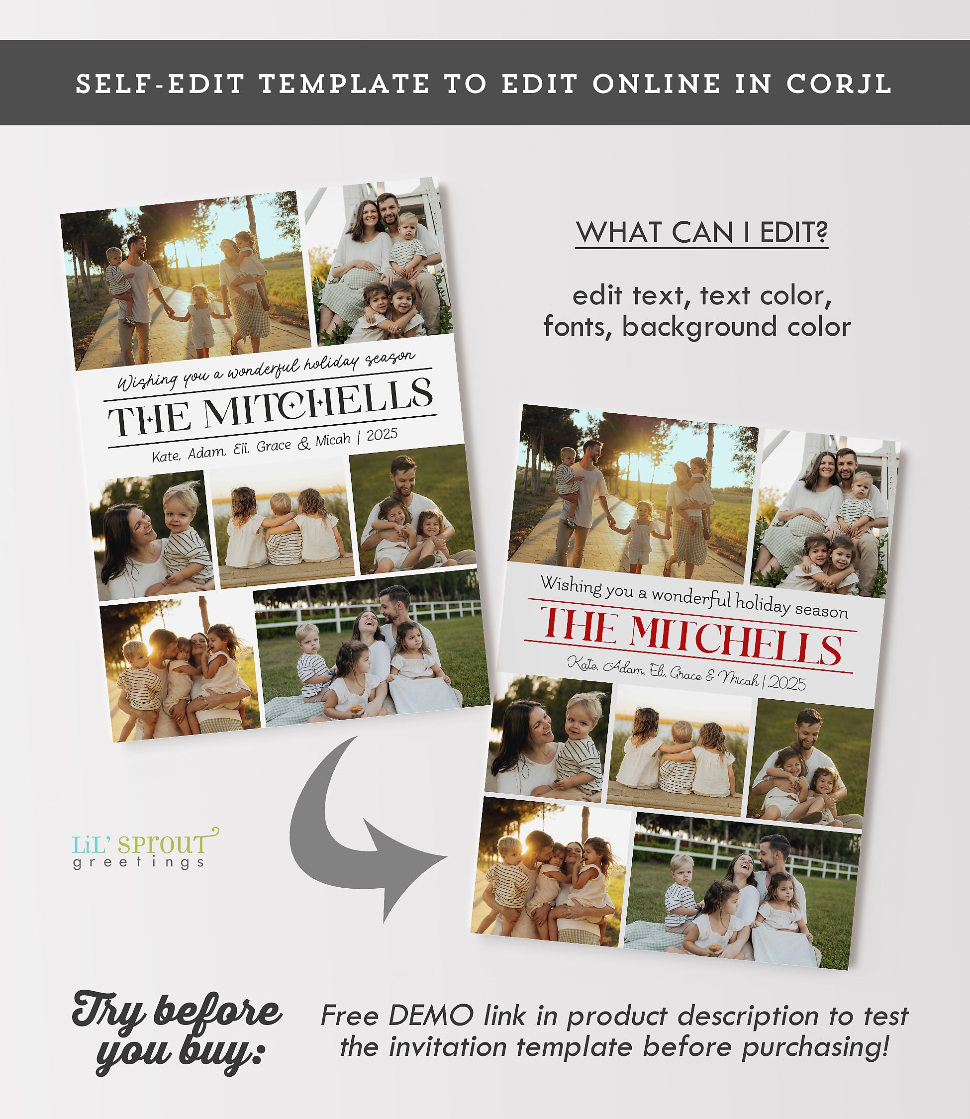 Our invitation templates are formatted for editing on Corjl, an in-browser template editor that allows you to login, add your text and photos to your card template and download the completed files. No software or experience is necessary. Edit from a computer or a mobile device. Use your completed files to print your invitation or send it digitally.