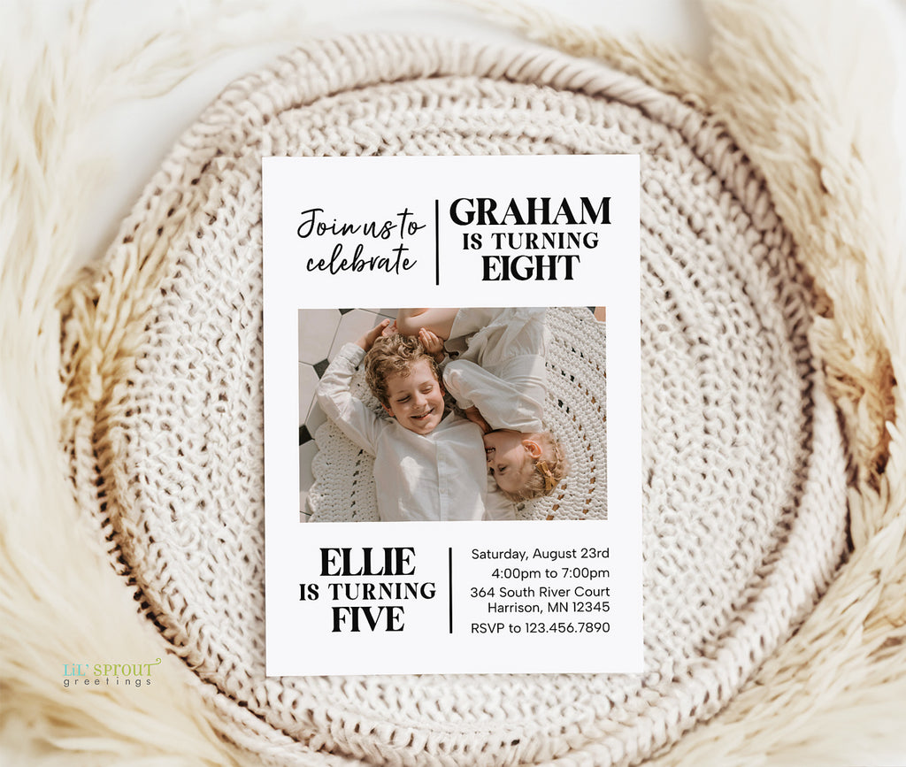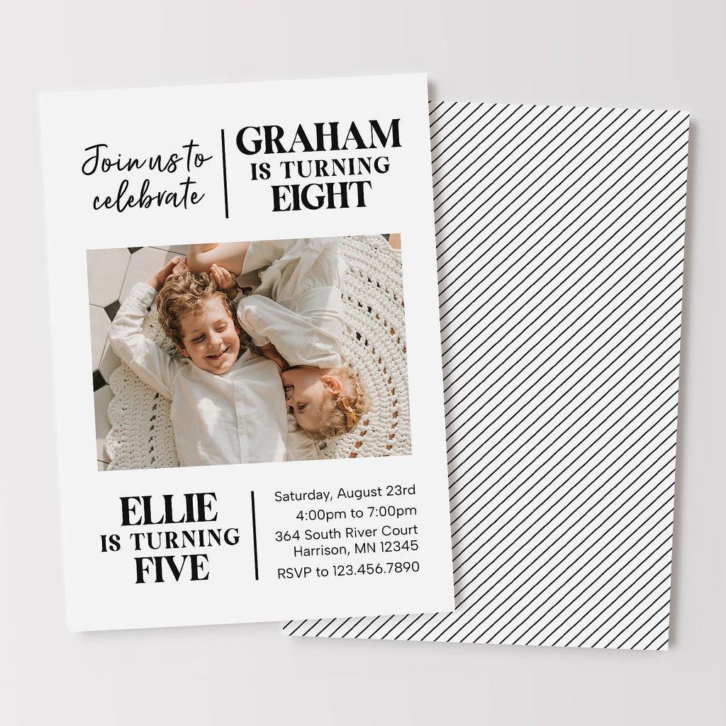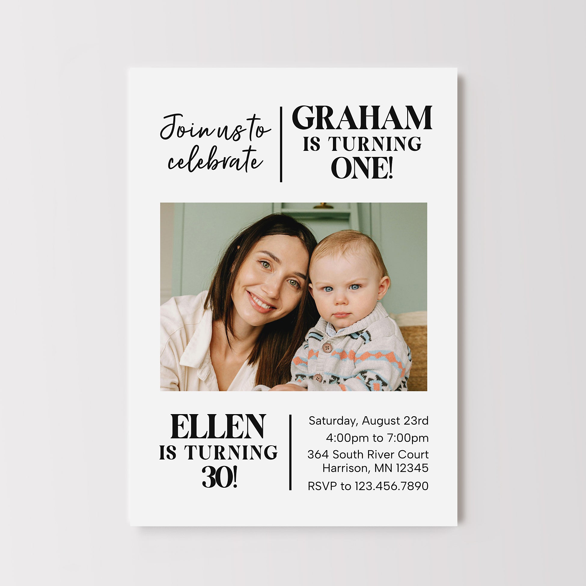 This simple joint birthday invitation template can be formatted for a parent and child party, two child party, or even two adult party. The modern minimalist design can suit any age, or edit the colors to add some fun.