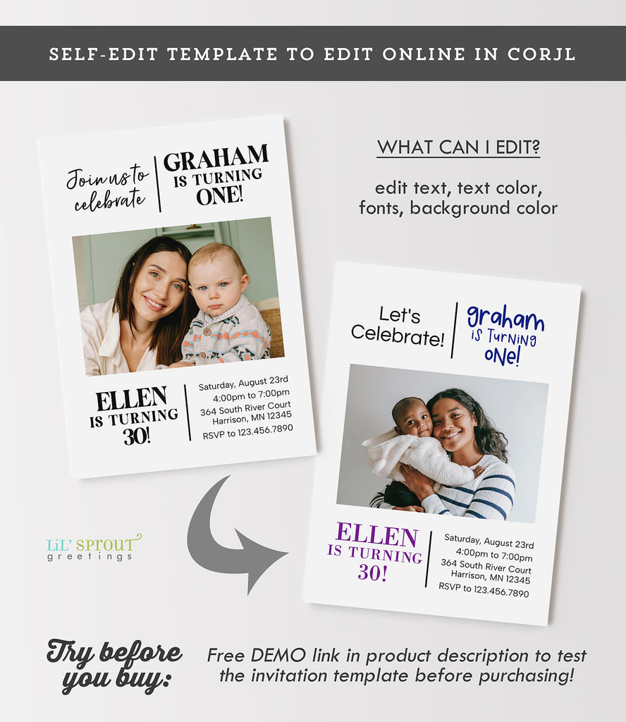 Our invitation templates are formatted for editing on Corjl, an in-browser template editor that allows you to login, add your text and photos to your card template and download the completed files. No software or experience is necessary. Edit from a computer or a mobile device. Use your completed files to print your invitation or send it digitally.