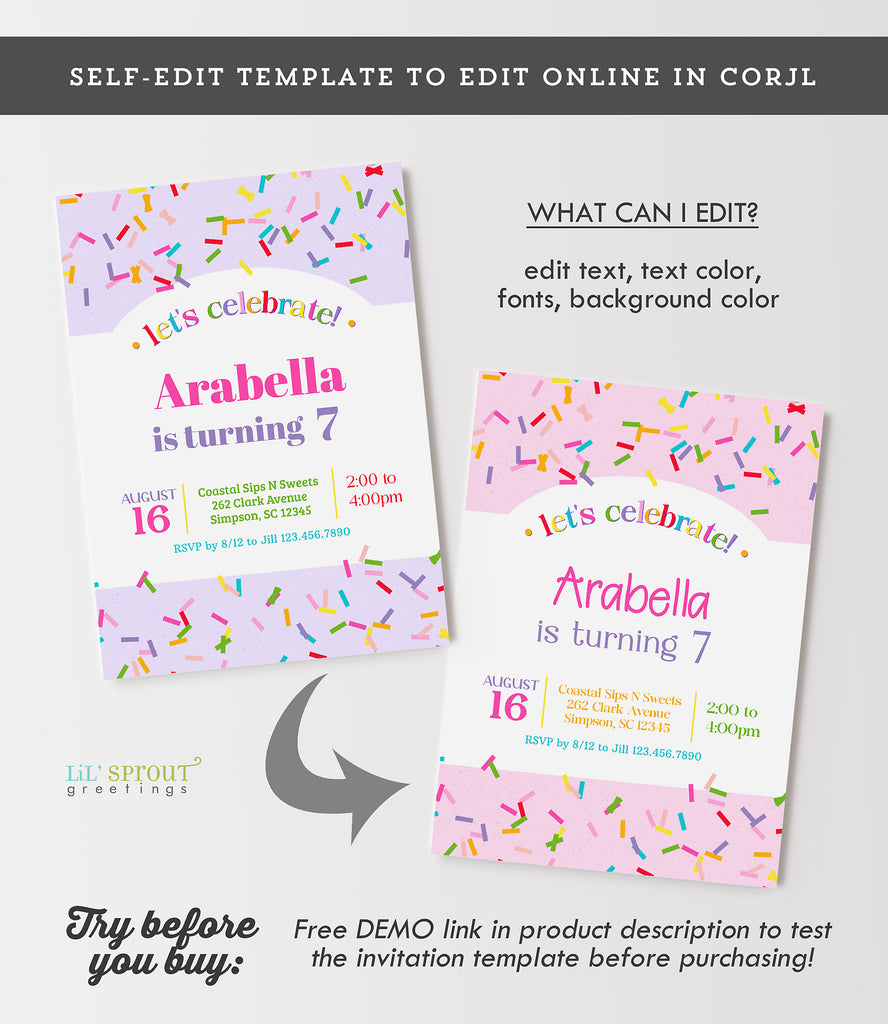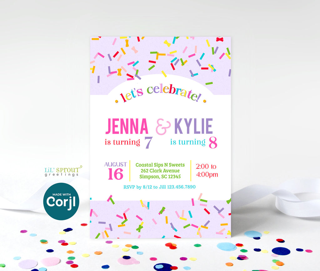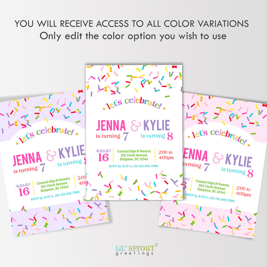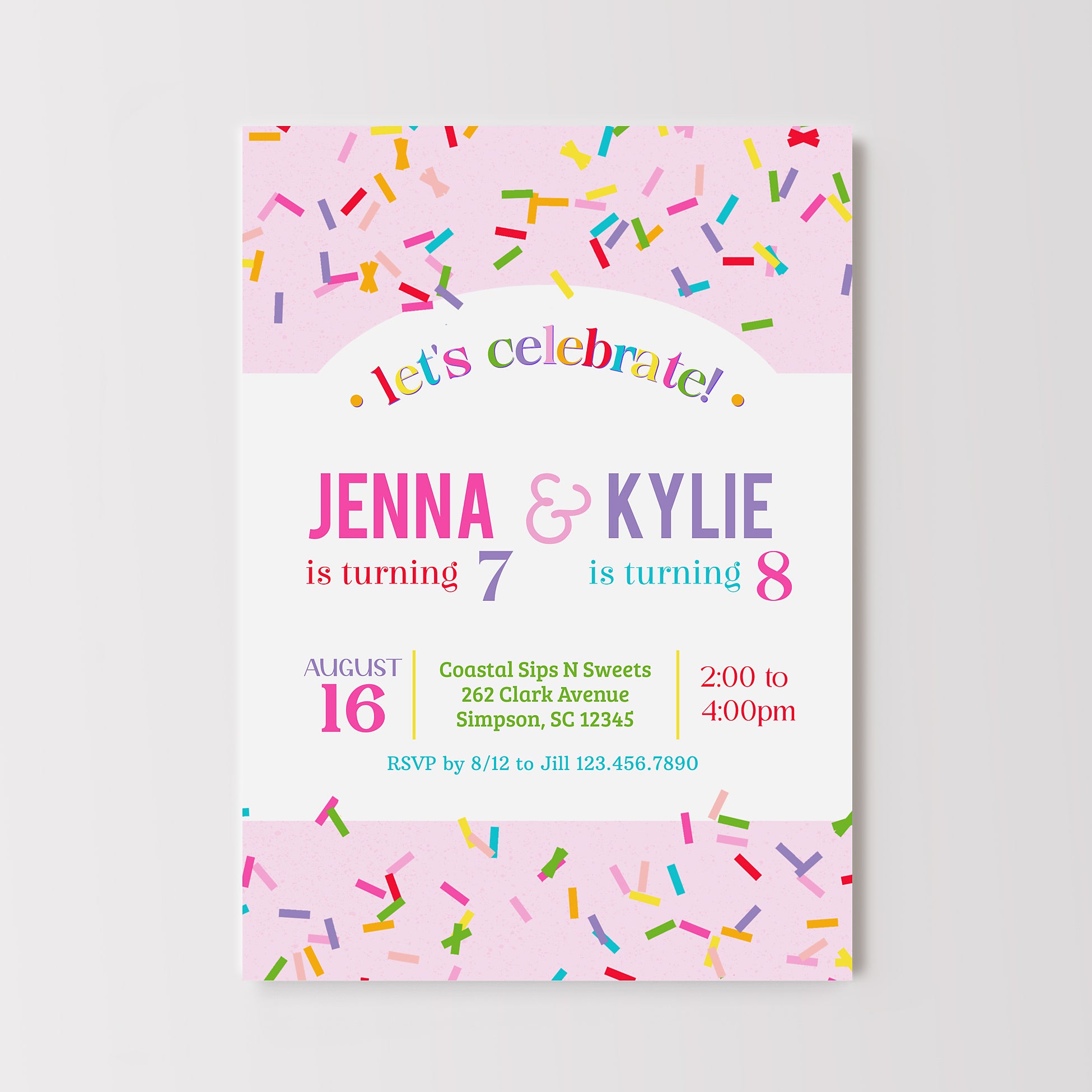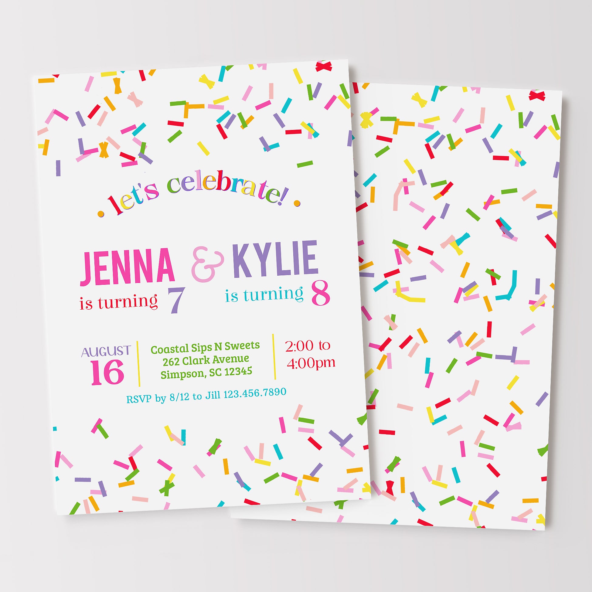 Fun, colorful double birthday invitation for 2 girls or sisters sharing a celebration. The rainbow sprinkles on this invite work great on a white, pink or purple background or choose your own background color.
