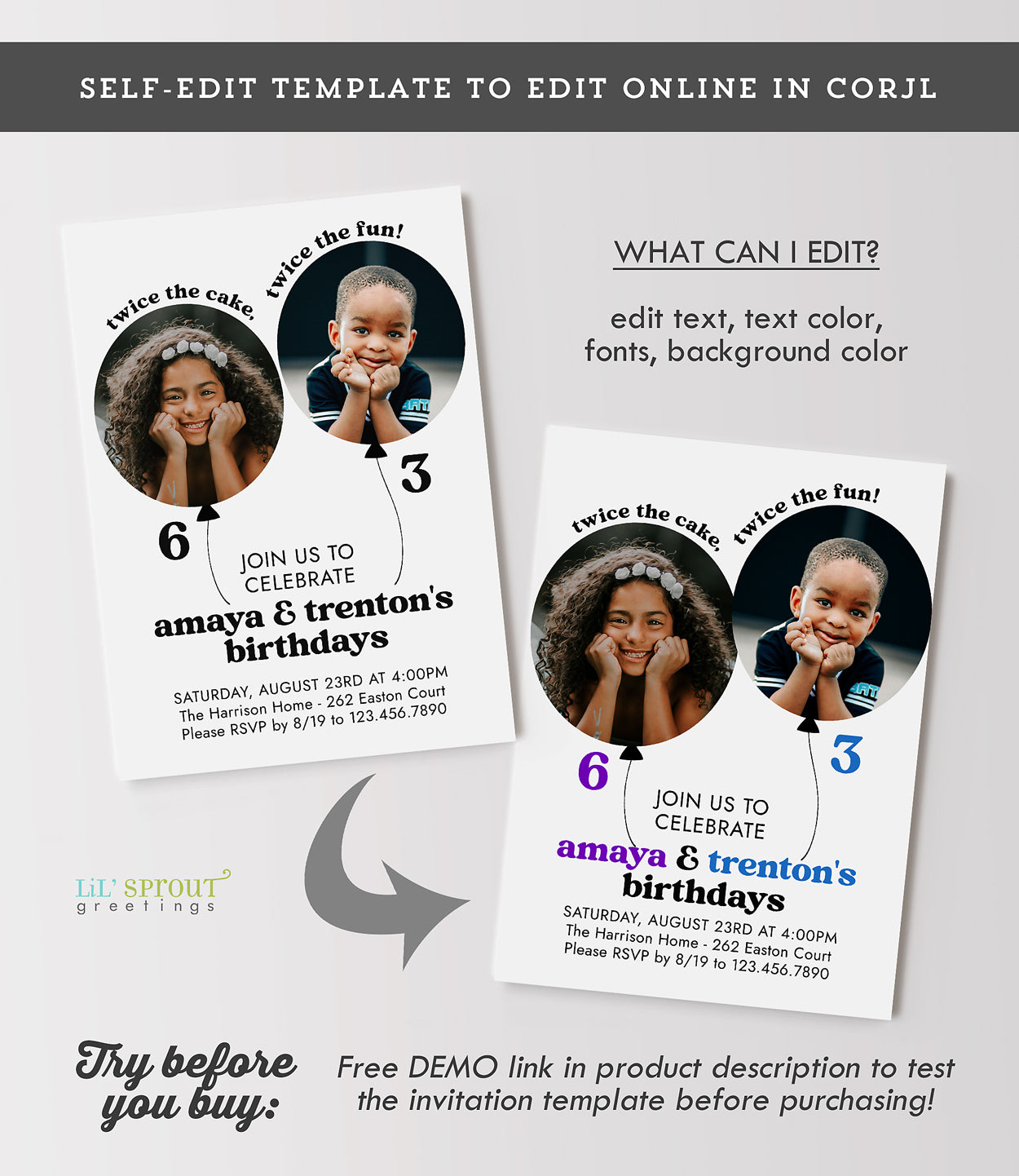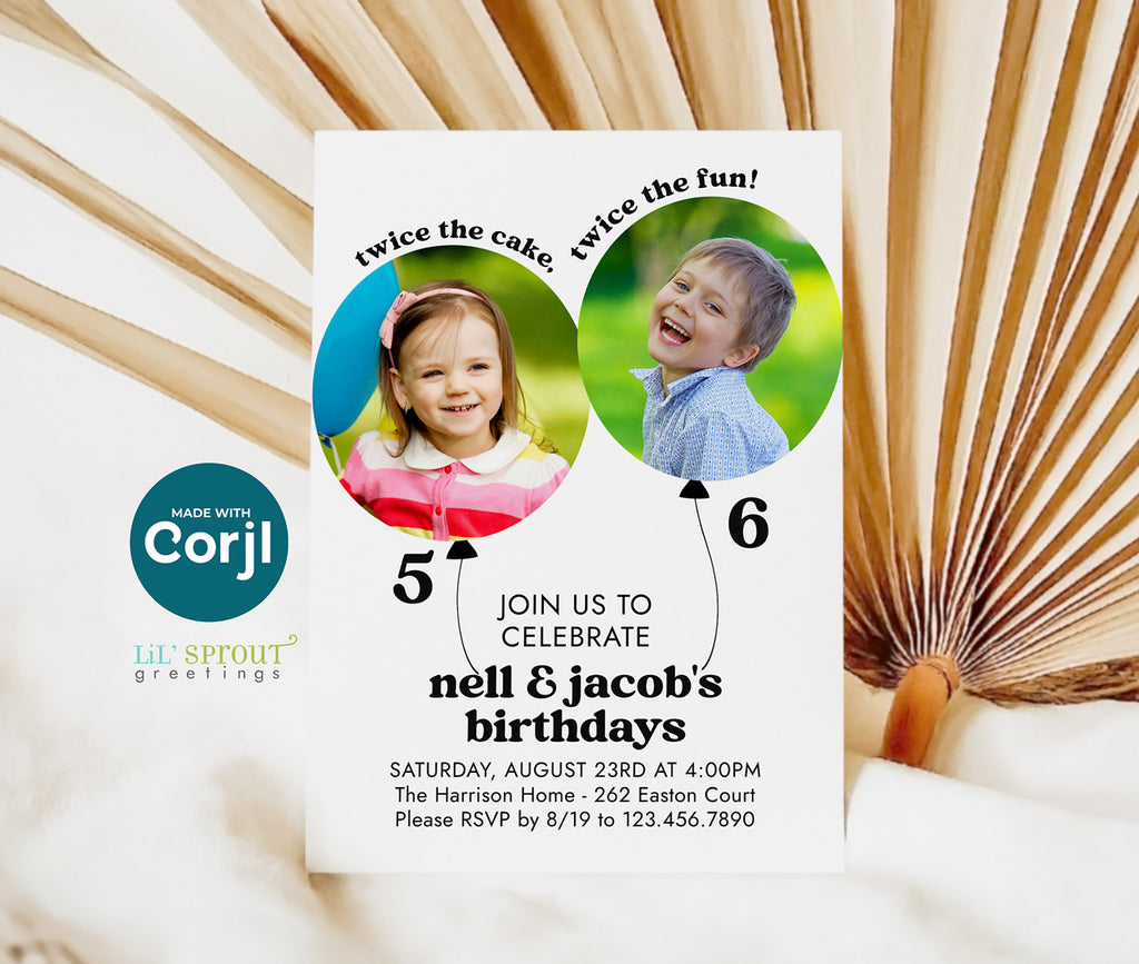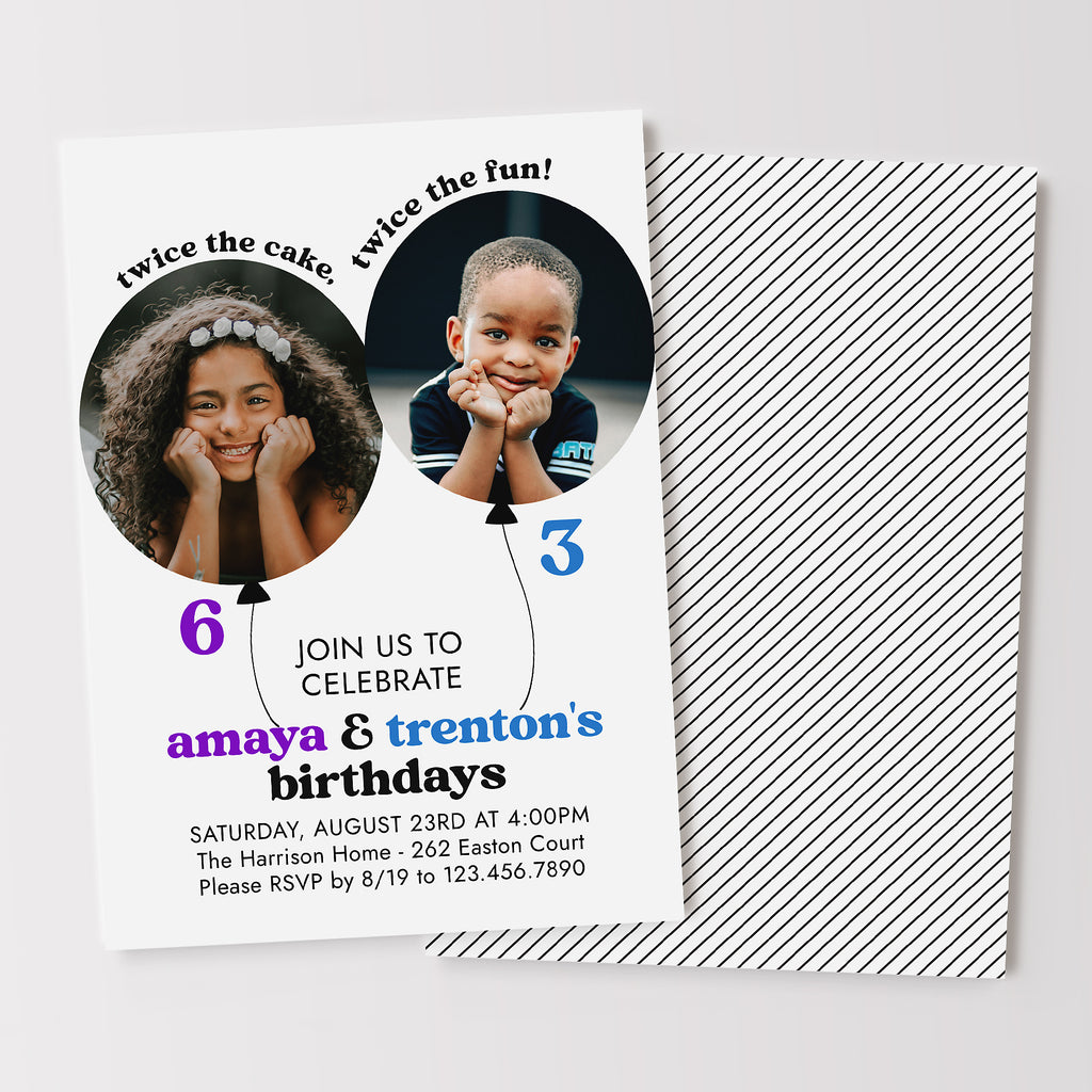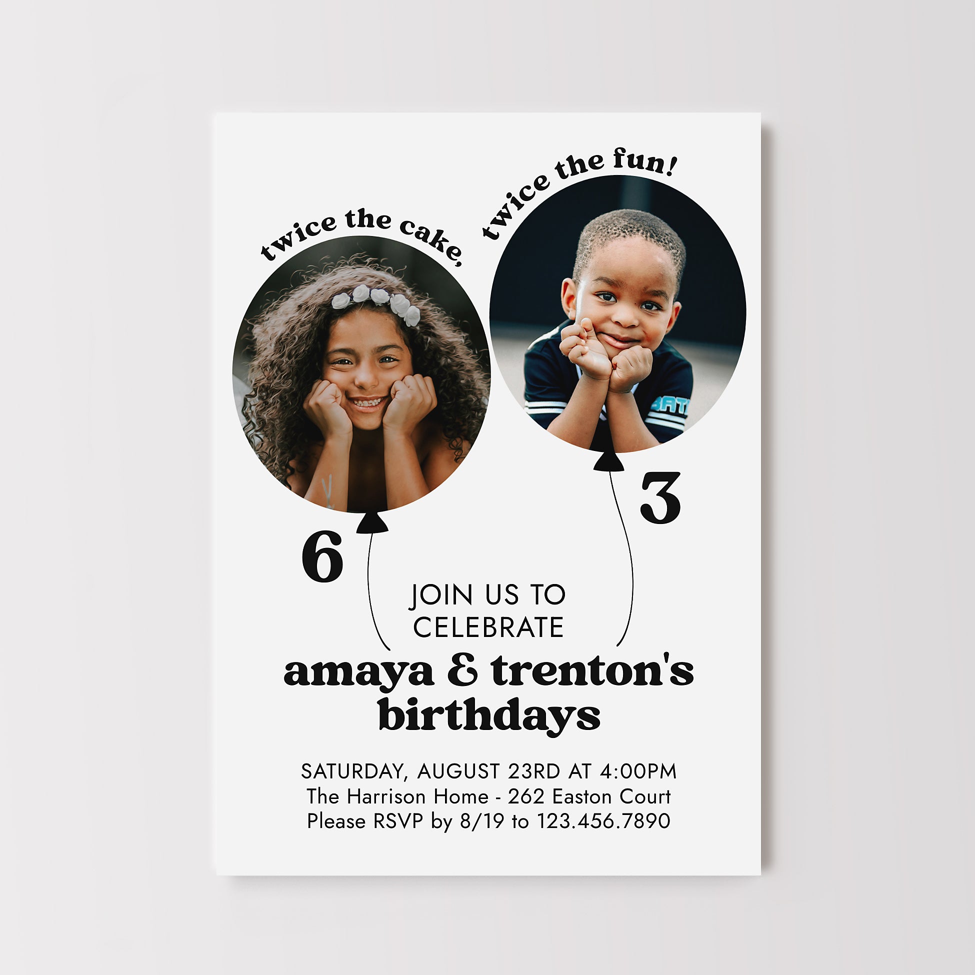 Simple, modern dual birthday invitation template with balloon shaped photo spaces. This black and white template can be personalized by adding color to the text and changing the fonts.