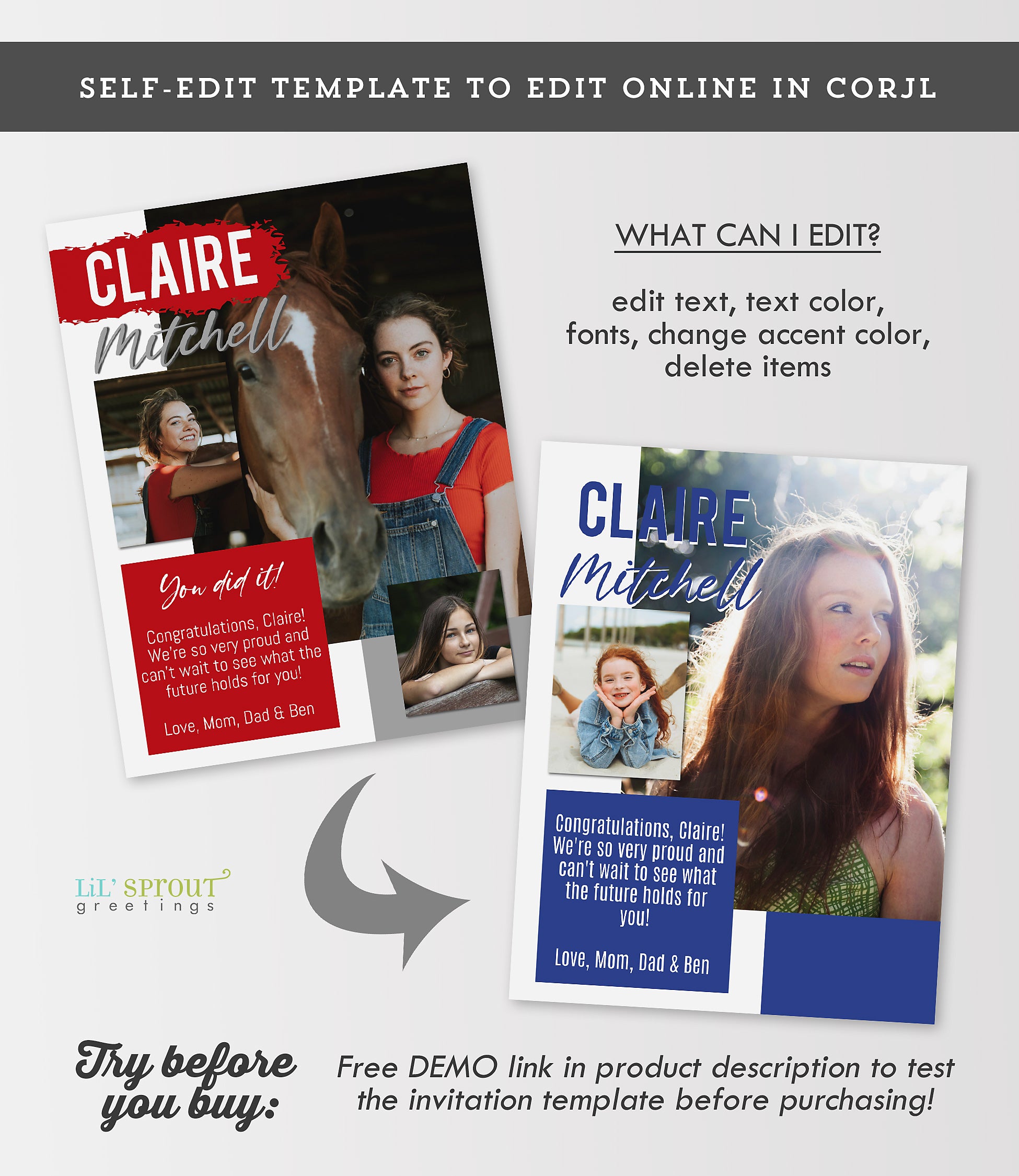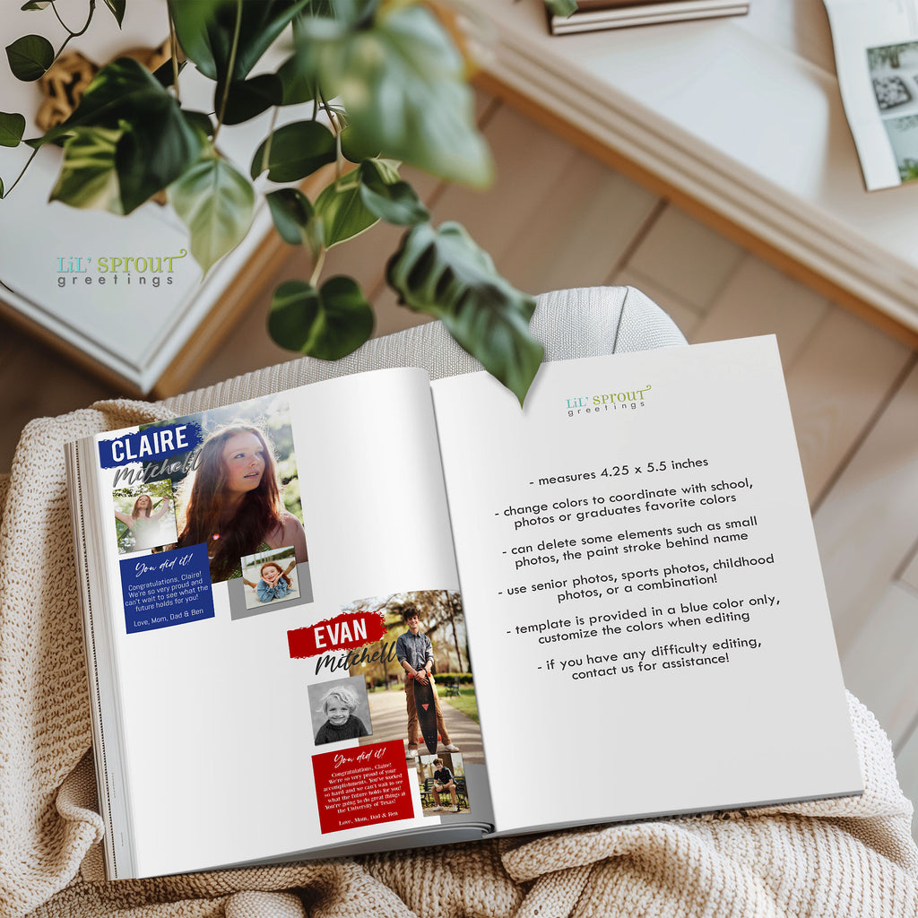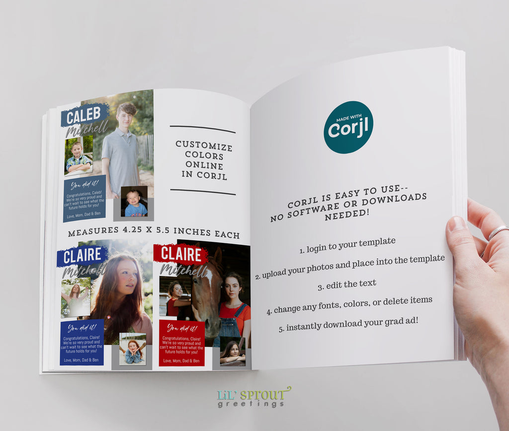 This yearbook ad template is for editing online in Corjl (no software needed). Simply login, add your photos, edit the text and colors and instantly download your completed senior ad to send to the yearbook company!