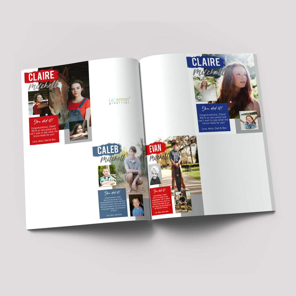 Modern style quarter page senior yearbook ad. Include a photo of your graduate along with two smaller photos. Use sports photos, current photos, or childhood photos. Colors can be edited in Corjl to match school colors, photos or even just the graduates favorite colors. Make their yearbook ad memorable!