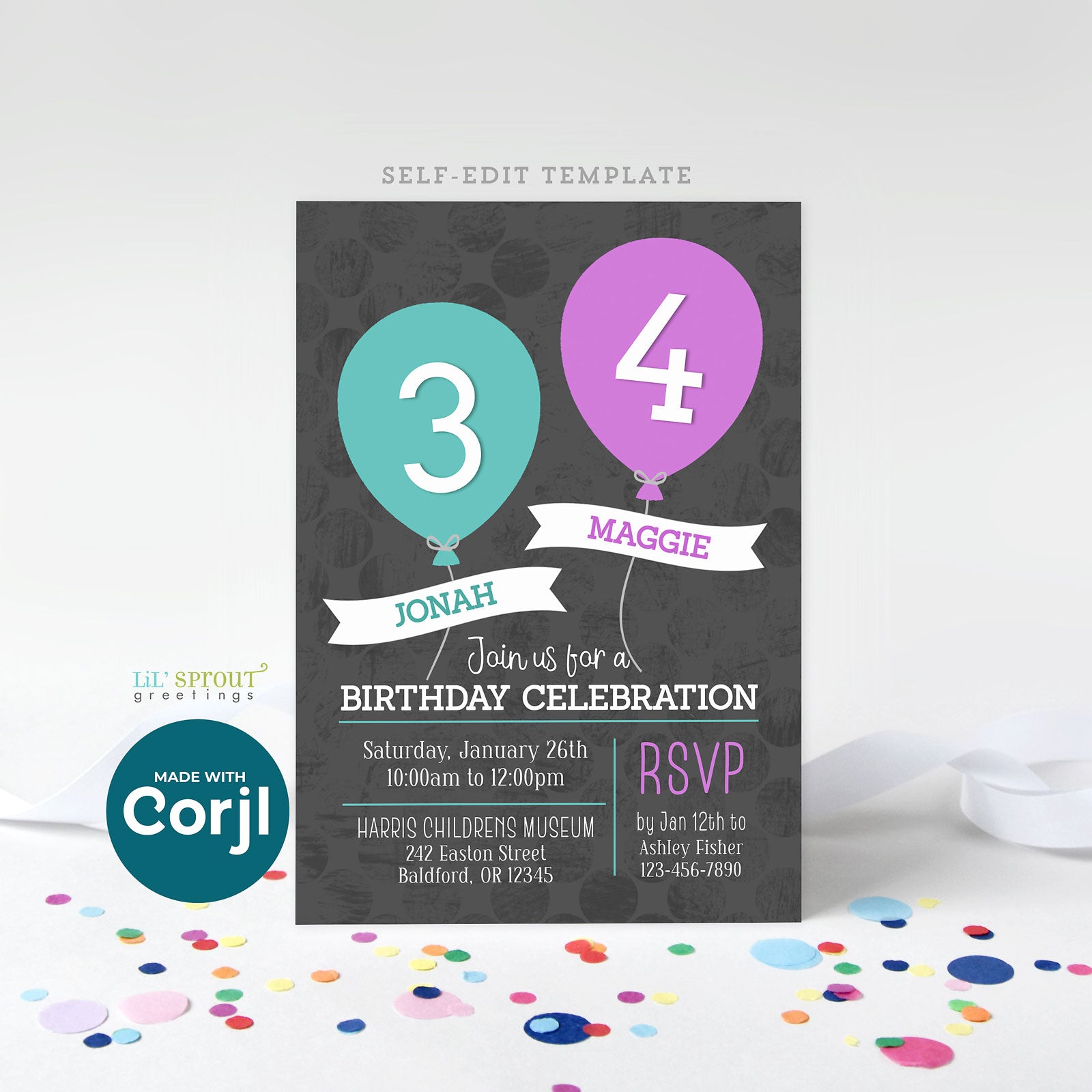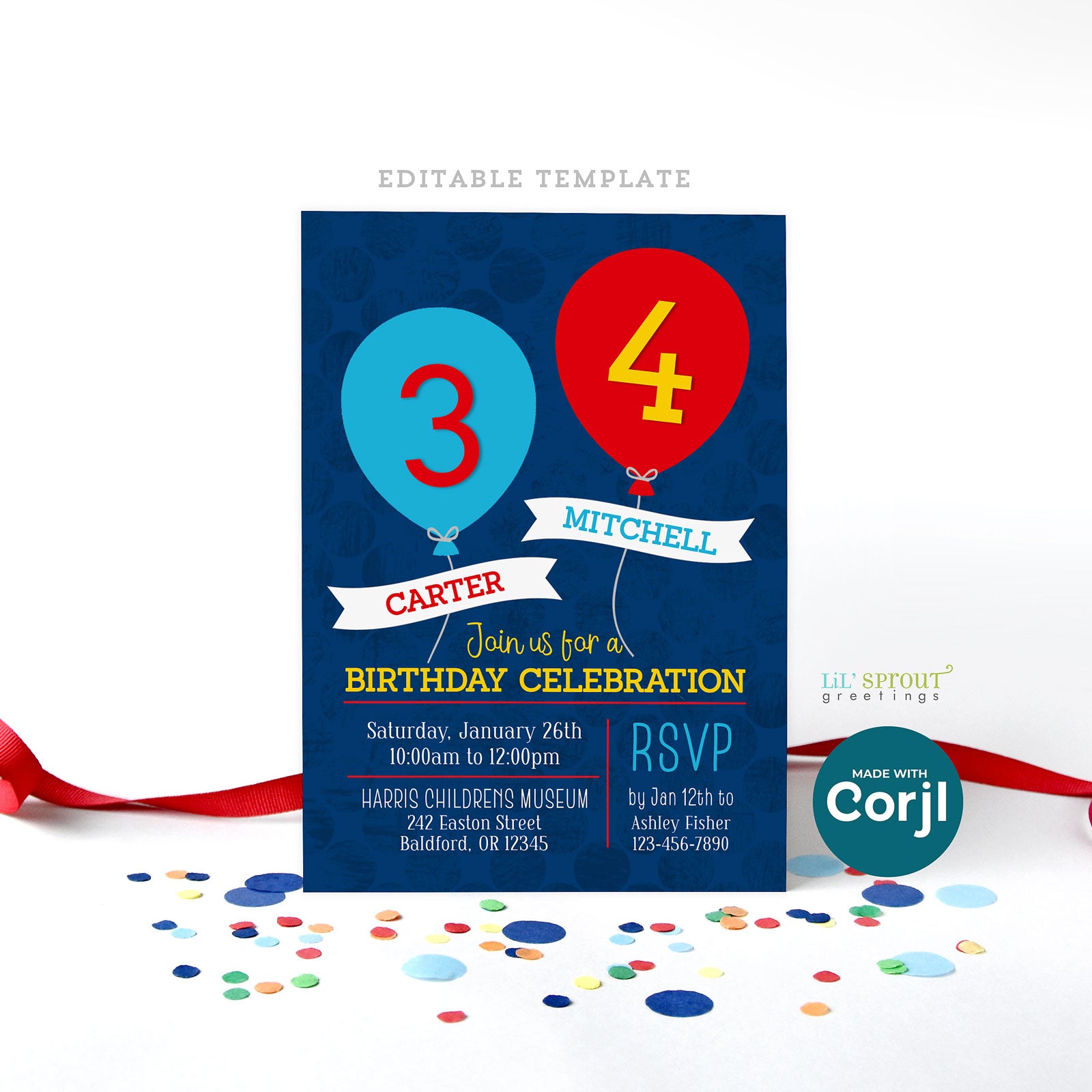 Simple joint birthday invitation template with a colorful balloon for each birthday child to display their age and a name flag. The background colors are fixed on this template but the balloon colors can be edited in Corjl.