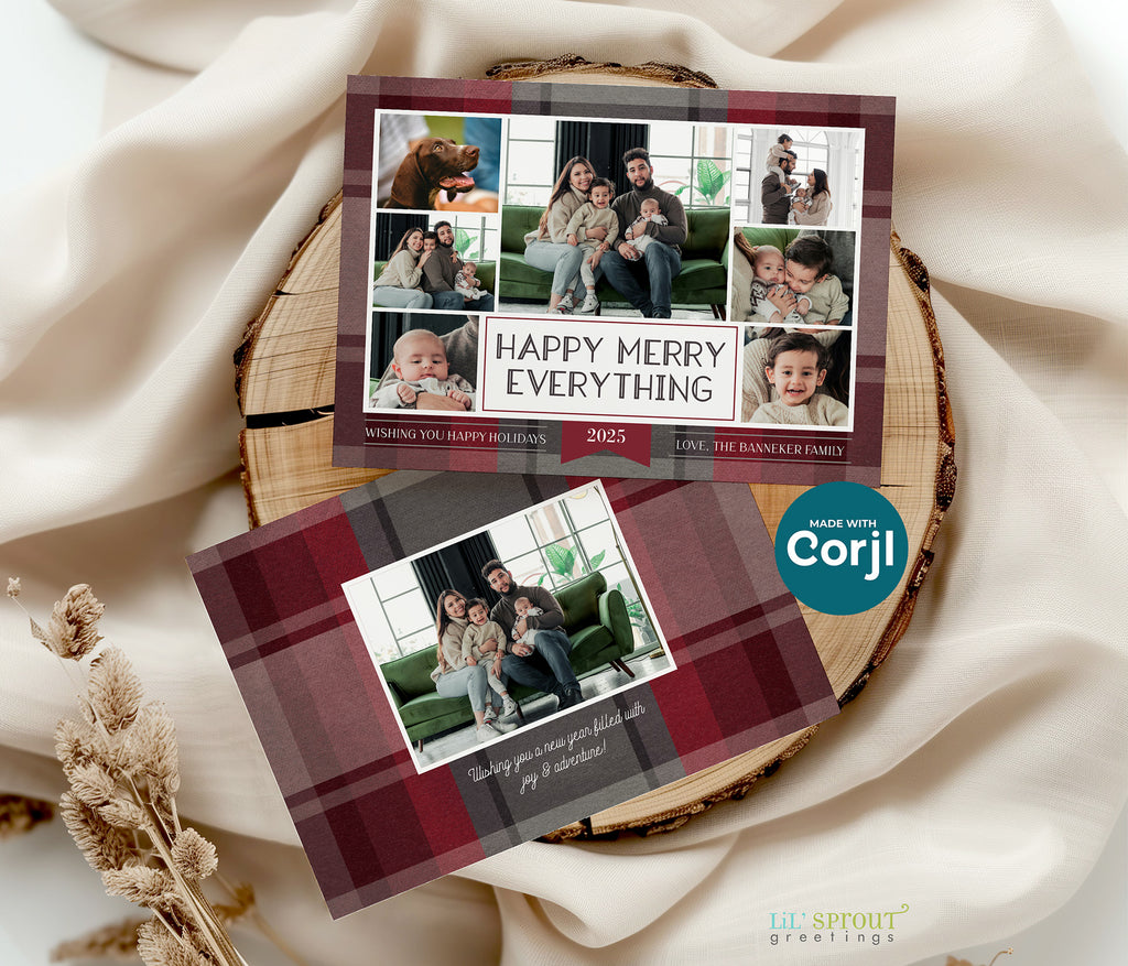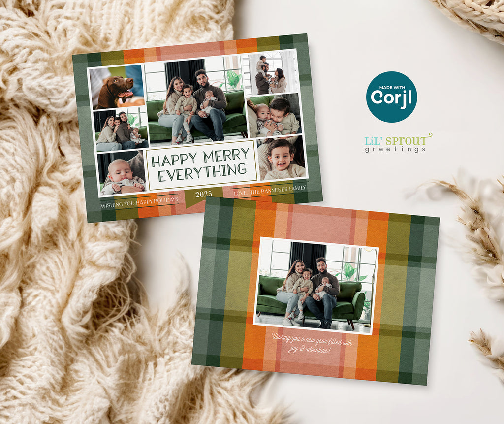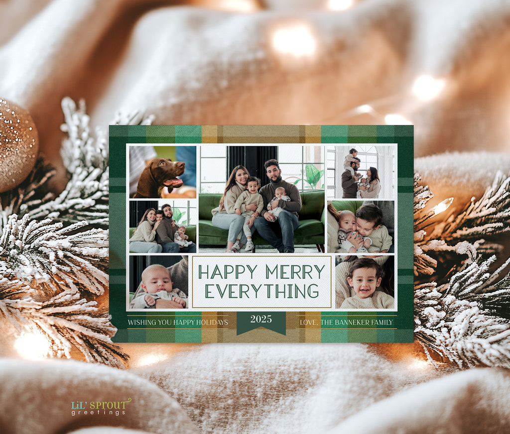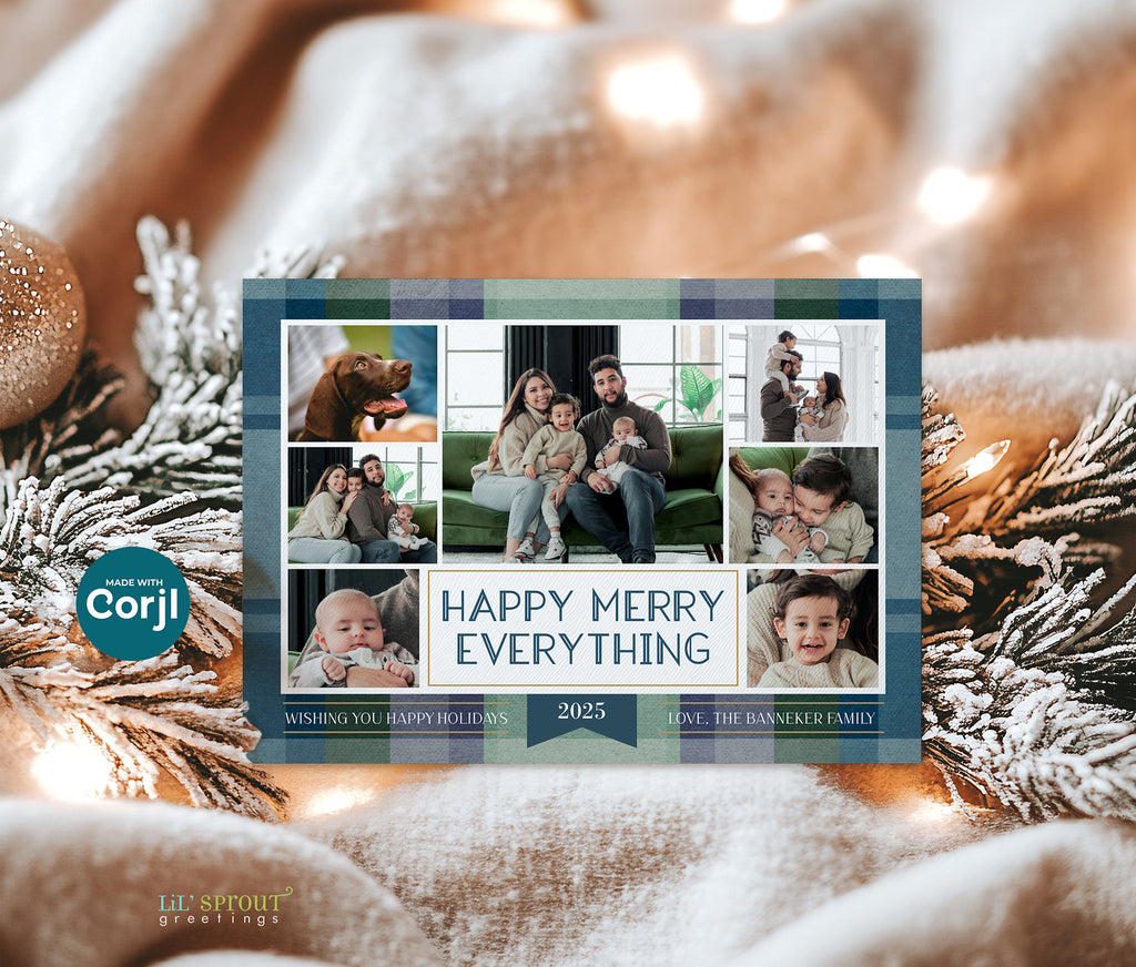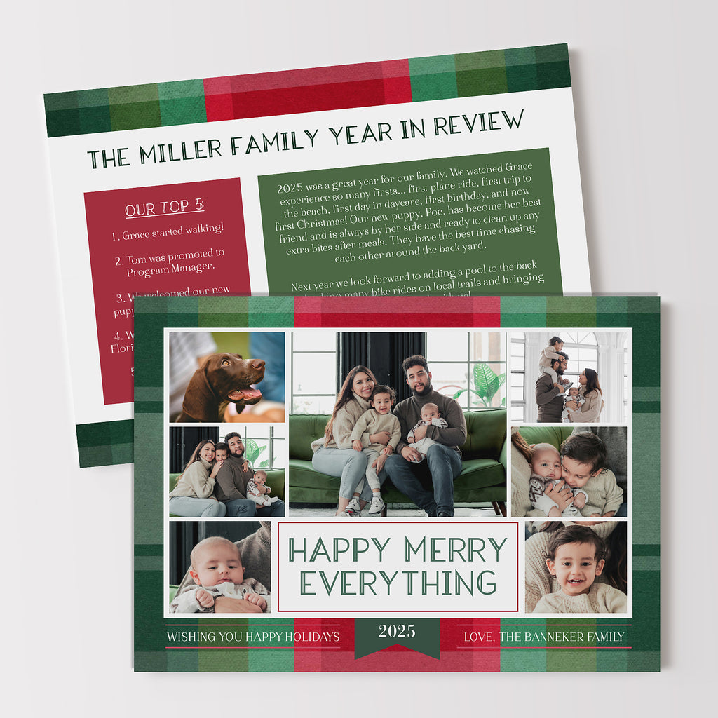 This colorful Christmas card template features a collage of 7 photos on a multicolor plaid background. Choose from 7 plaid color options, including traditional reds and greens, jewel tones of gold and emerald green, or pastels such as blue and purple. Three back side layouts are also included: a plain matching plaid, add a photo and short bit of text, or add a full "year in review" / family update to the back side. If you prefer a single sided photo paper card, then only edit and print the front design. The "happy merry everything" message can be customized with any wording you would like.