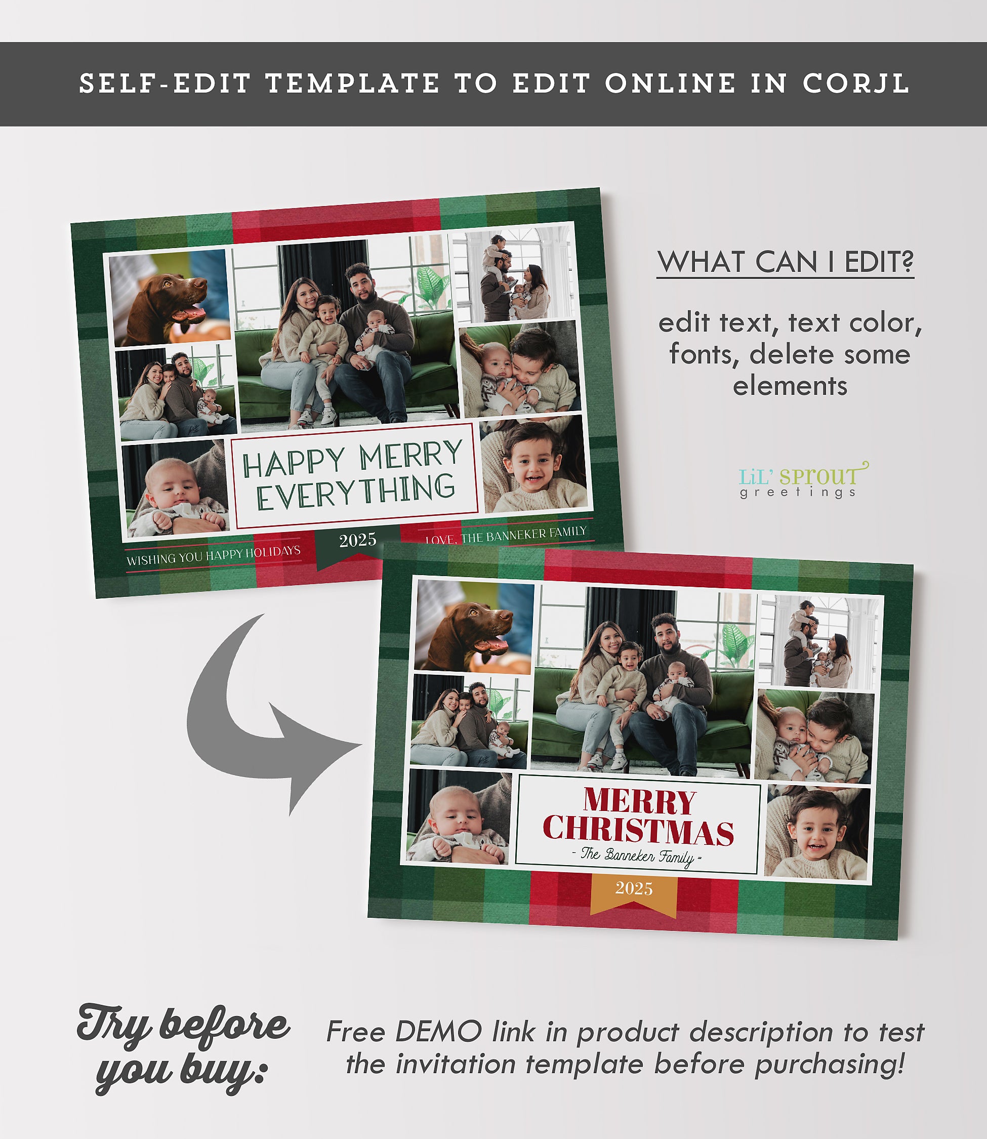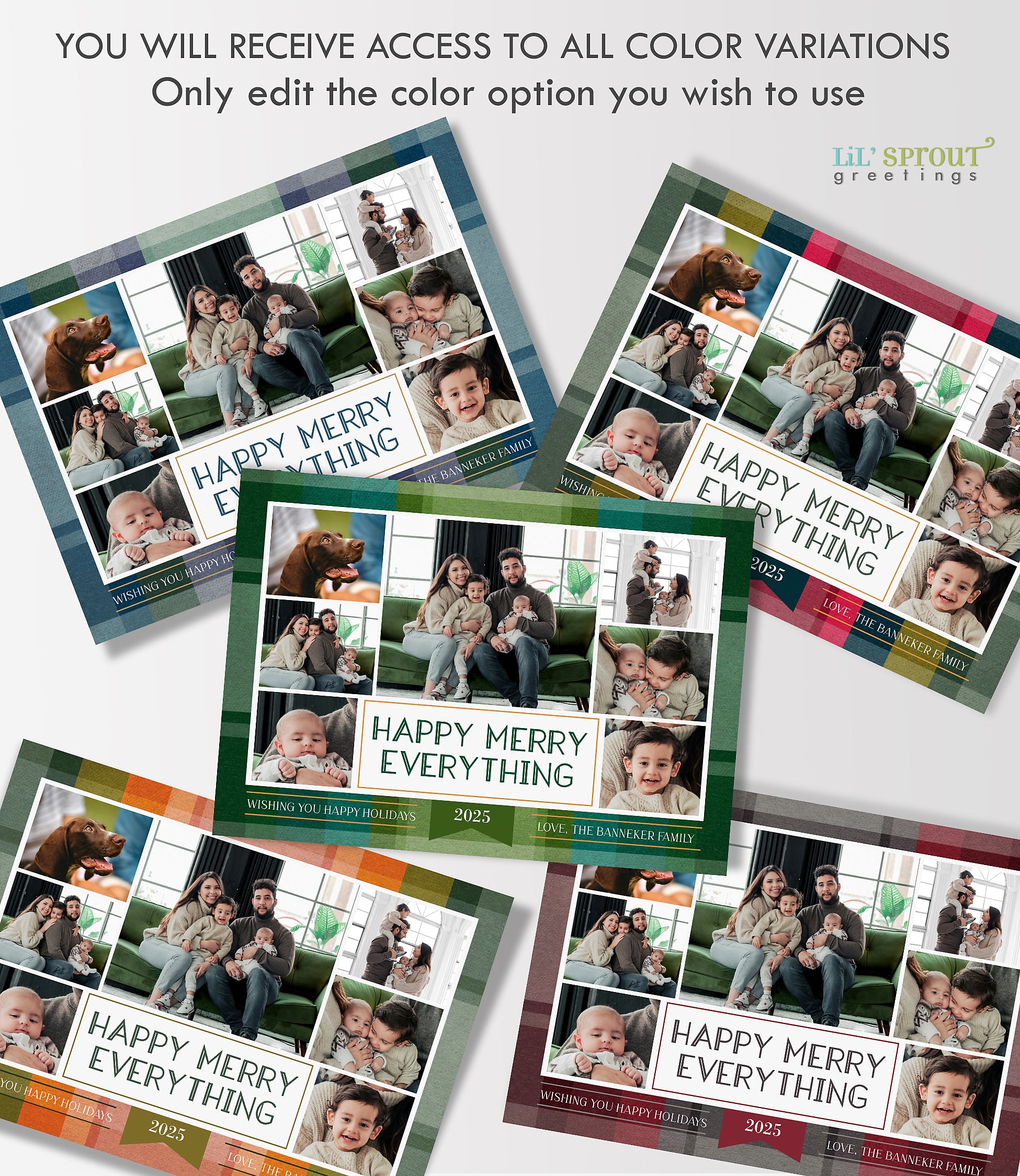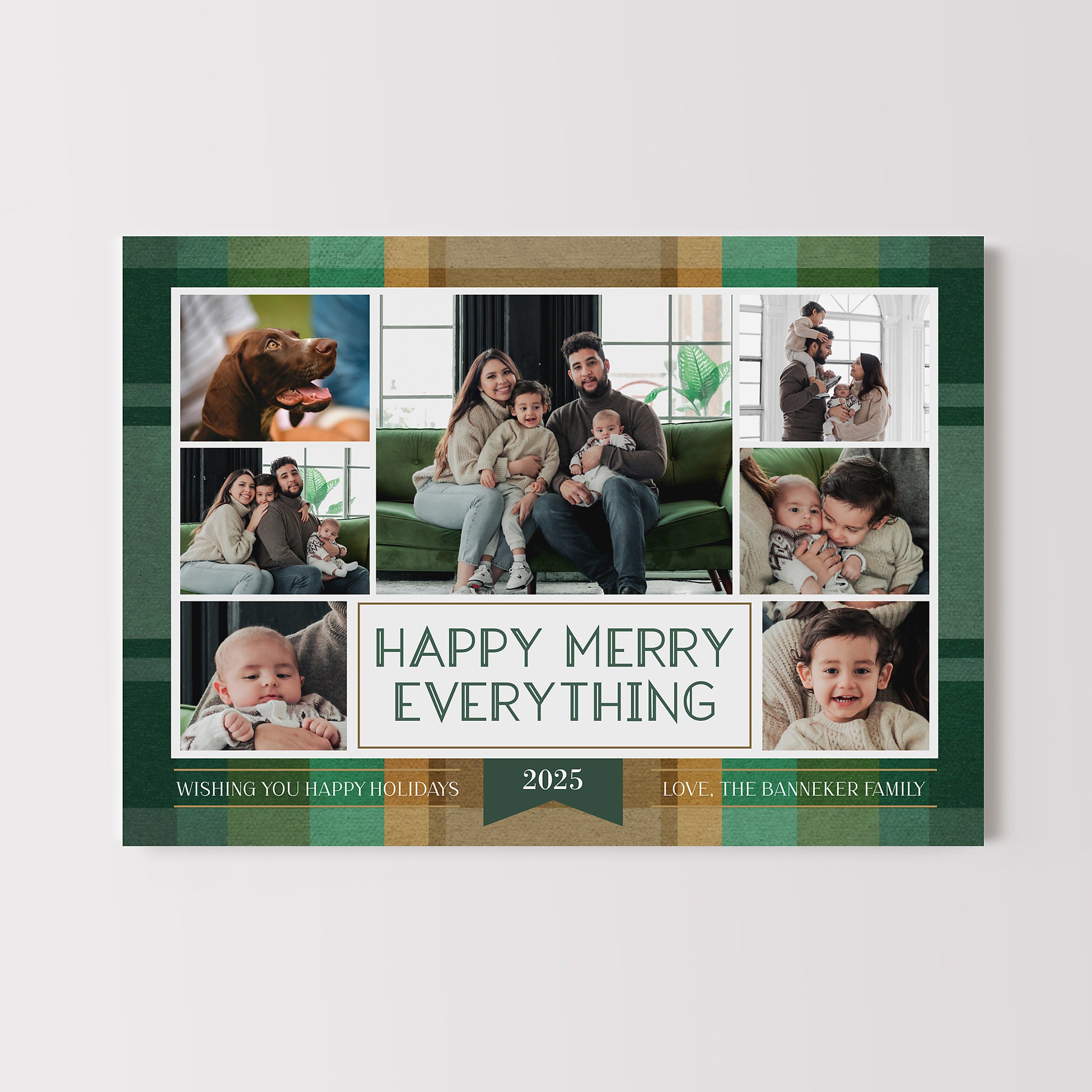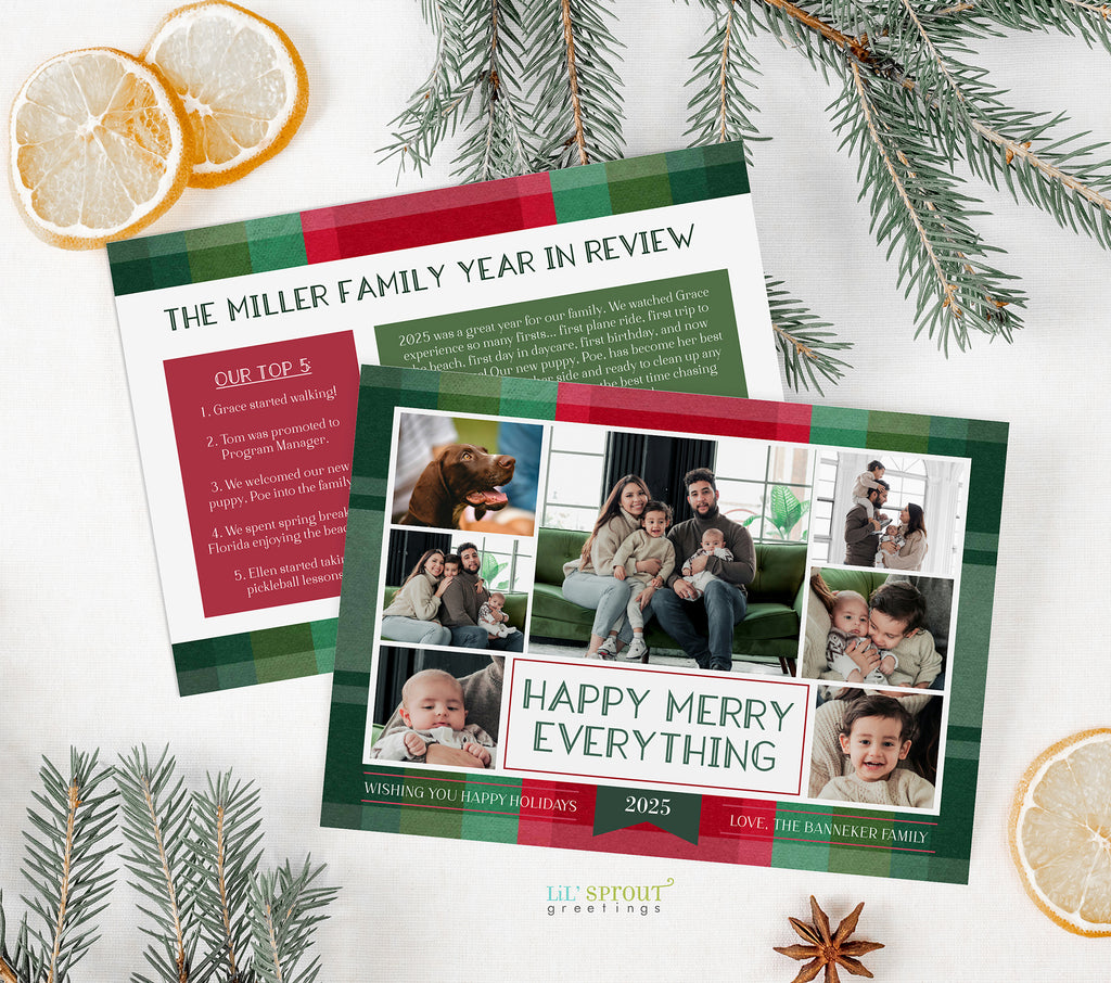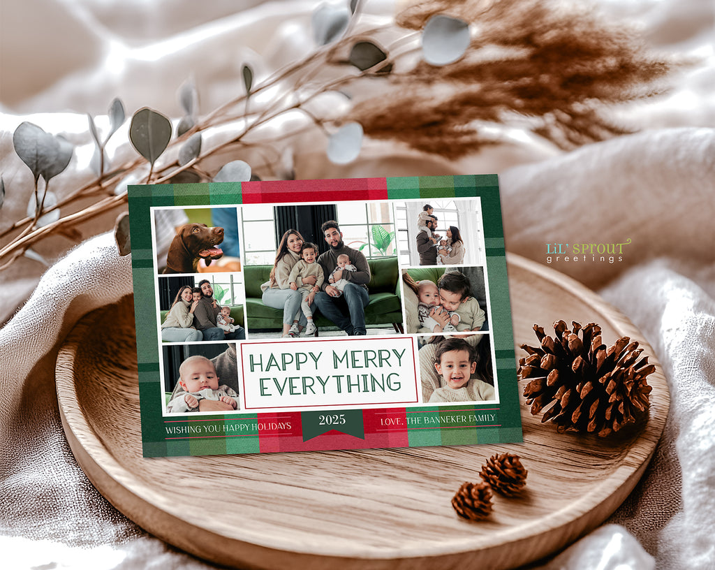 This colorful Christmas card template features a collage of 7 photos on a multicolor plaid background. Choose from 7 plaid color options, including traditional reds and greens, jewel tones of gold and emerald green, or pastels such as blue and purple. Three back side layouts are also included: a plain matching plaid, add a photo and short bit of text, or add a full "year in review" / family update to the back side. If you prefer a single sided photo paper card, then only edit and print the front design. The "happy merry everything" message can be customized with any wording you would like.