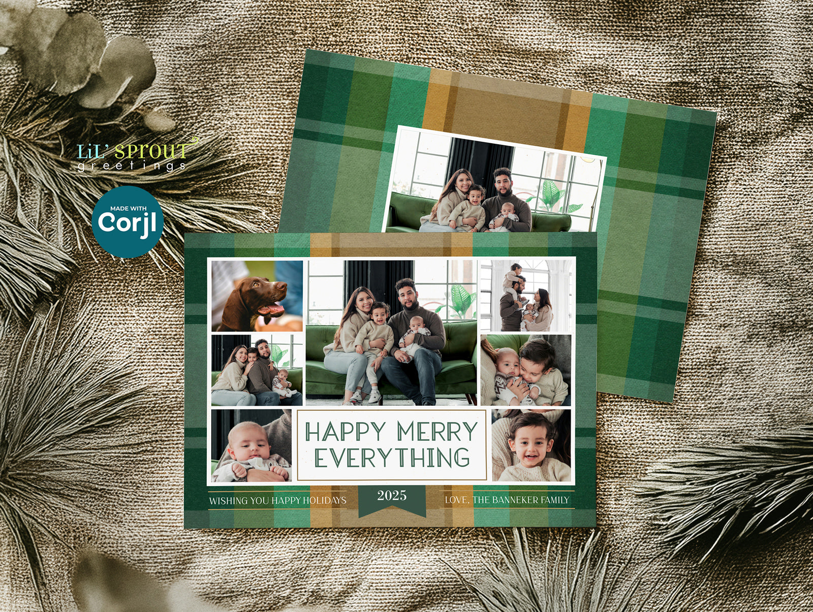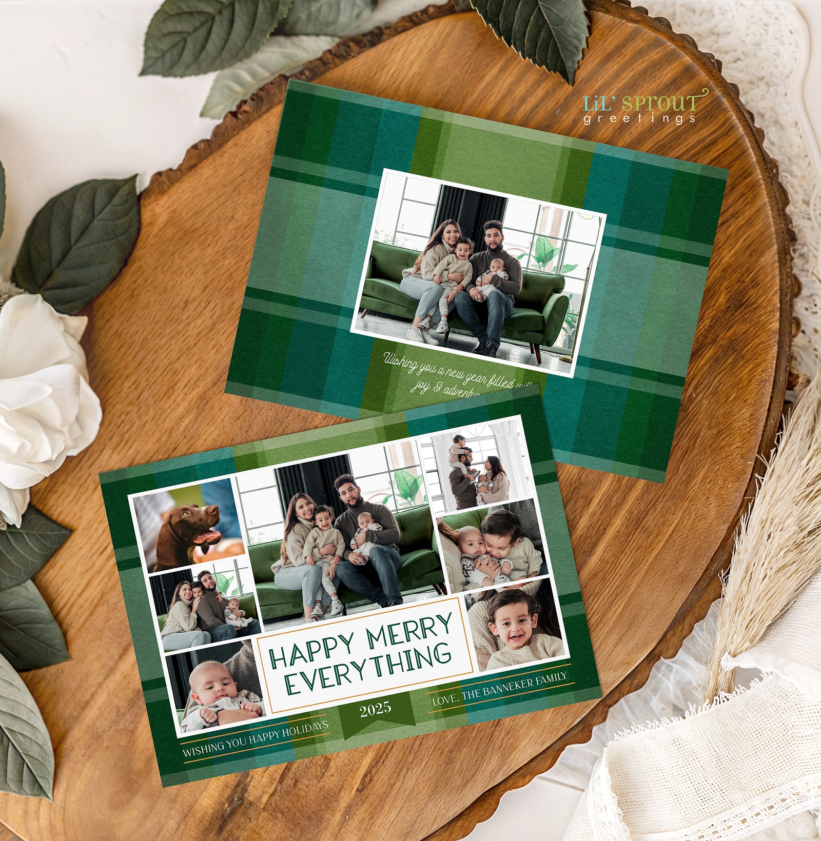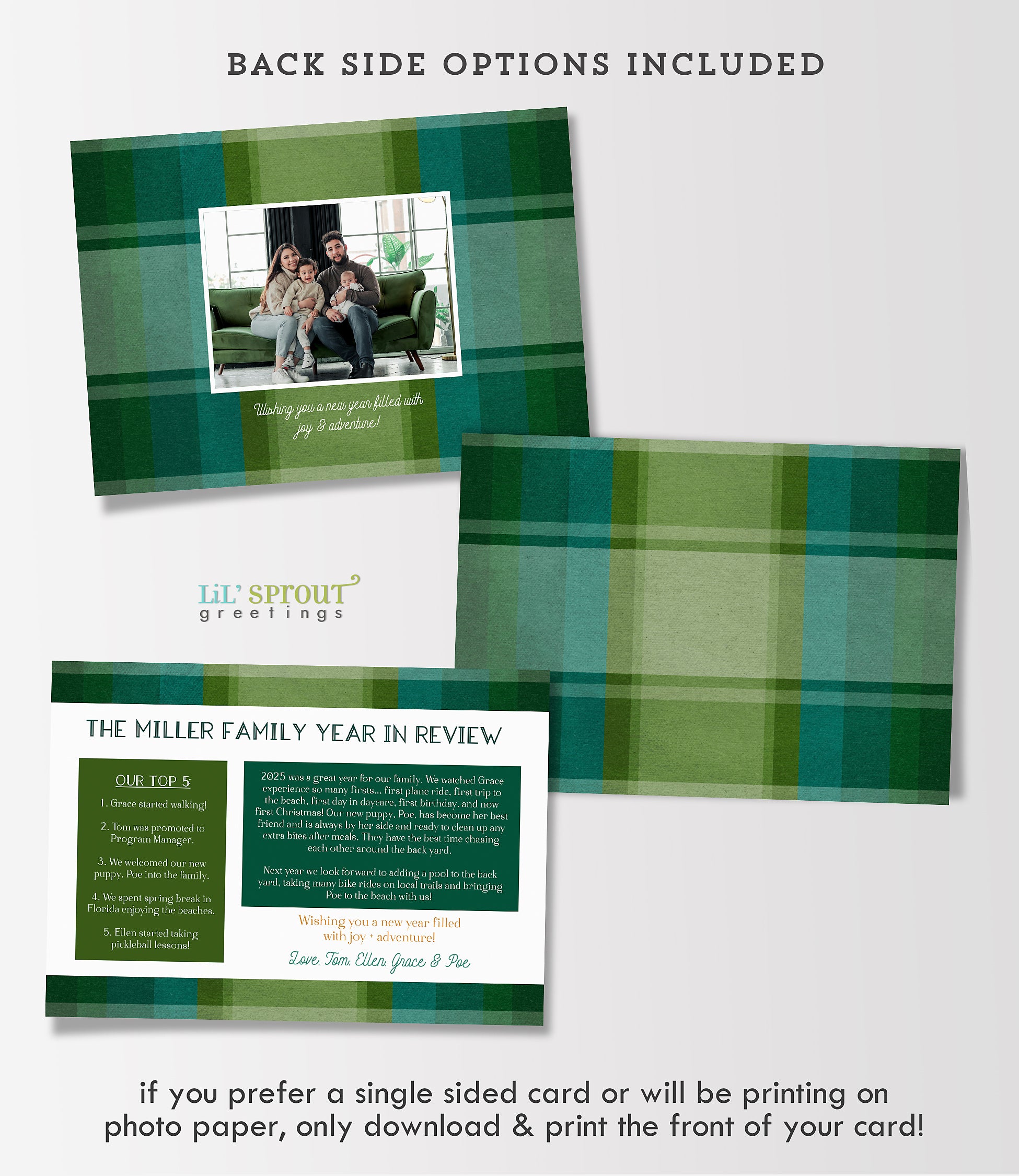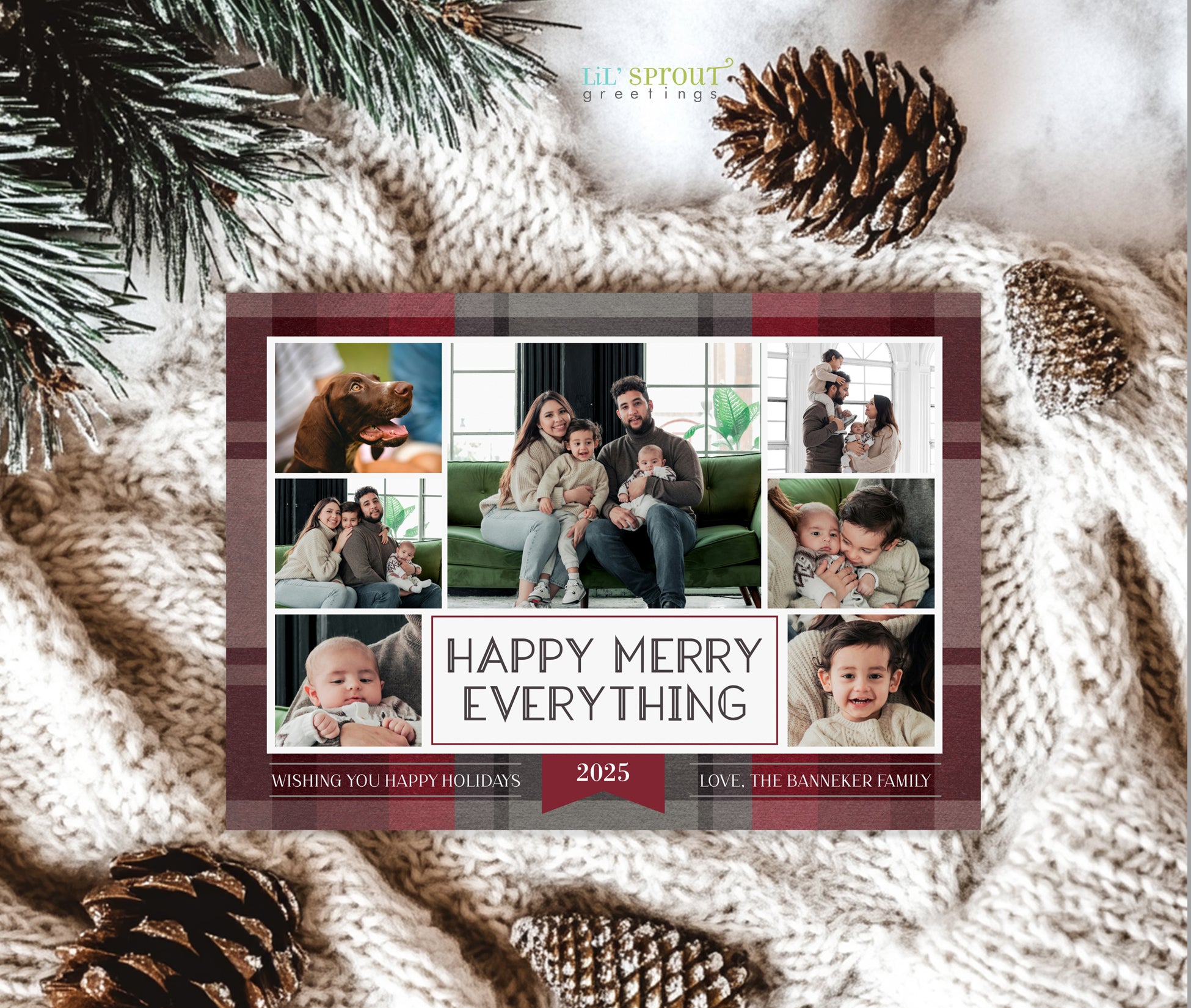 This colorful Christmas card template features a collage of 7 photos on a multicolor plaid background. Choose from 7 plaid color options, including traditional reds and greens, jewel tones of gold and emerald green, or pastels such as blue and purple. Three back side layouts are also included: a plain matching plaid, add a photo and short bit of text, or add a full "year in review" / family update to the back side. If you prefer a single sided photo paper card, then only edit and print the front design. The "happy merry everything" message can be customized with any wording you would like.