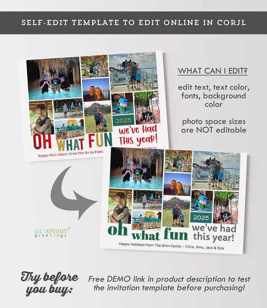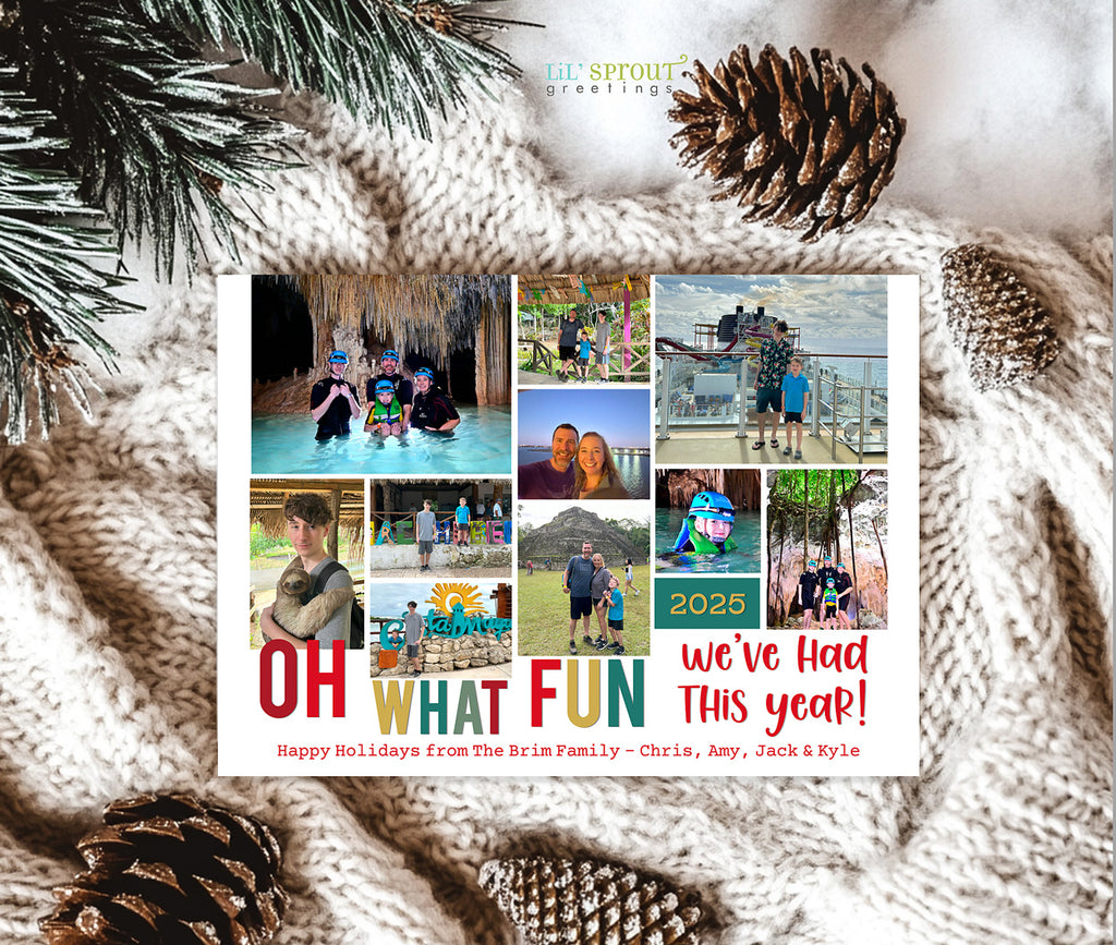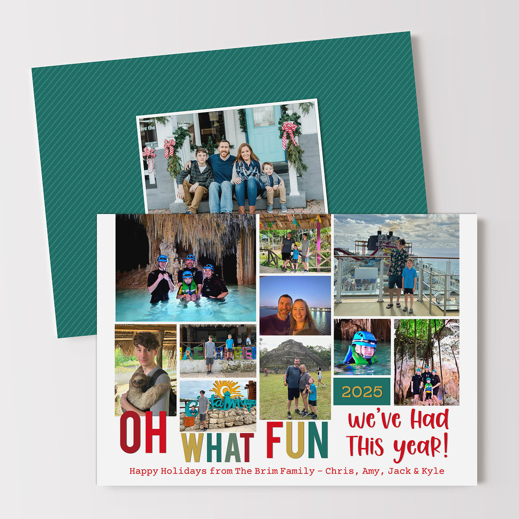 Our most popular Christmas card template for 5 years and counting! This collage style holiday card lets you share "Oh What Fun" you had this year in form of 10 photos. Add a larger family photo to the back side.