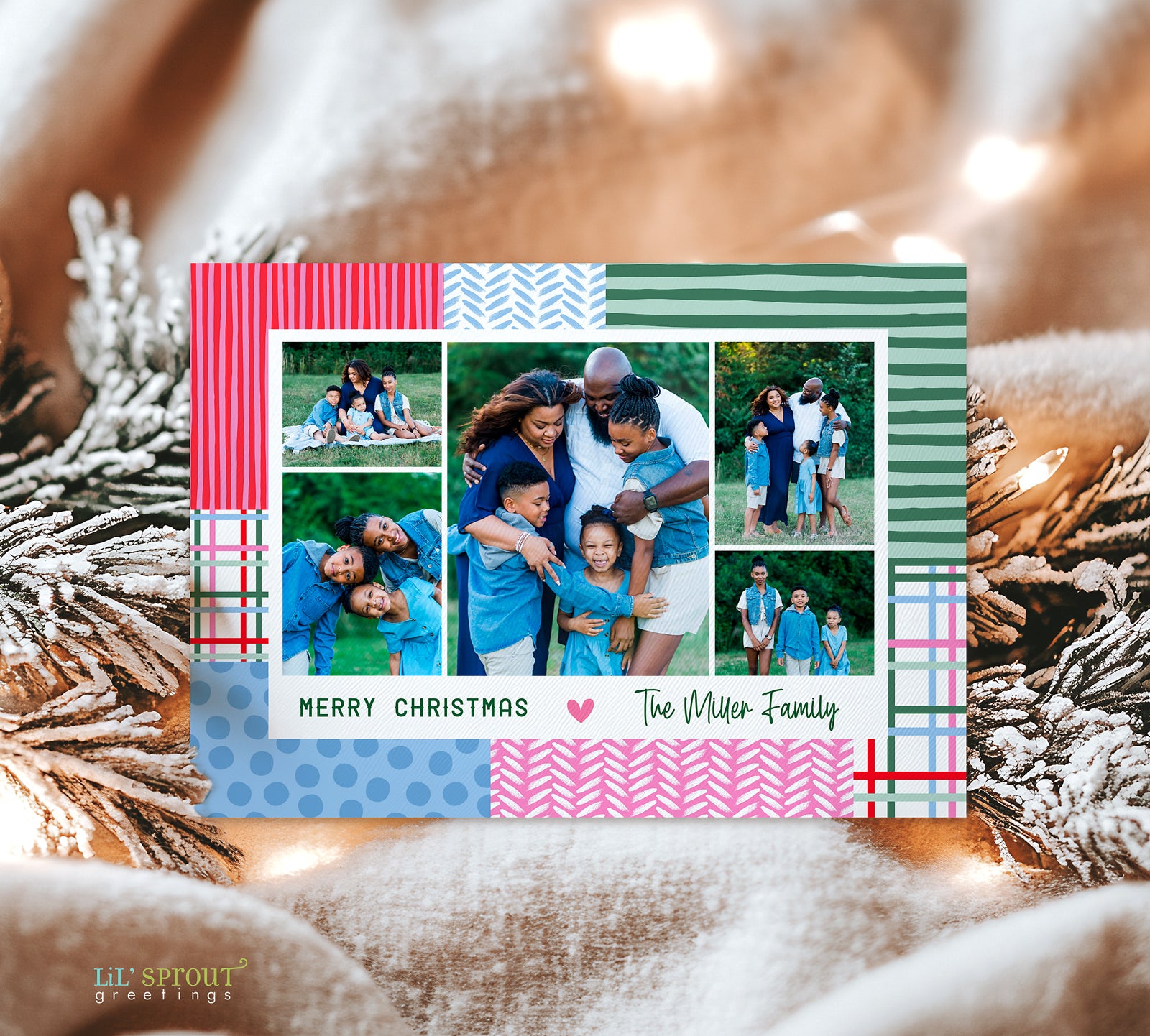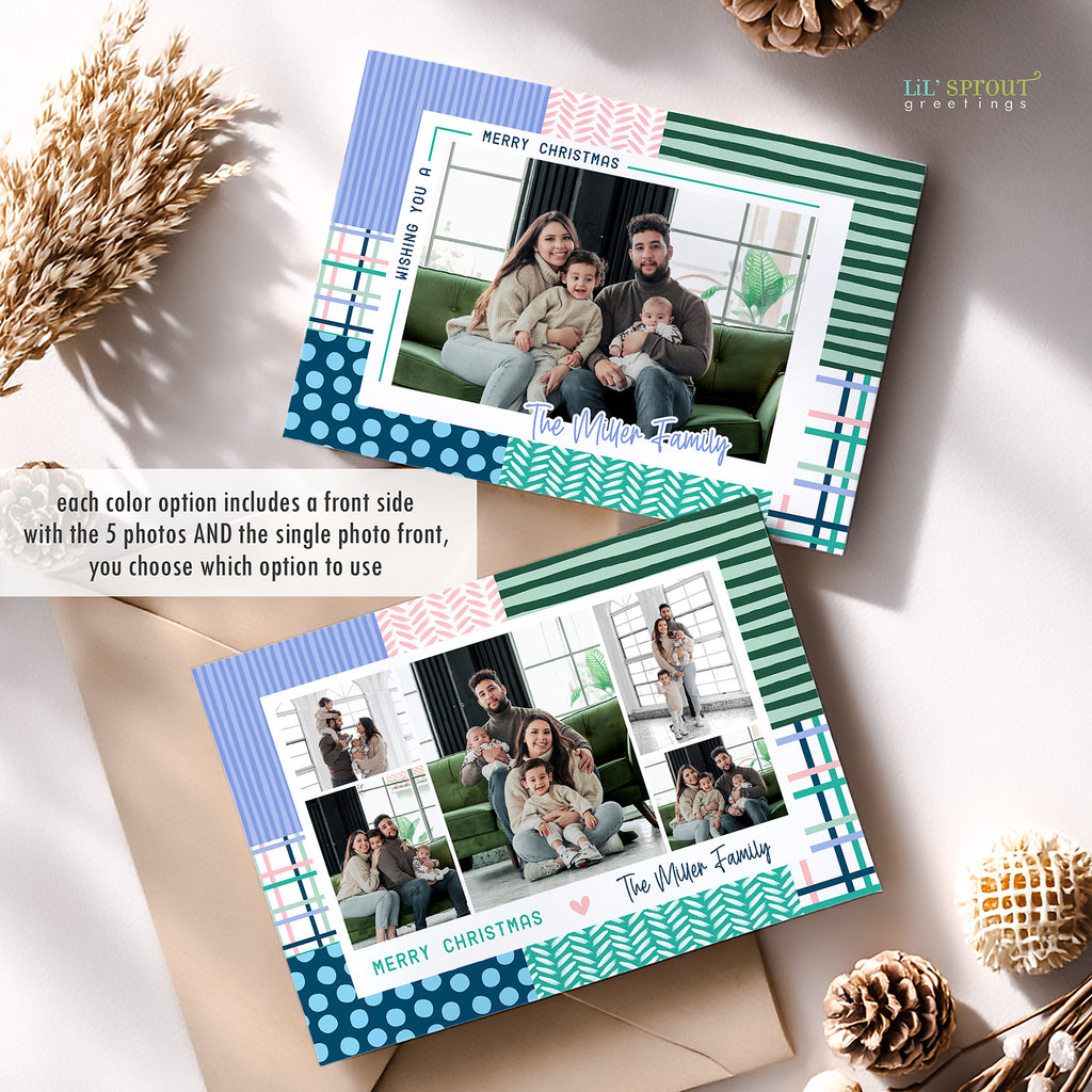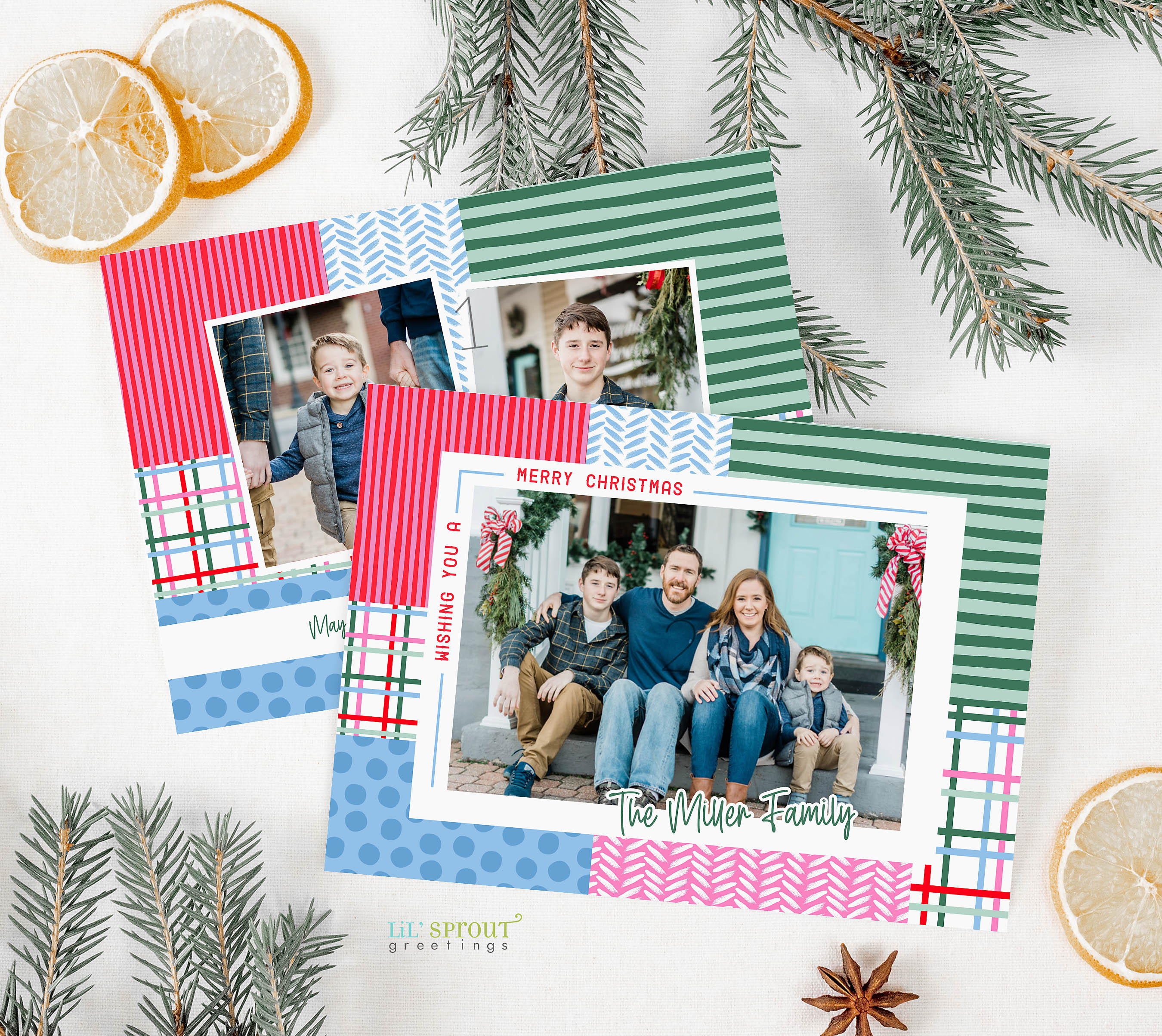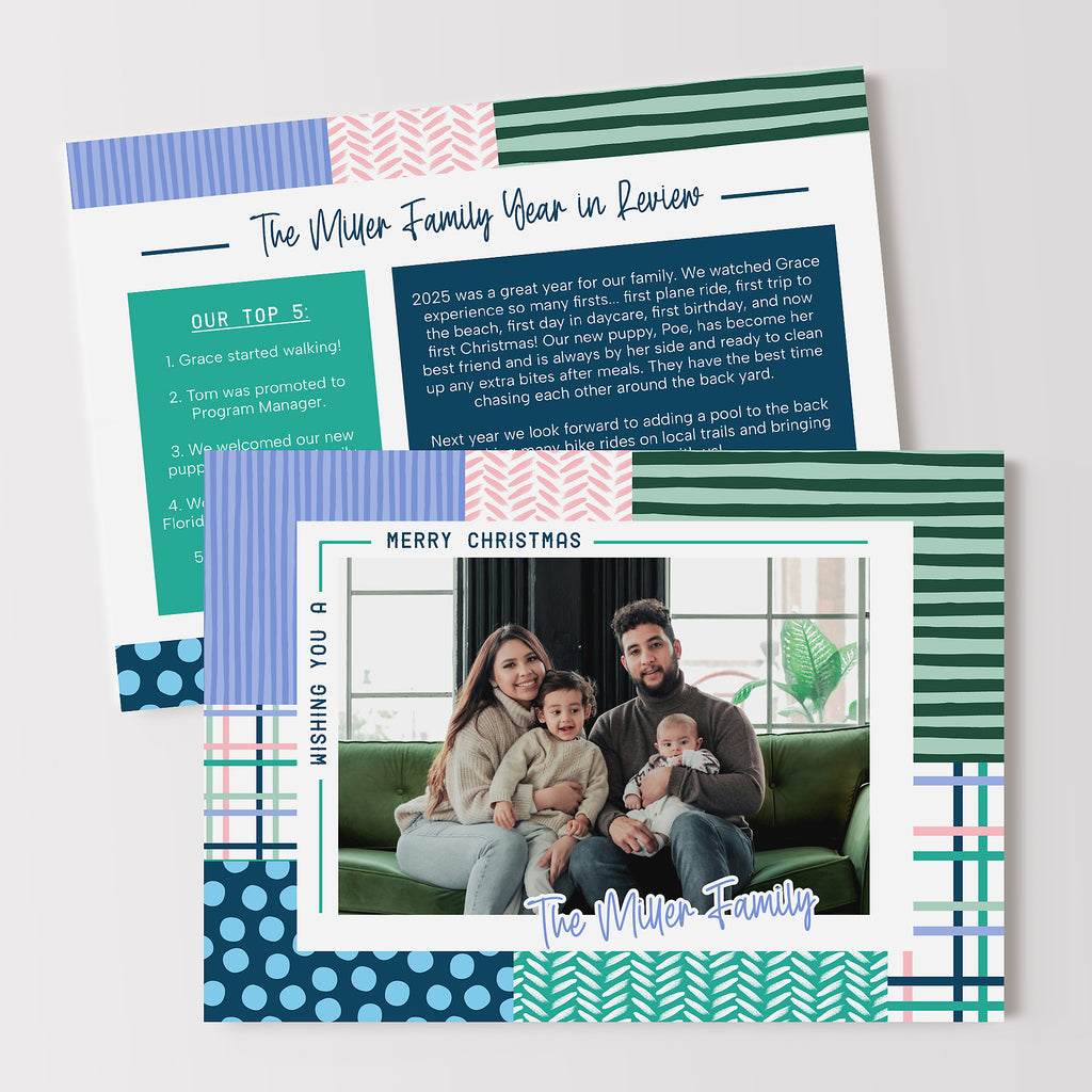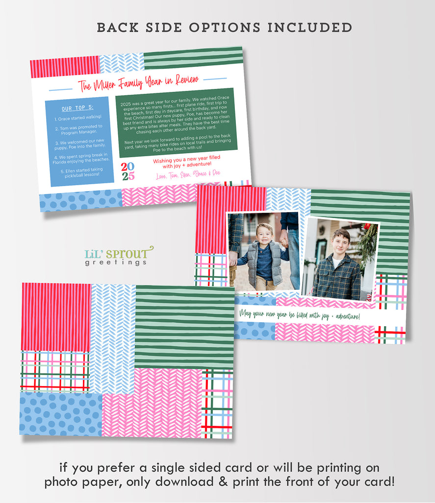 A whimsical, fun Christmas card featuring a patchwork of colorful patterns for the background. Three color choices are included and each color option allows you to choose between a single photo for the front side or a collage of five photos. For the back side, add two additional photos and a line of text, leave it with just the patchwork pattern, or choose our "year in review" template to provide a full family update.