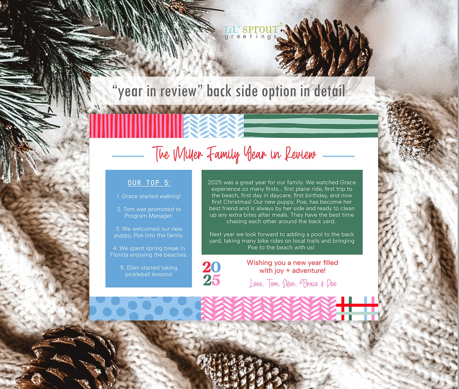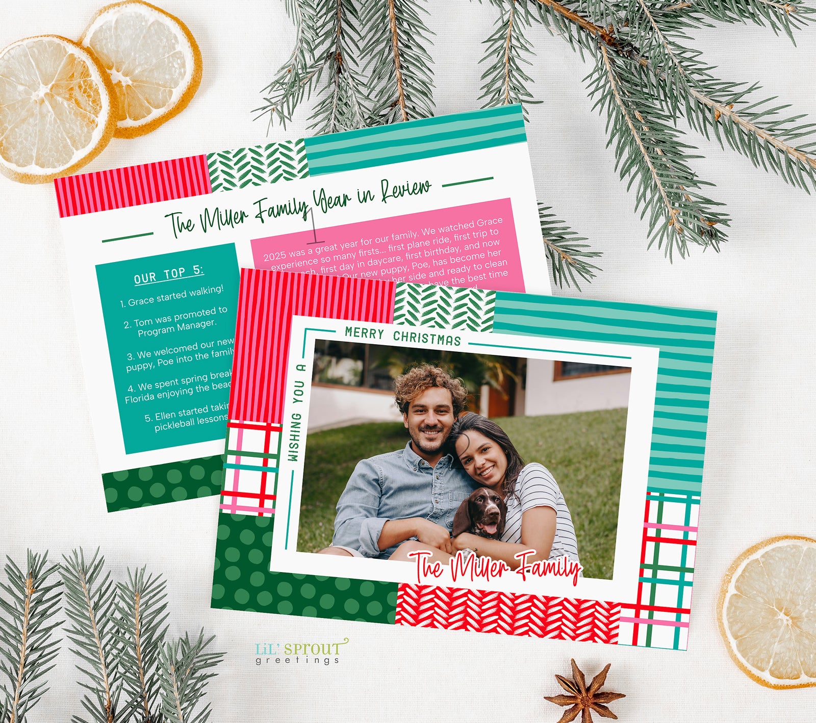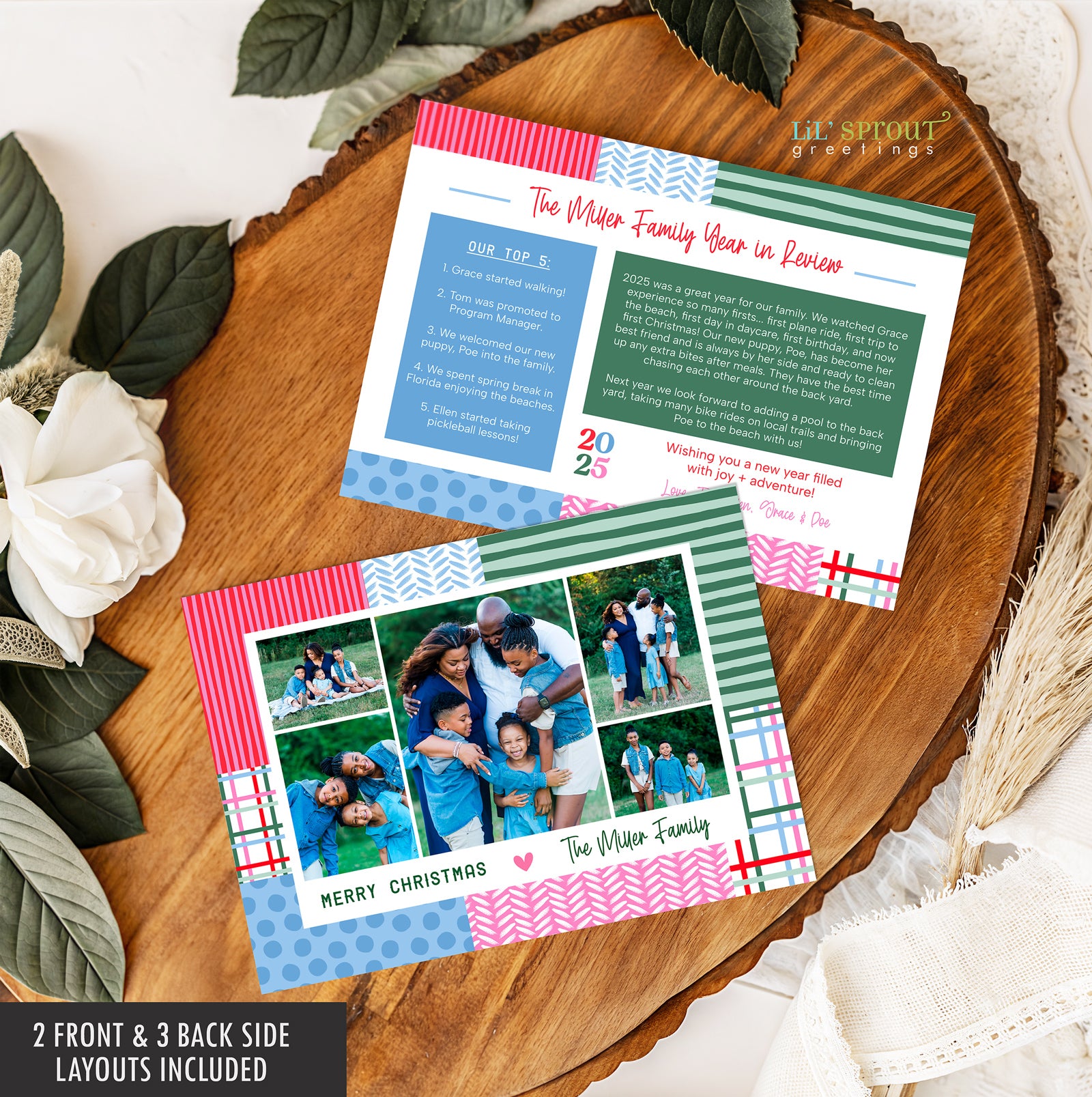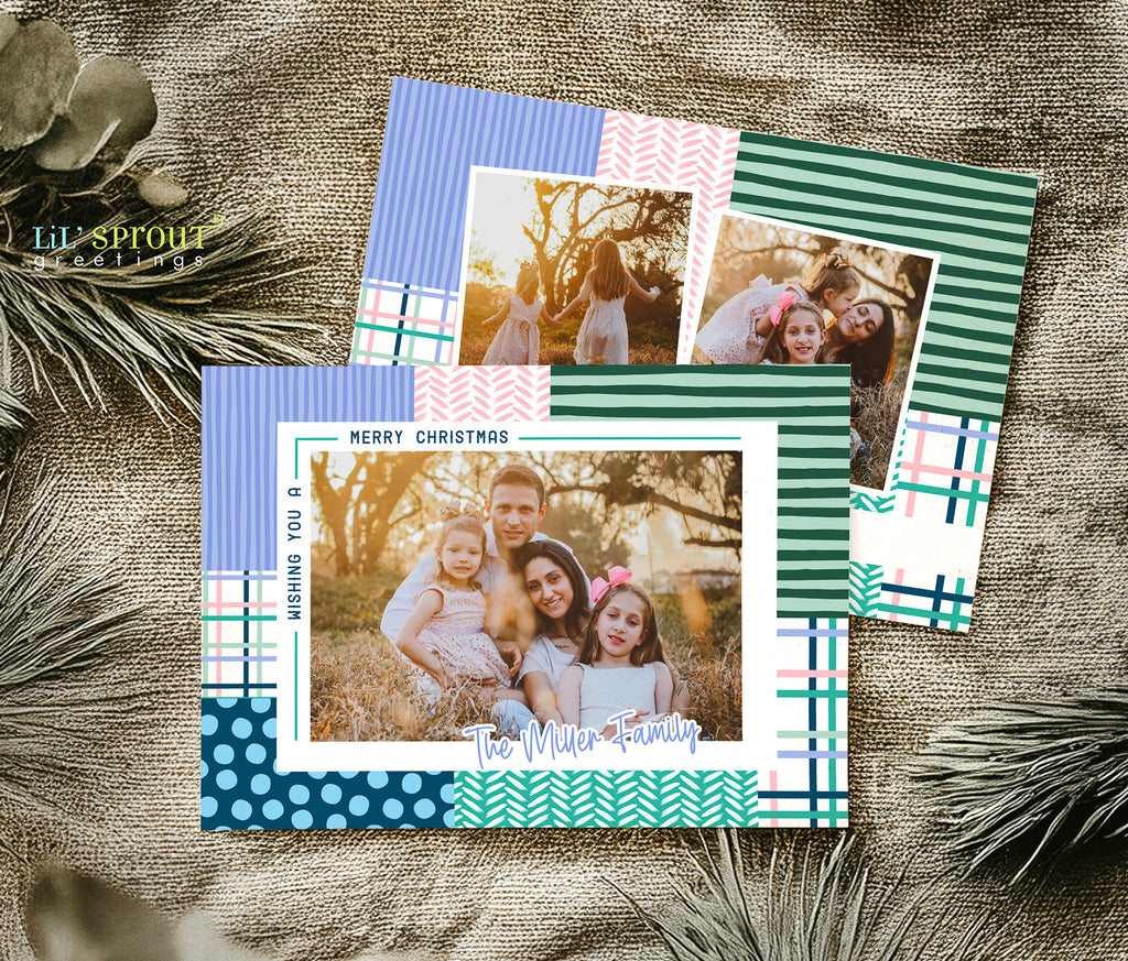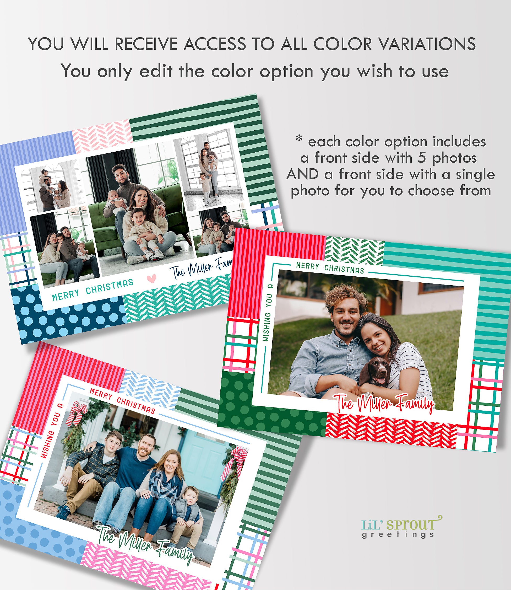 A whimsical, fun Christmas card featuring a patchwork of colorful patterns for the background. Three color choices are included and each color option allows you to choose between a single photo for the front side or a collage of five photos. For the back side, add two additional photos and a line of text, leave it with just the patchwork pattern, or choose our "year in review" template to provide a full family update.