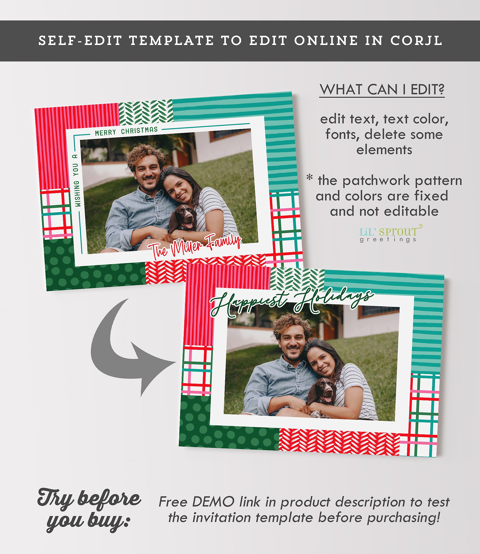 Our invitation templates are formatted for editing on Corjl, an in-browser template editor that allows you to login, add your text and photos to your card template and download the completed files. No software or experience is necessary. Edit from a computer or a mobile device. Use your completed files to print your invitation or send it digitally.