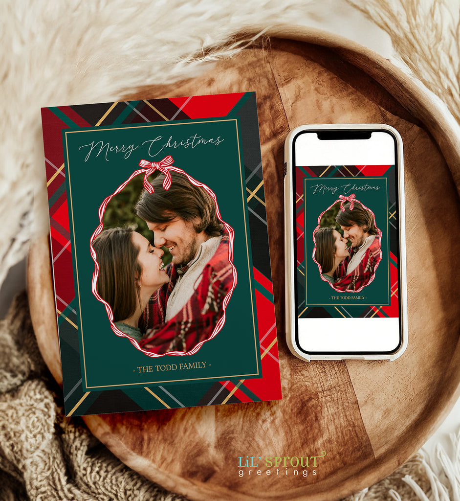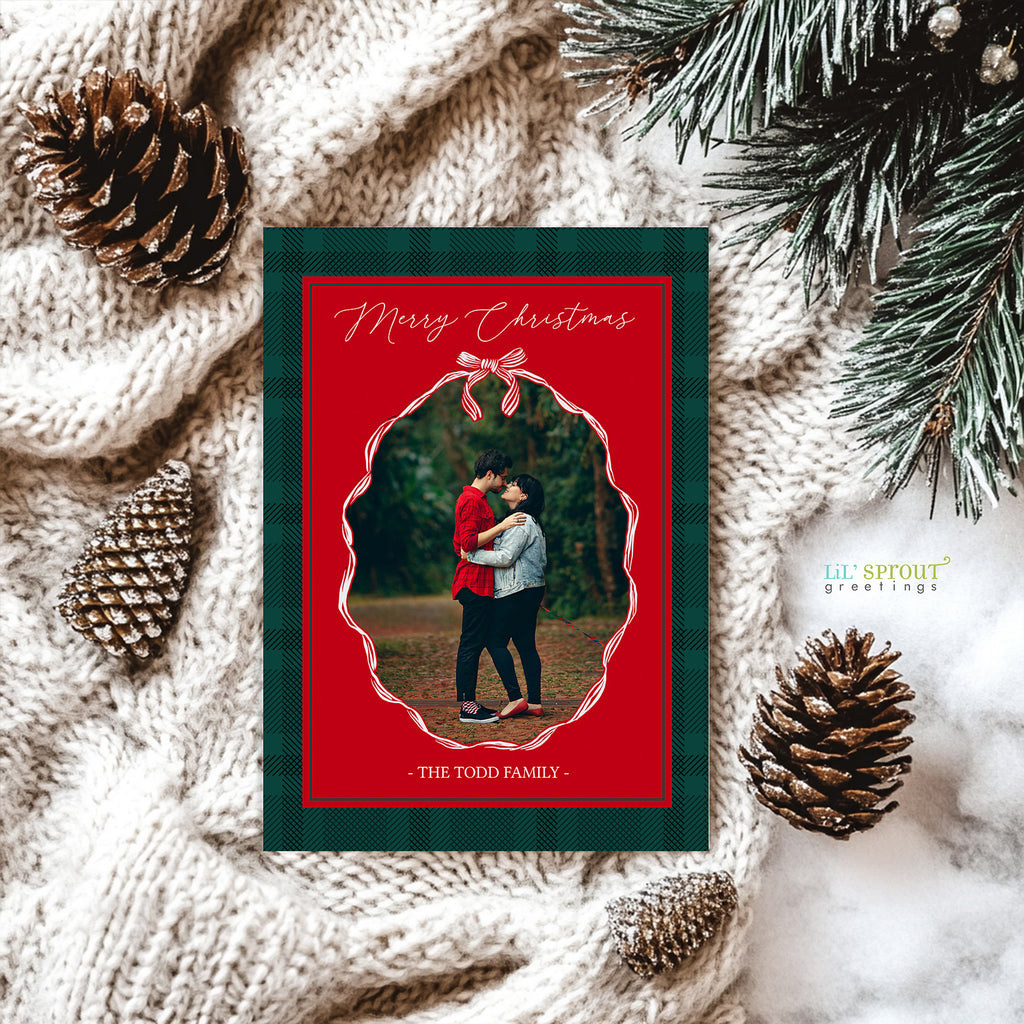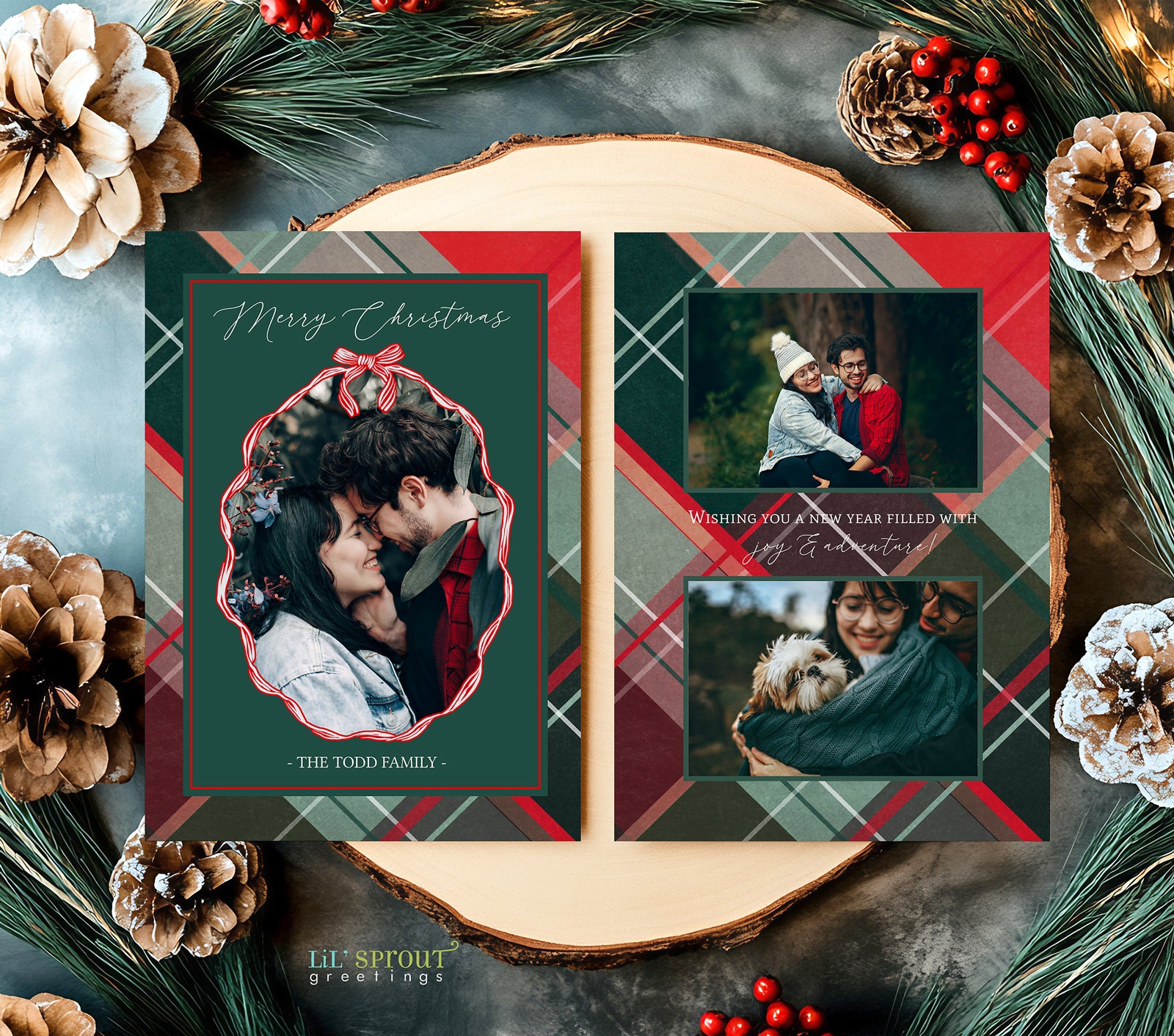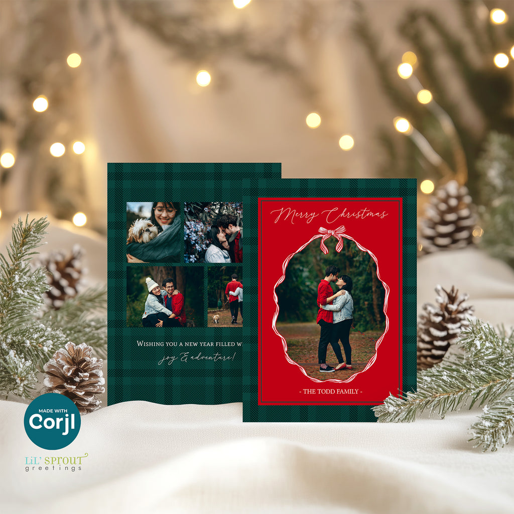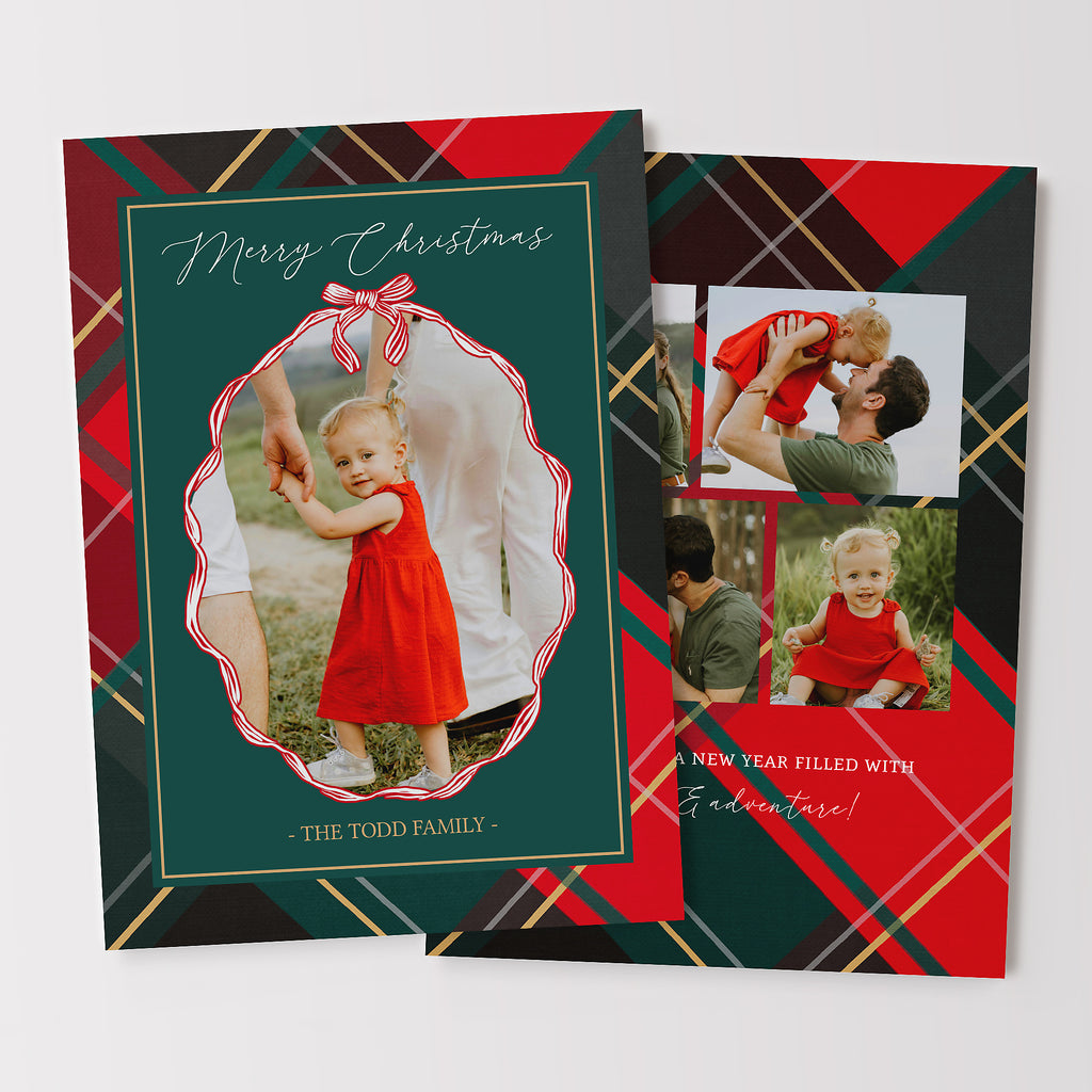 A classic Christmas card design in shades of red and green with various plaid patterns, elegant fonts and an oval shaped ribbon and bow framed photo on the front. Choose from four plaid patterns. For the back side, four layouts are included so you can add 1, 2 or 4 photos or just a simple line of text. Edit this card template online in Corjl then instantly download your completed files to print or send digitally.