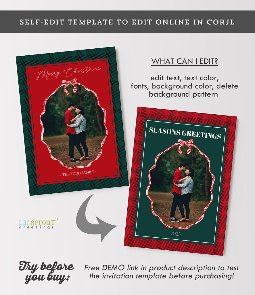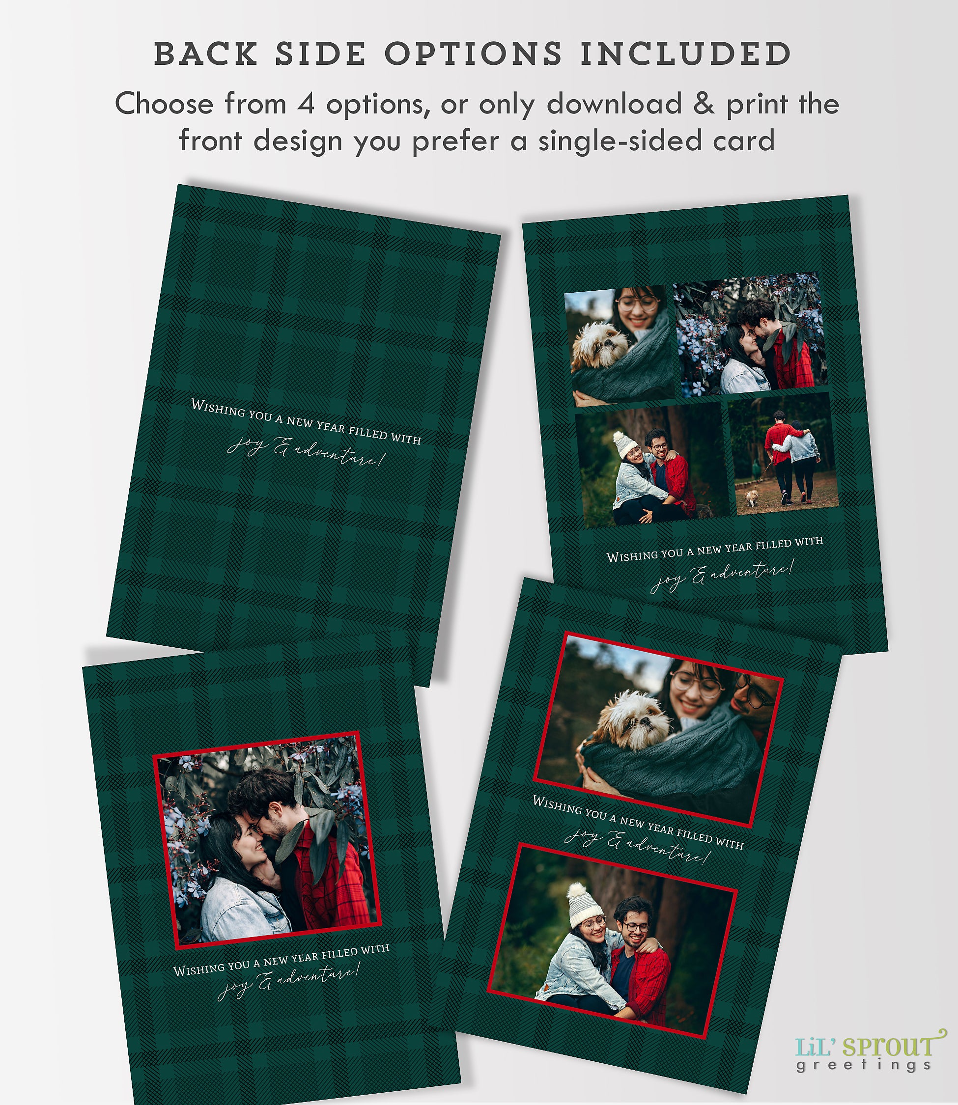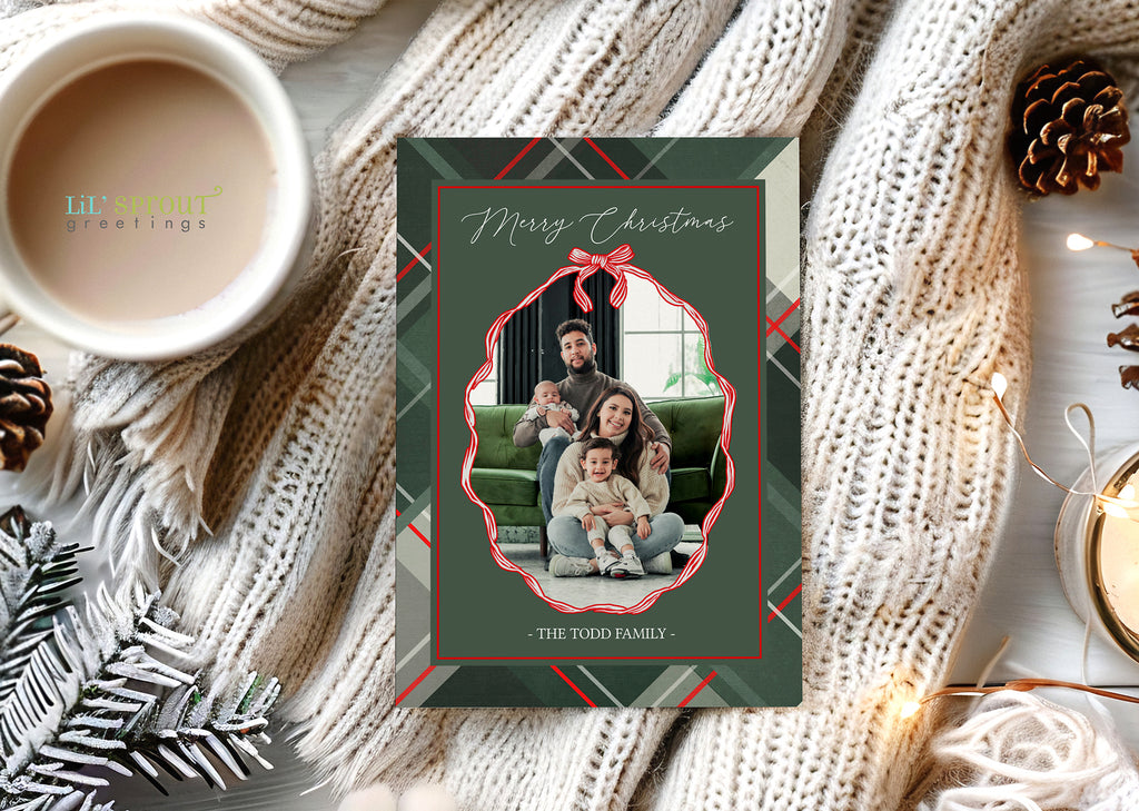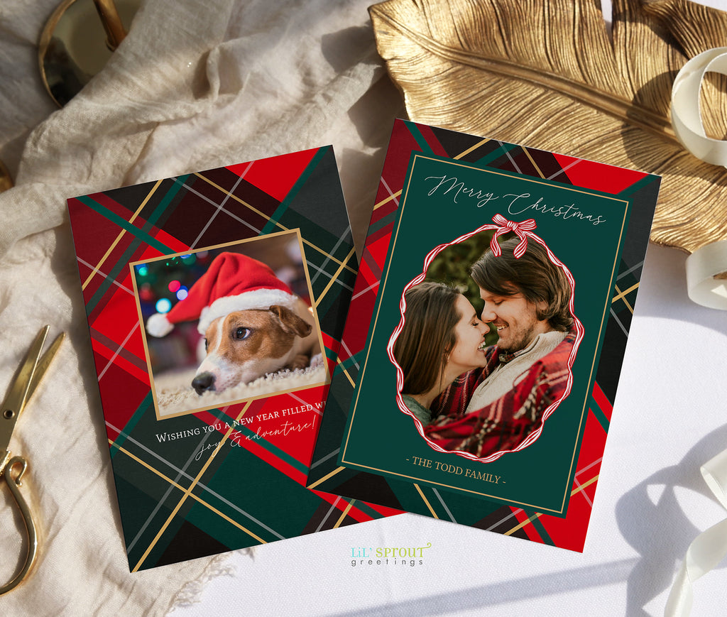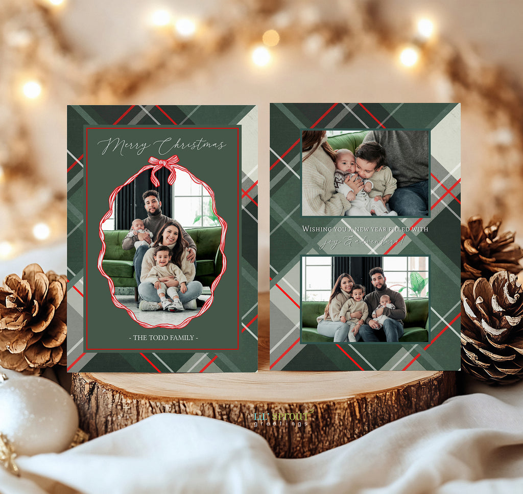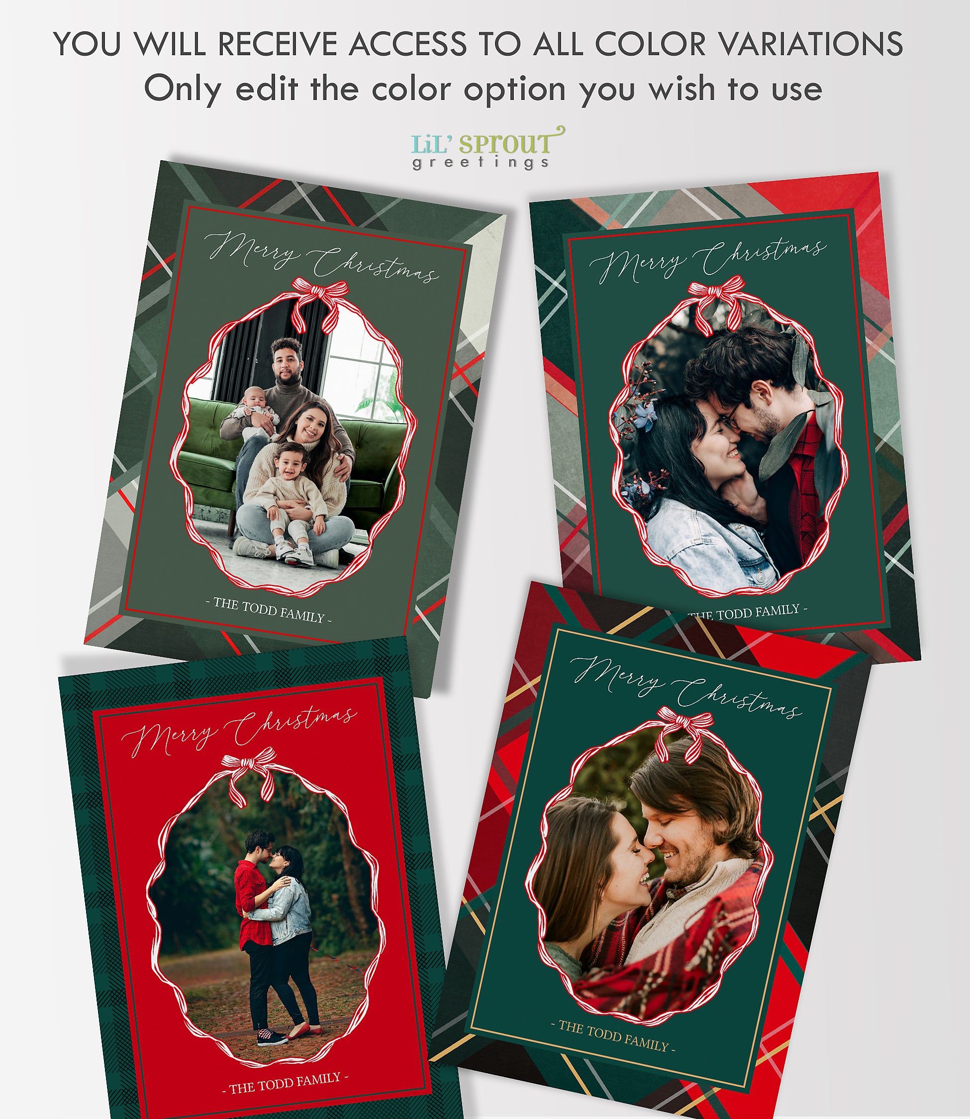 A classic Christmas card design in shades of red and green with various plaid patterns, elegant fonts and an oval shaped ribbon and bow framed photo on the front. Choose from four plaid patterns. For the back side, four layouts are included so you can add 1, 2 or 4 photos or just a simple line of text. Edit this card template online in Corjl then instantly download your completed files to print or send digitally.
