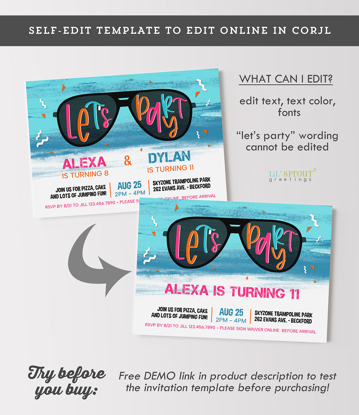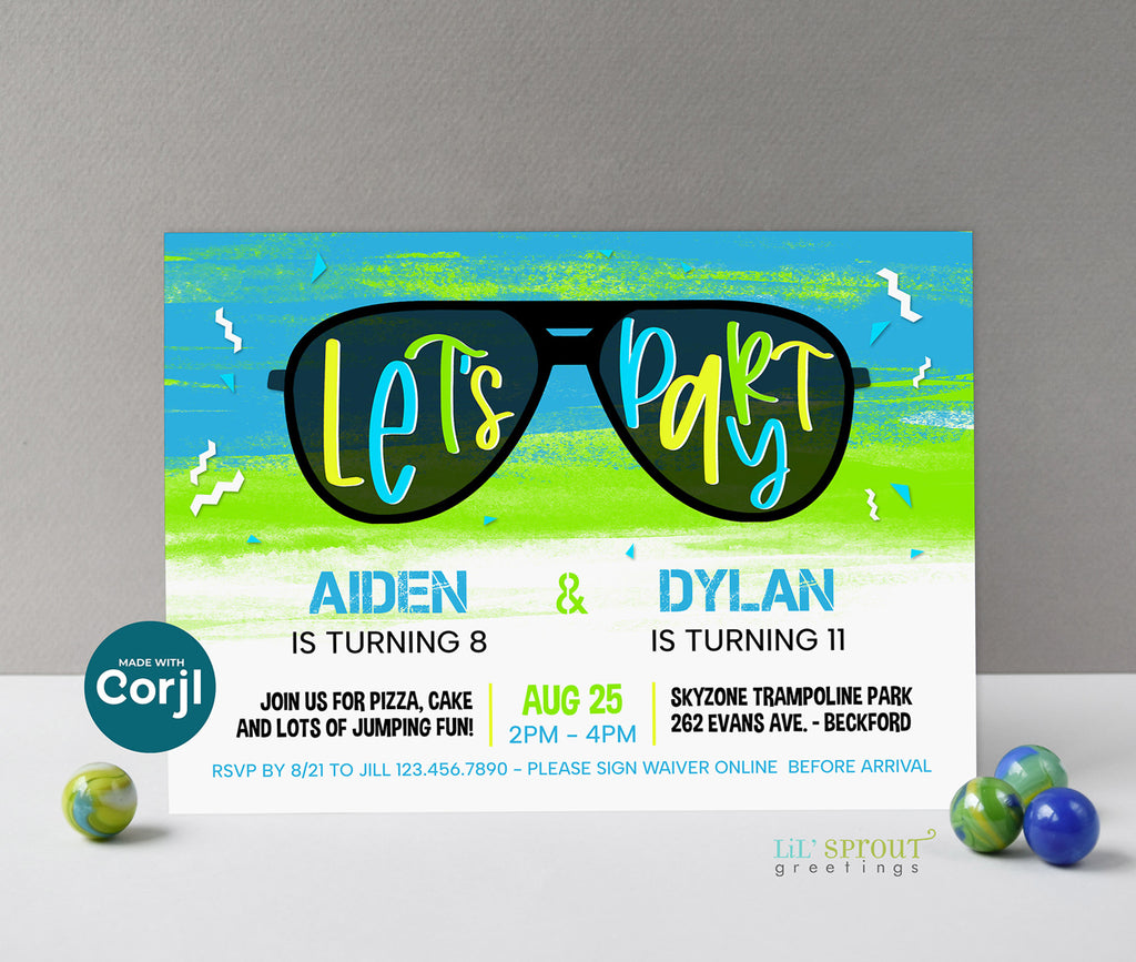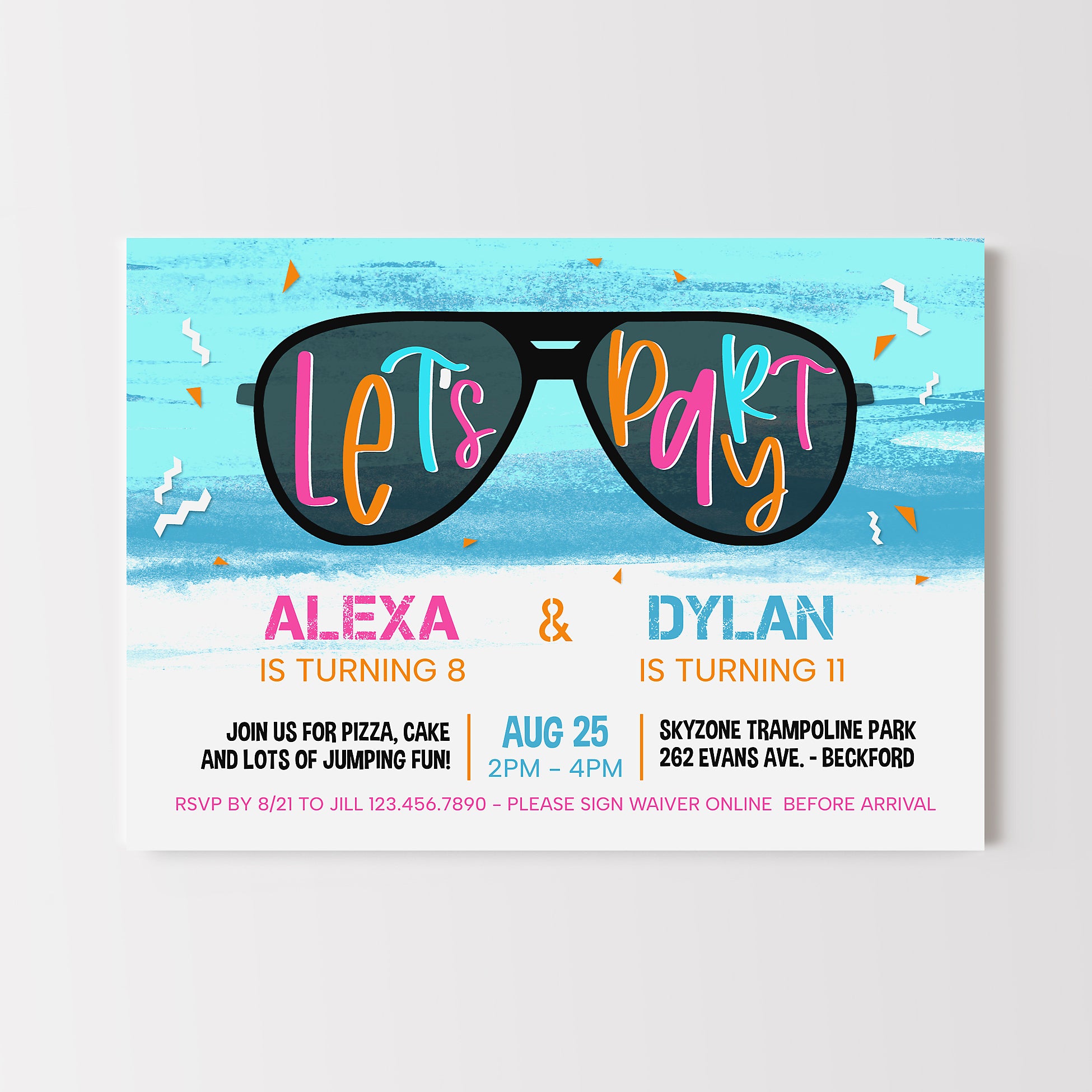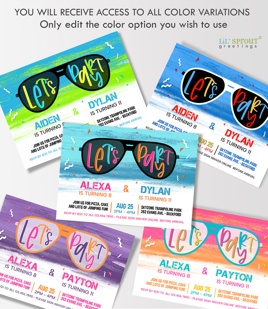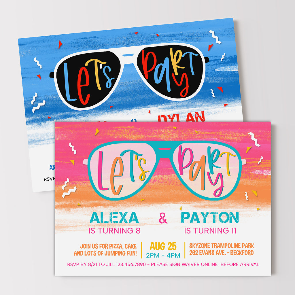 This hip birthday invite template uses vibrant colors, fun sunglasses and funky fonts to create an invite that an teen or tween would love. Five different color options are offered for brothers, sisters or a boy/girl combo party.