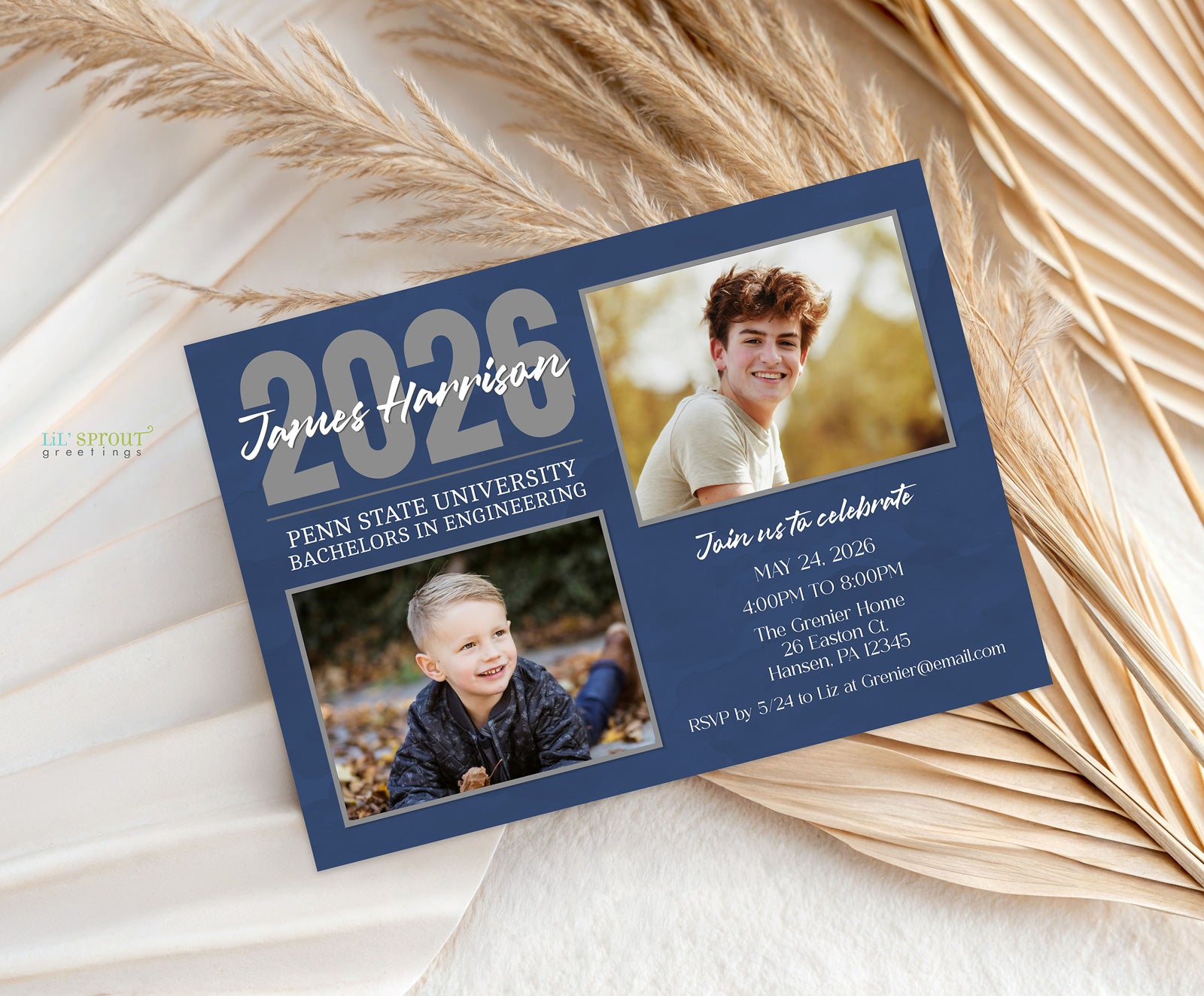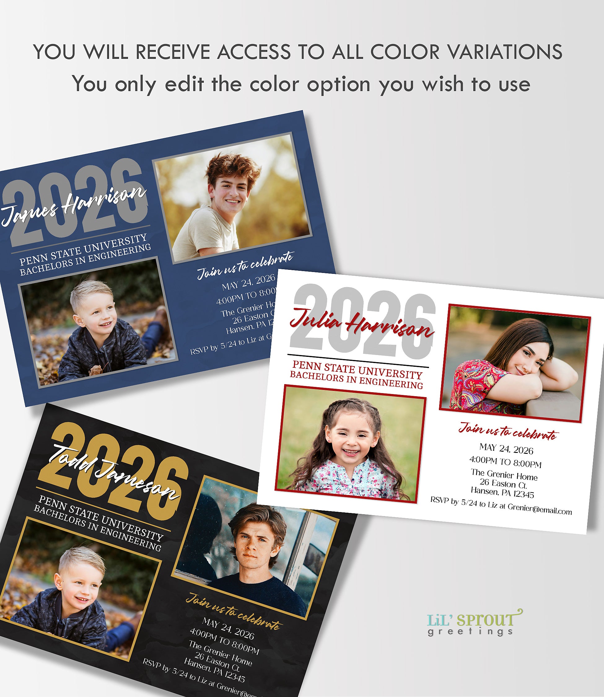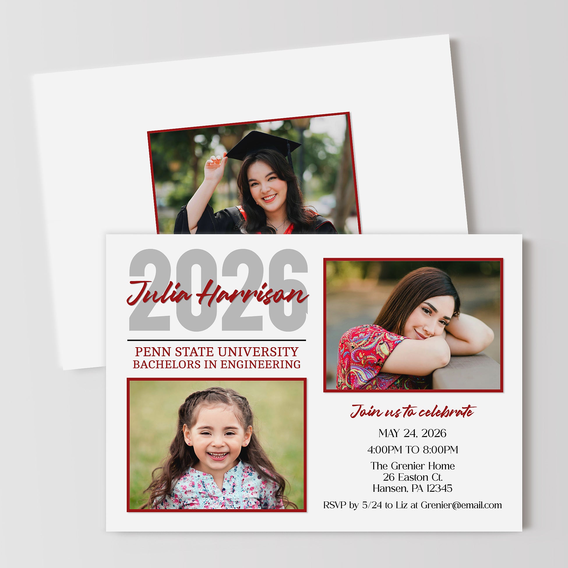 "Then and Now" graduation announcement template sharing a current photo of the graduate along with a childhood photo. Choose from one of the three color options provided or customize the colors to your choice when editing online. The background color, text color, fonts, wording can all be changed.