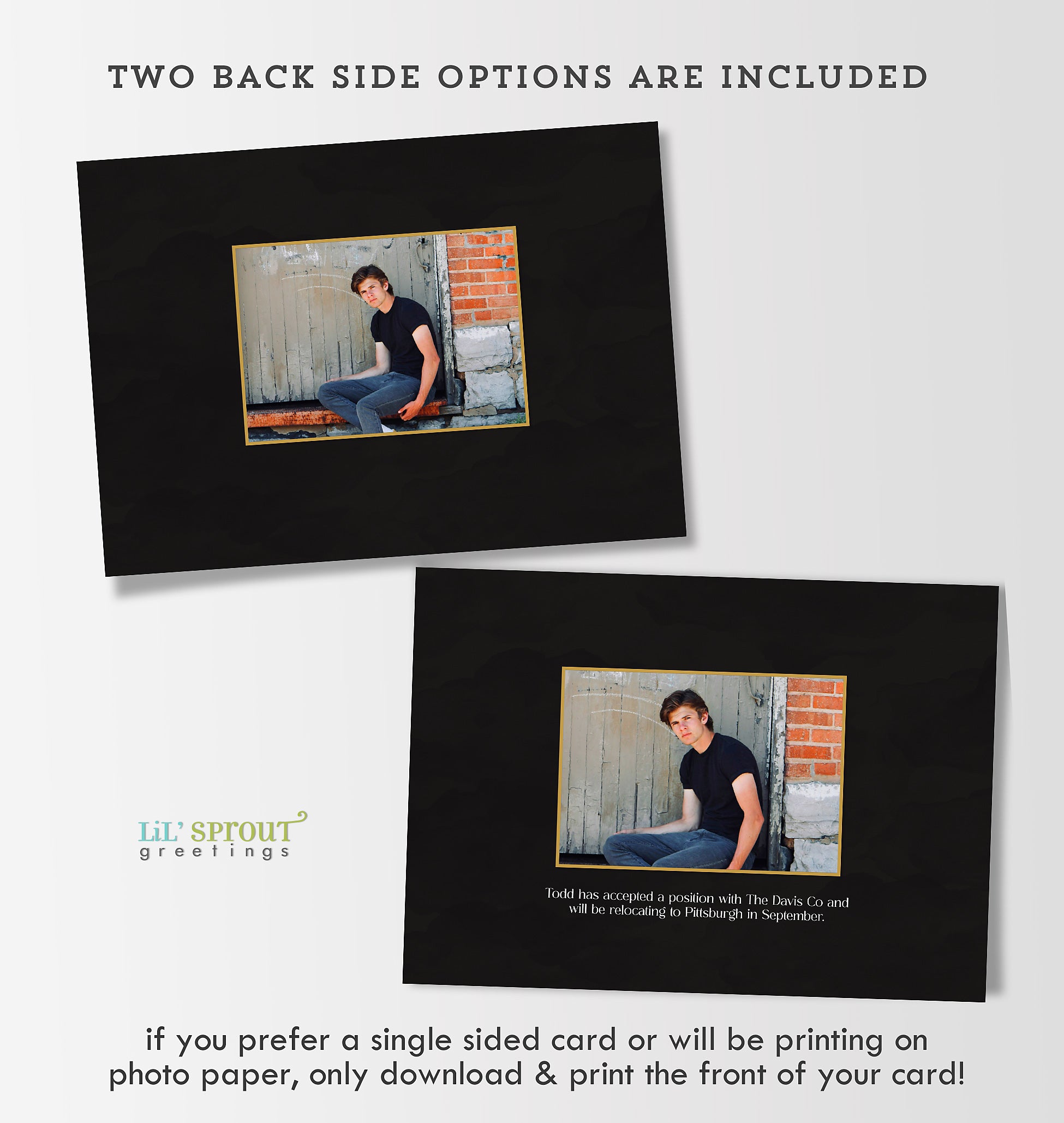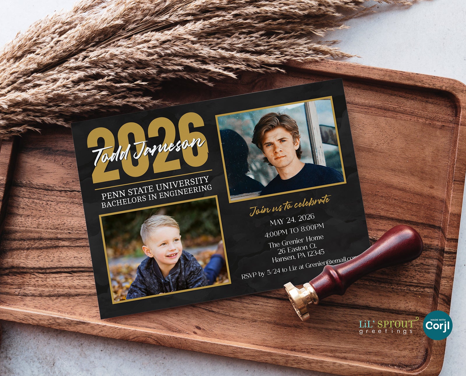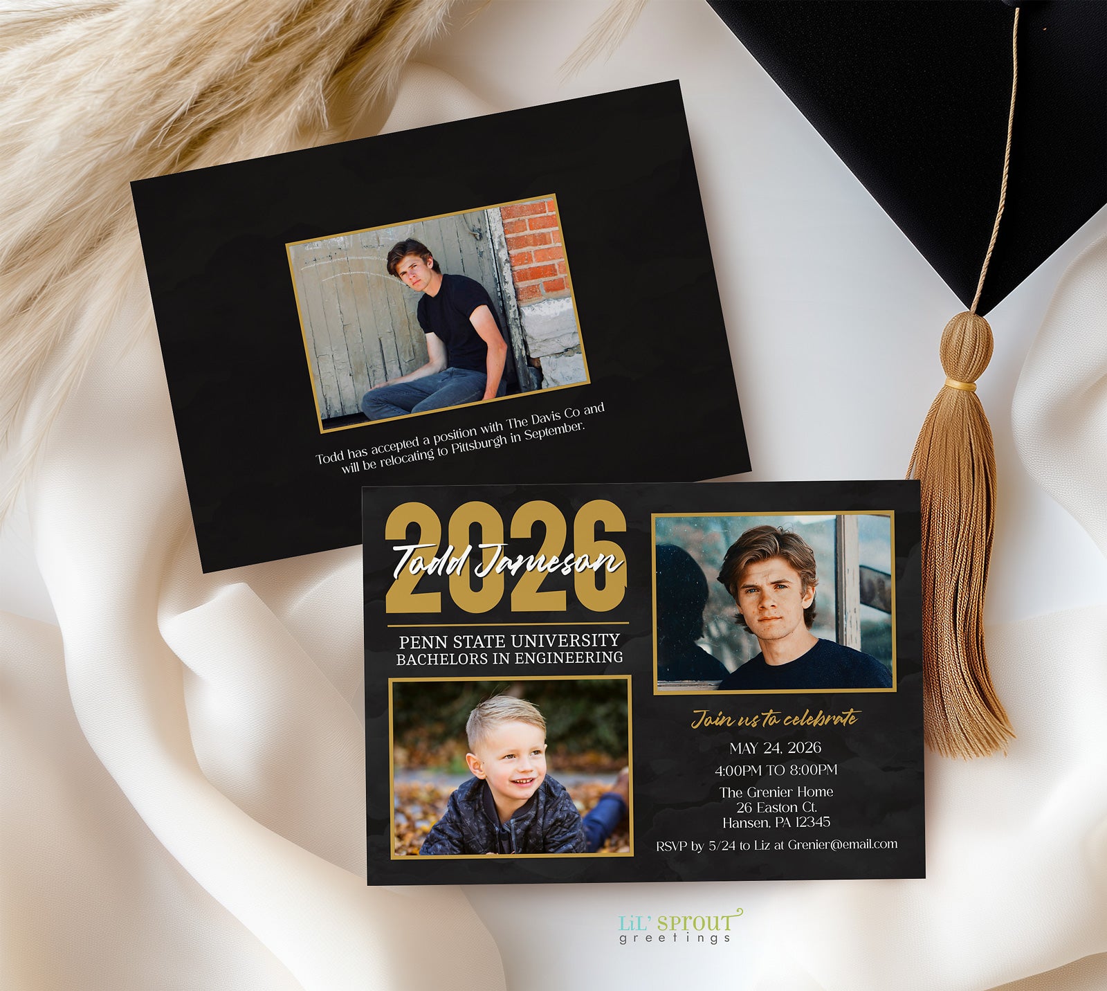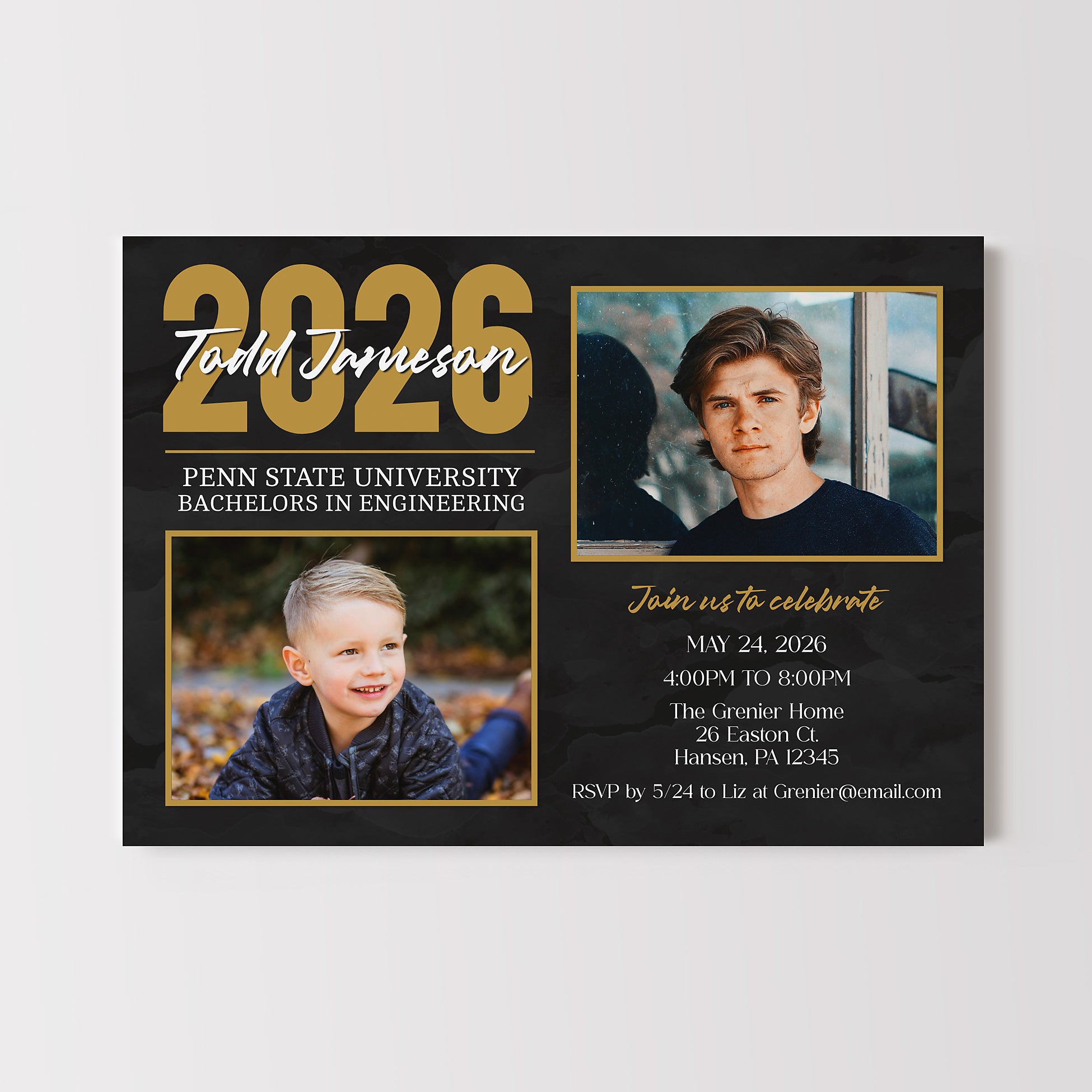 graduation announcement template in a horizontal format with a black background, gold accents and white text. features one childhood photo of the graduate and one senior photo for a then and now design.