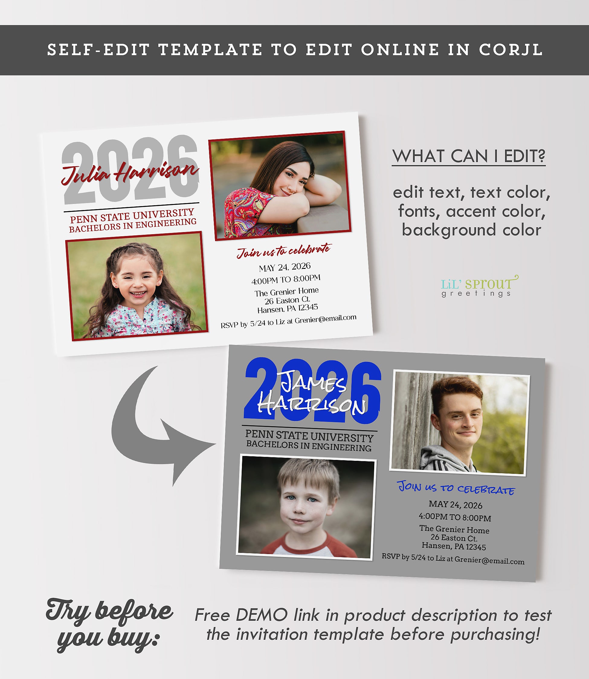 Our invitation and product templates are formatted for editing on Corjl, an in-browser template editor that allows you to login, add your text and photos to your card template and download the completed files. No software or experience is necessary. Edit from a computer or a mobile device. Use your completed files to print your completed template or send it digitally.