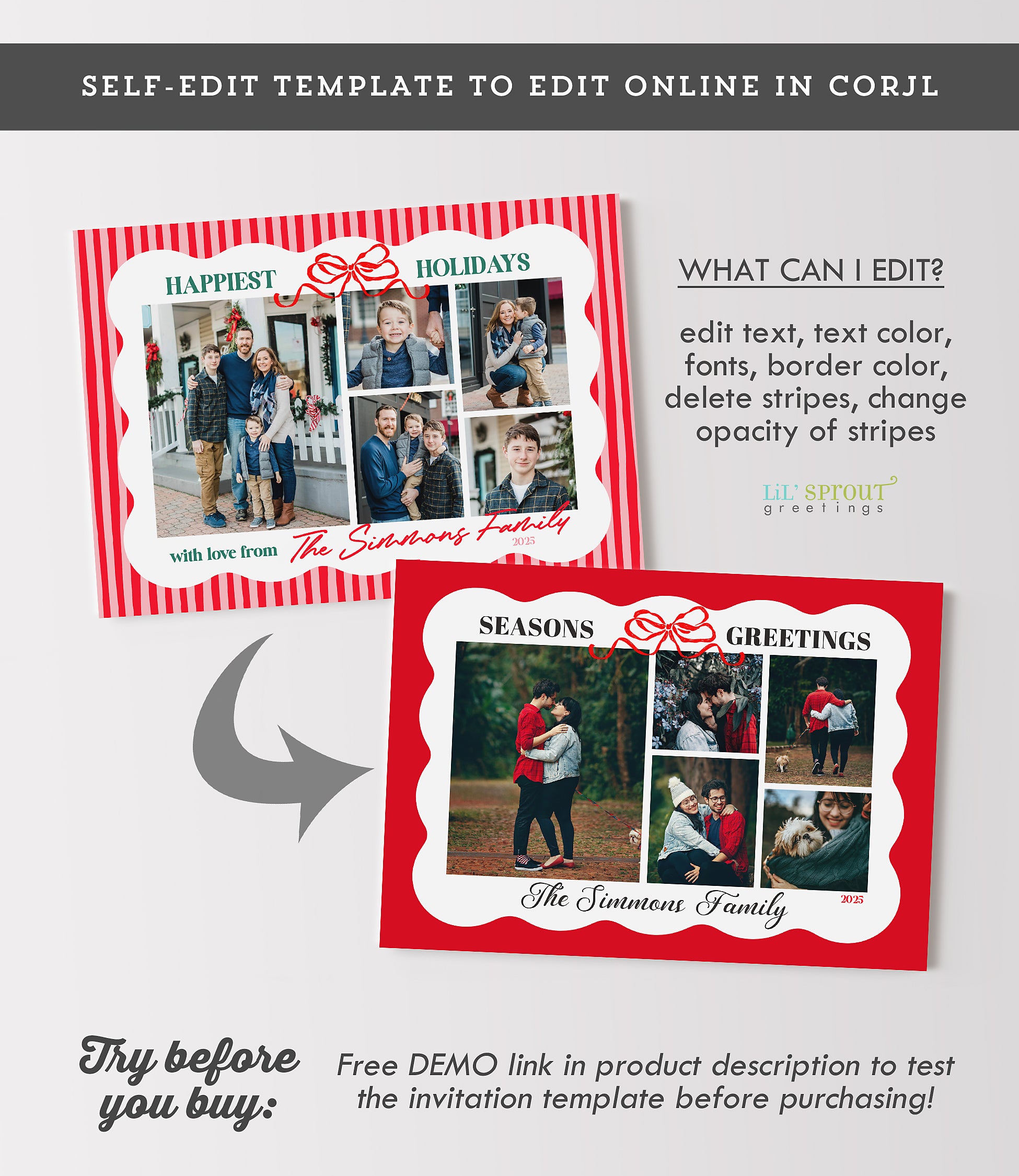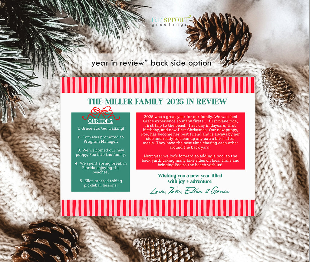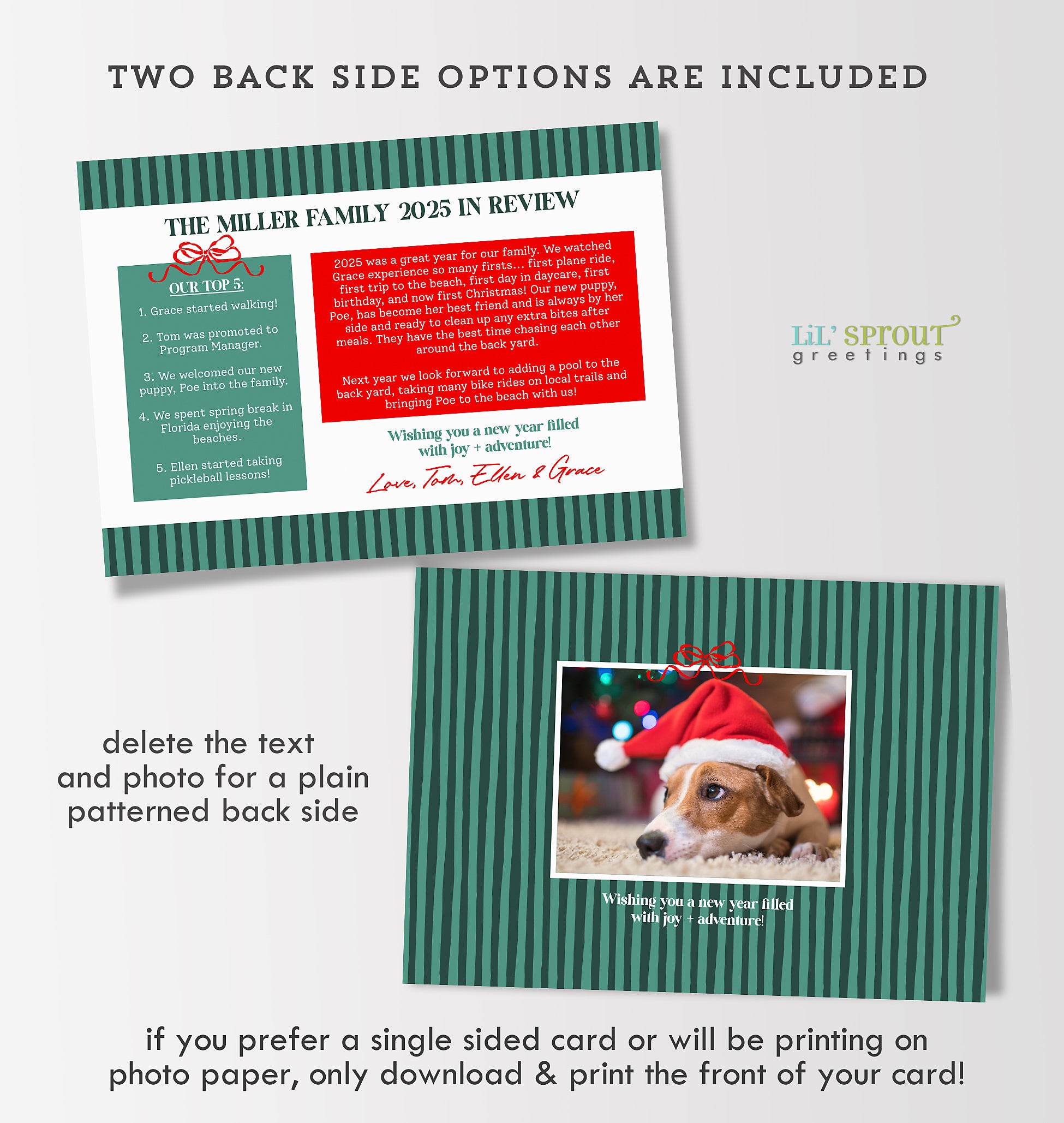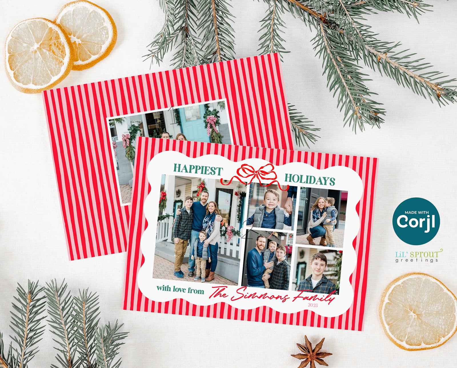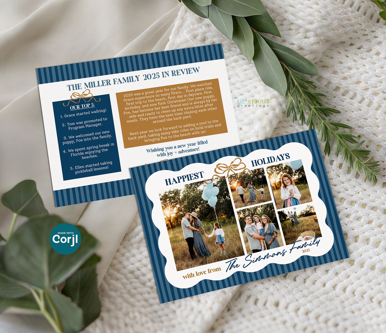 Whimsical holiday card design with several options to offer you flexibility. Choose from 5 color options, including bright shades of red and green or more rustic, neutral shades of blue, cranberry and beige. For the front side options to add 1, 2 or a collage of 5 photos are included. The back side includes two options: add a photo and few lines of text or include a full "year in review" / family update. The fun striped background color on this holiday card design can be customized when editing online in Corjl if you prefer a different color than what is provided.