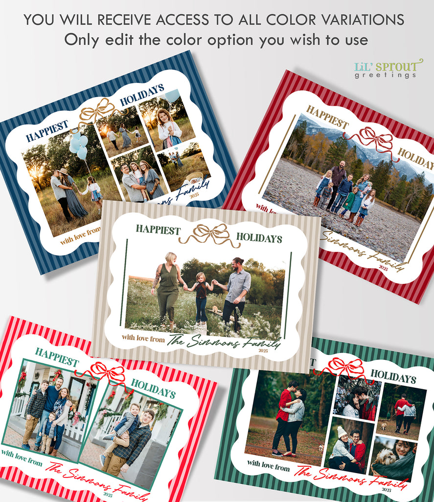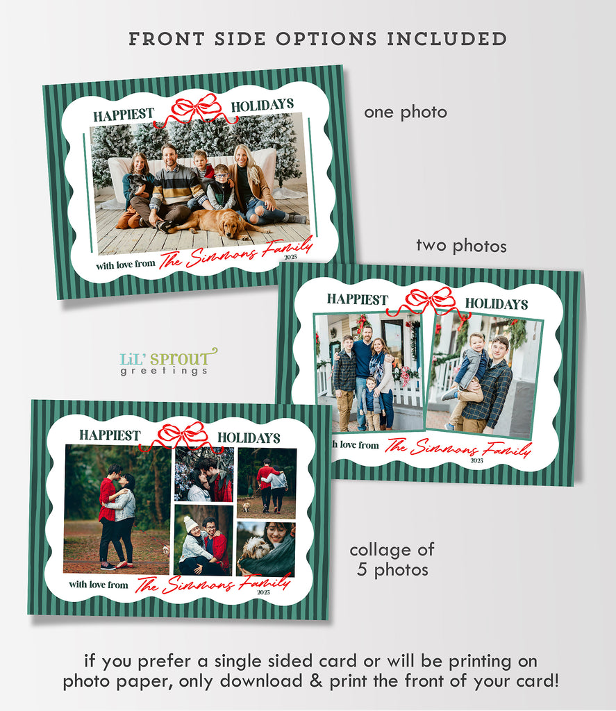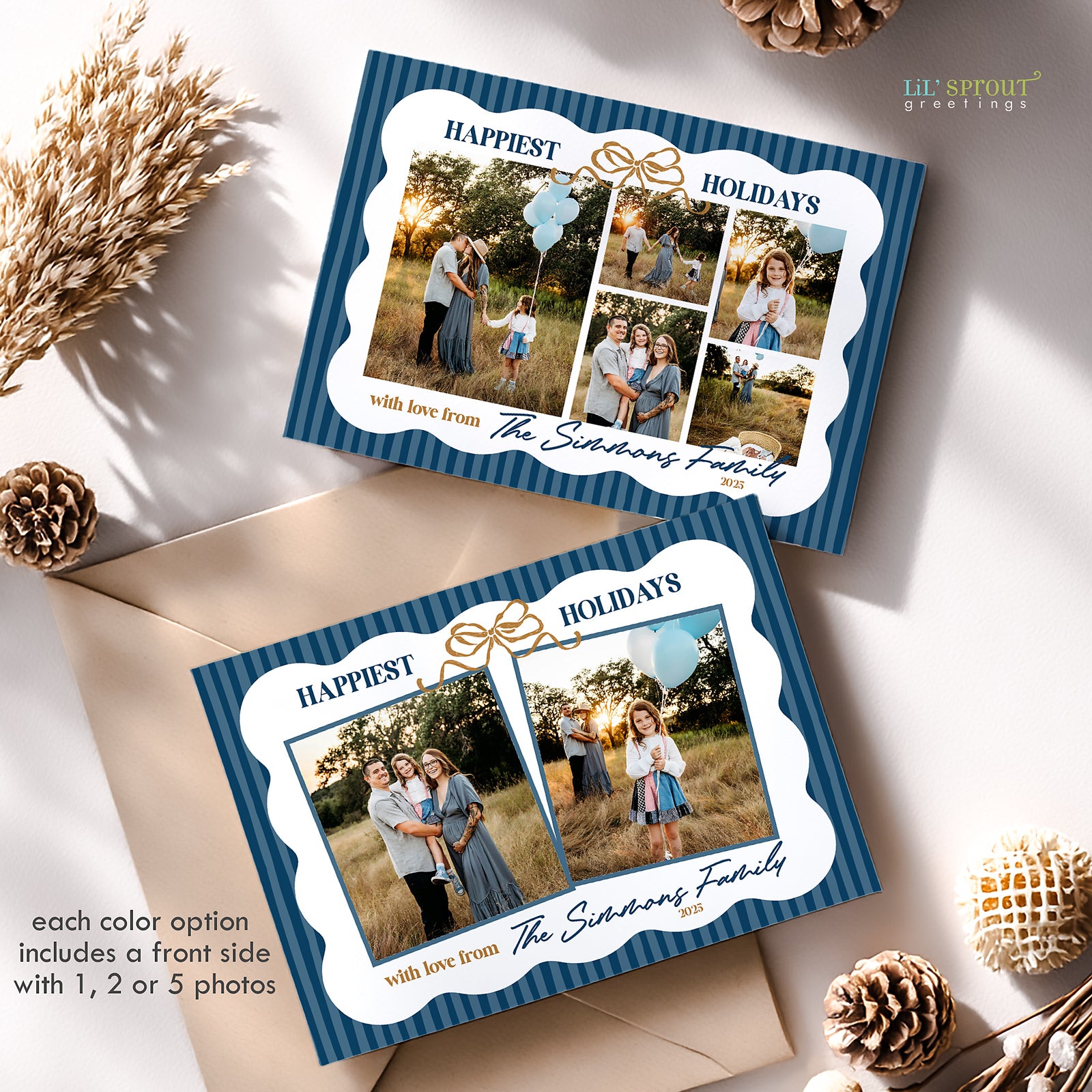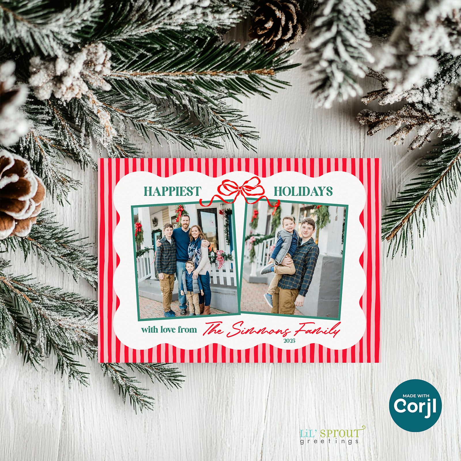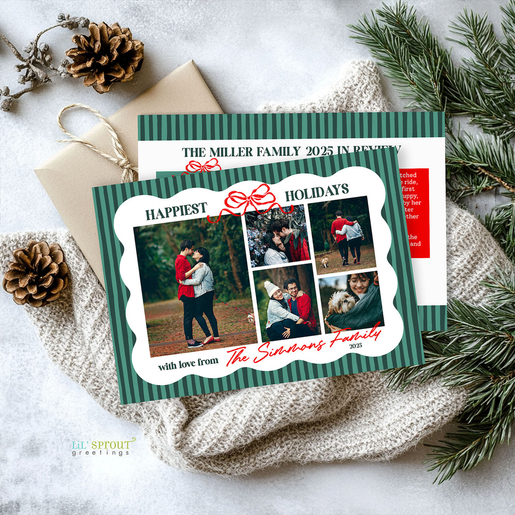 Whimsical holiday card design with several options to offer you flexibility. Choose from 5 color options, including bright shades of red and green or more rustic, neutral shades of blue, cranberry and beige. For the front side options to add 1, 2 or a collage of 5 photos are included. The back side includes two options: add a photo and few lines of text or include a full "year in review" / family update. The fun striped background color on this holiday card design can be customized when editing online in Corjl if you prefer a different color than what is provided.