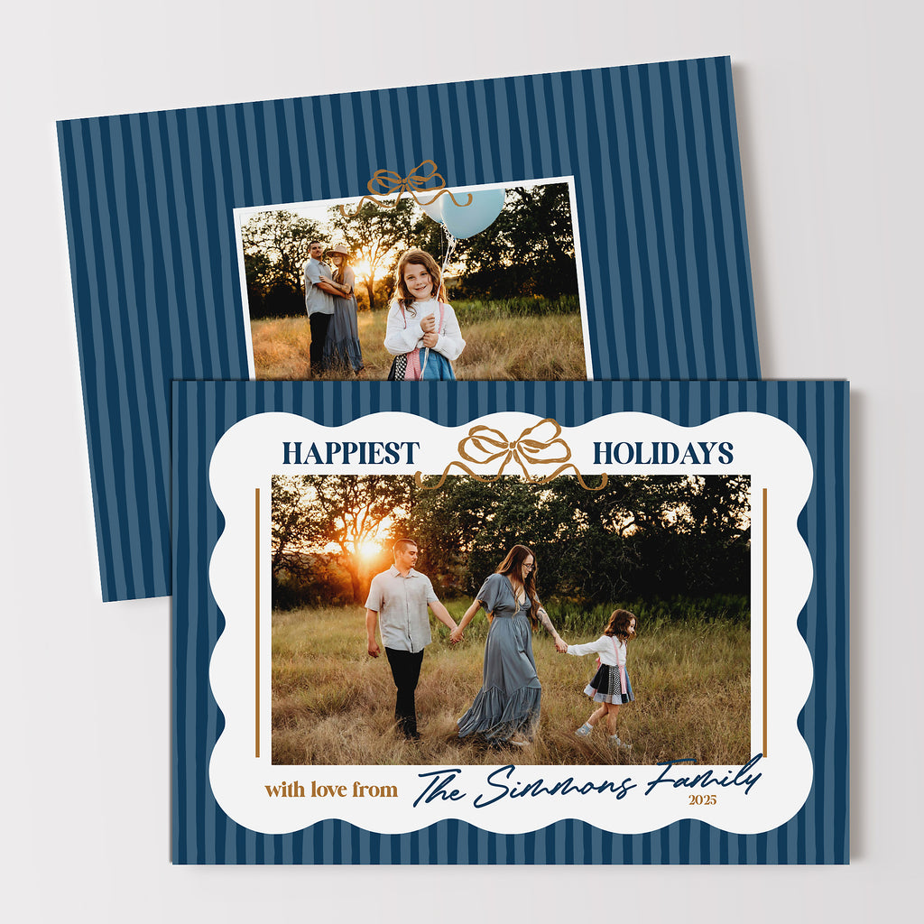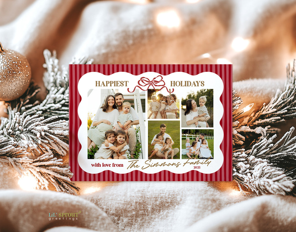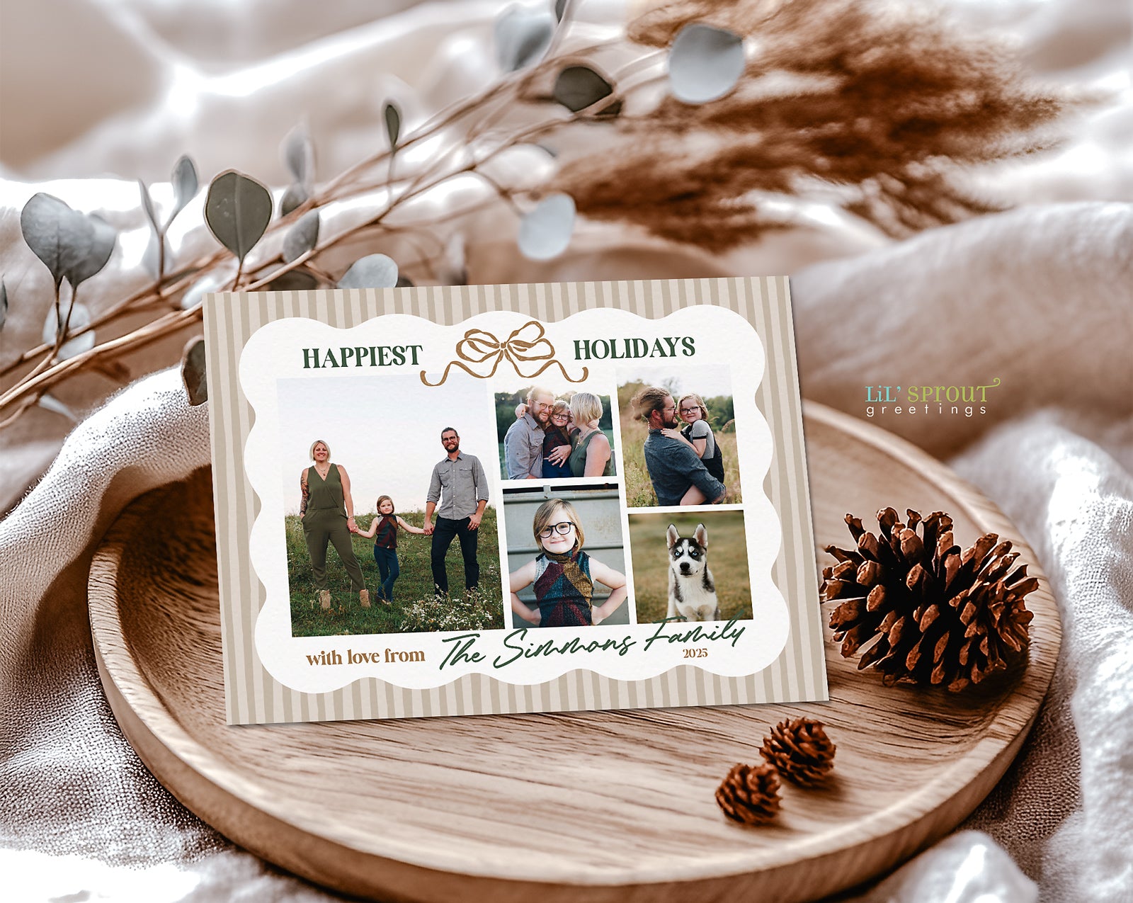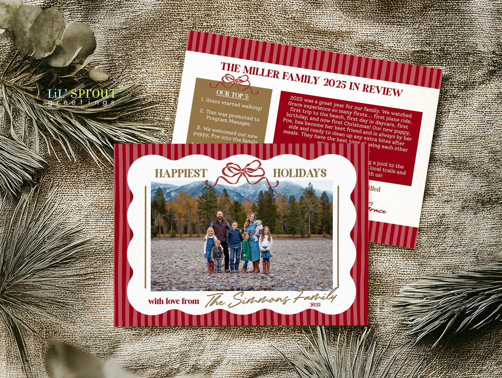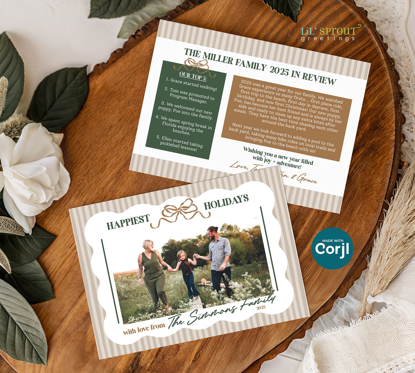 Whimsical holiday card design with several options to offer you flexibility. Choose from 5 color options, including bright shades of red and green or more rustic, neutral shades of blue, cranberry and beige. For the front side options to add 1, 2 or a collage of 5 photos are included. The back side includes two options: add a photo and few lines of text or include a full "year in review" / family update. The fun striped background color on this holiday card design can be customized when editing online in Corjl if you prefer a different color than what is provided.
