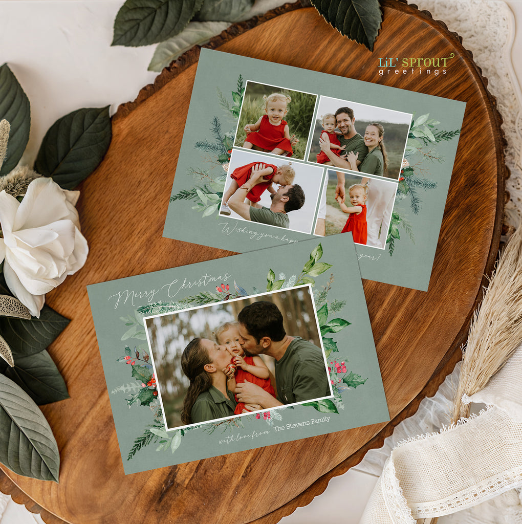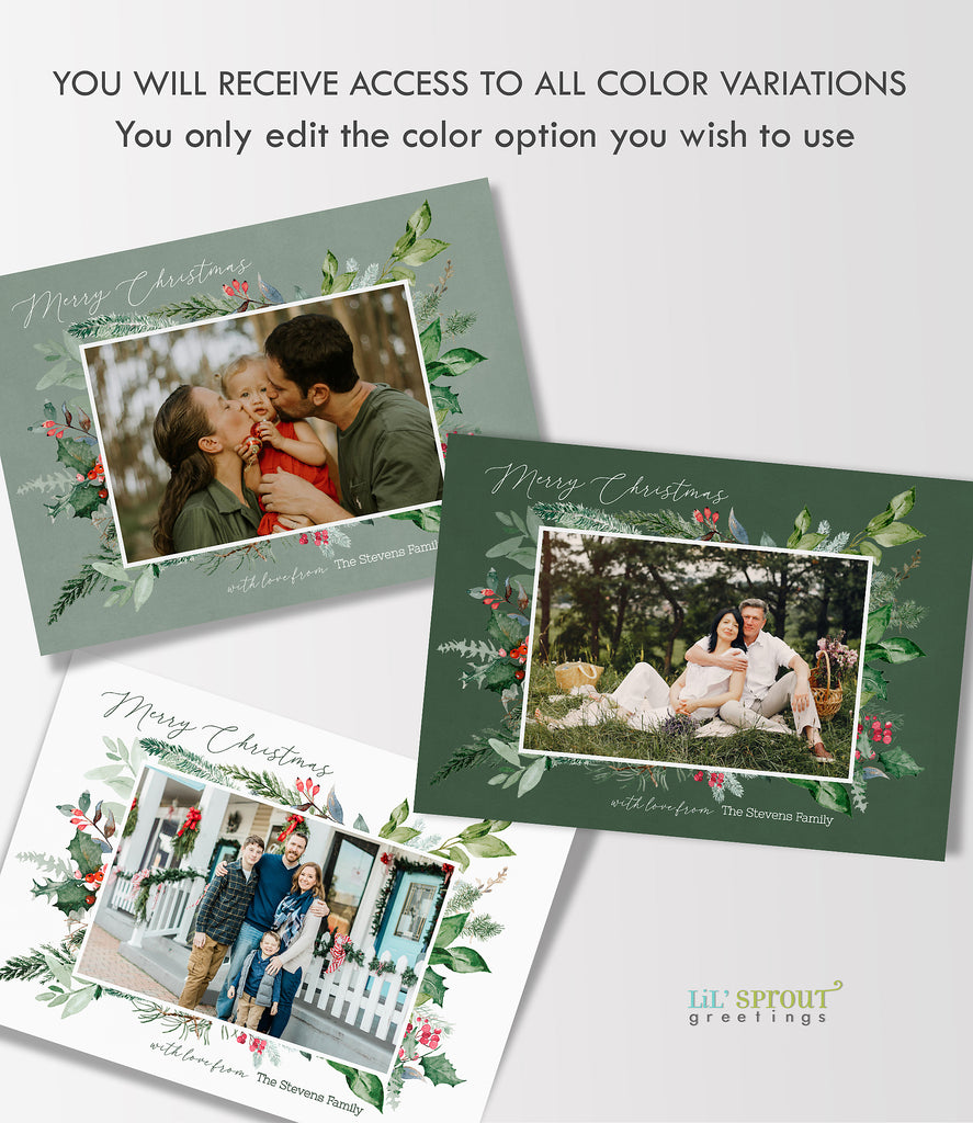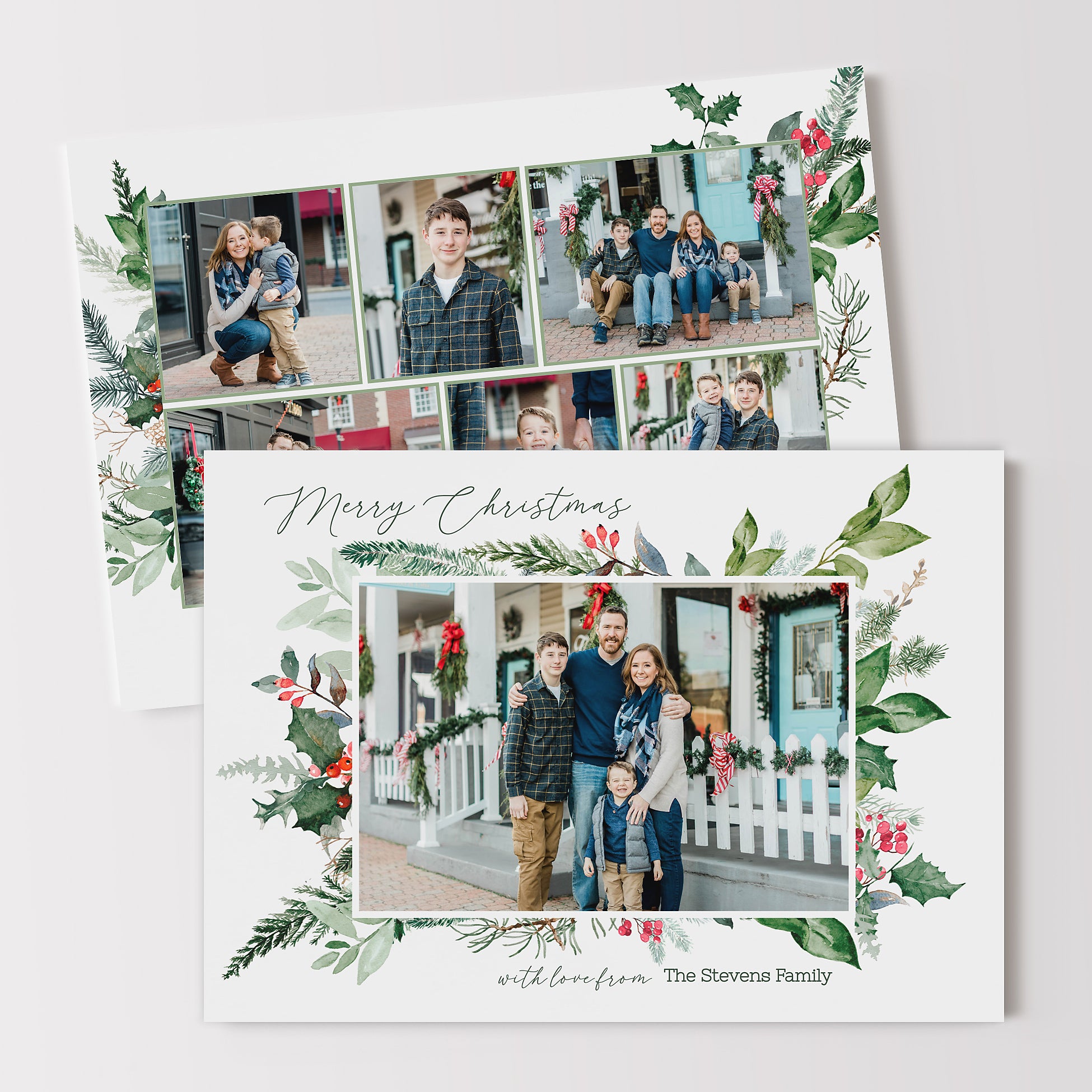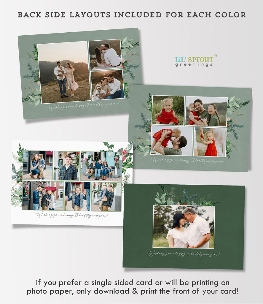Holiday card featuring photos framed with winter greenery, including holly, berries and evergreen branches. Choose from one of our three color options or customize the background color when editing. Four back side layouts are included-- choose from a 1, 3, 4 or 6 photo design for the back side. If you prefer a single sided card then you only need to download and print the front.