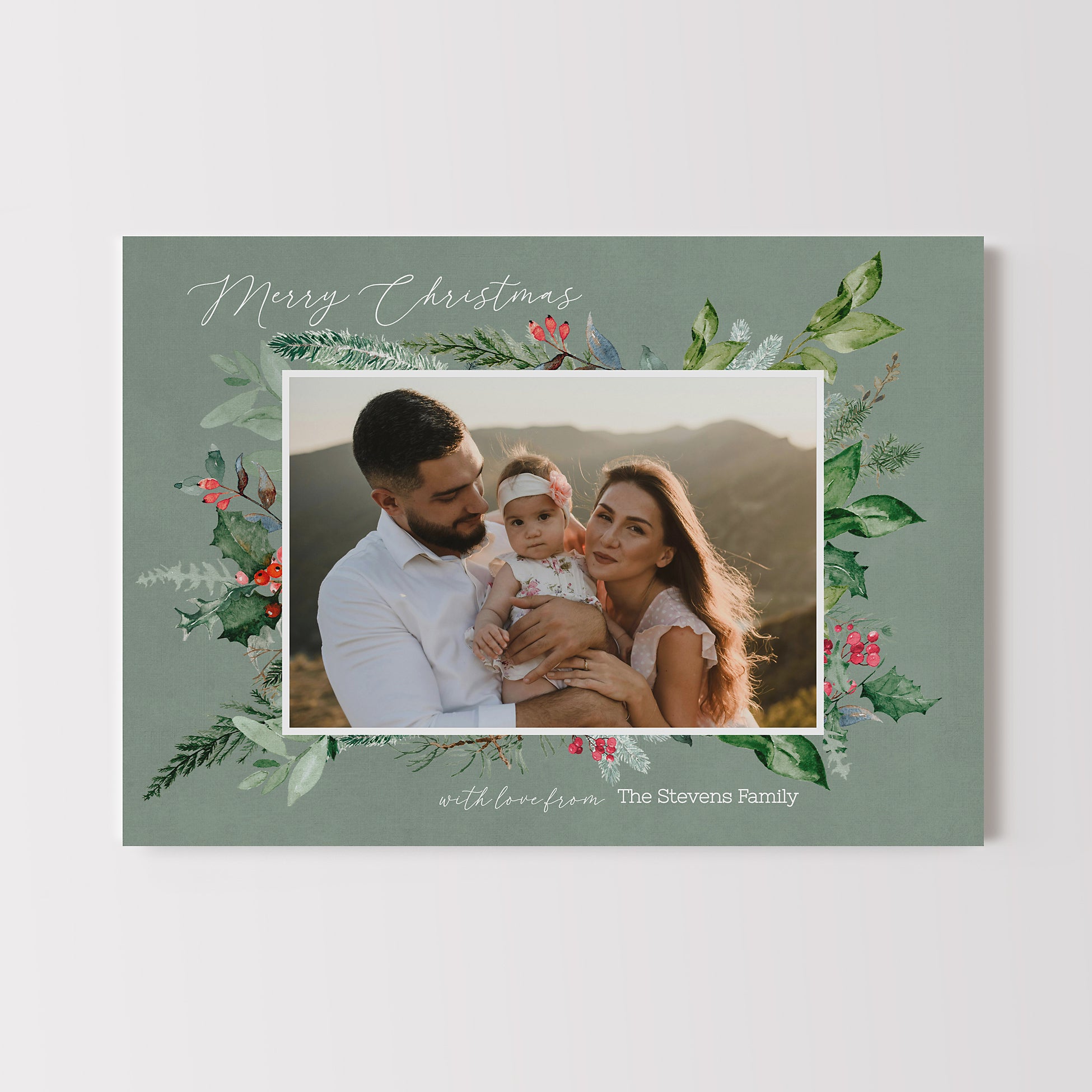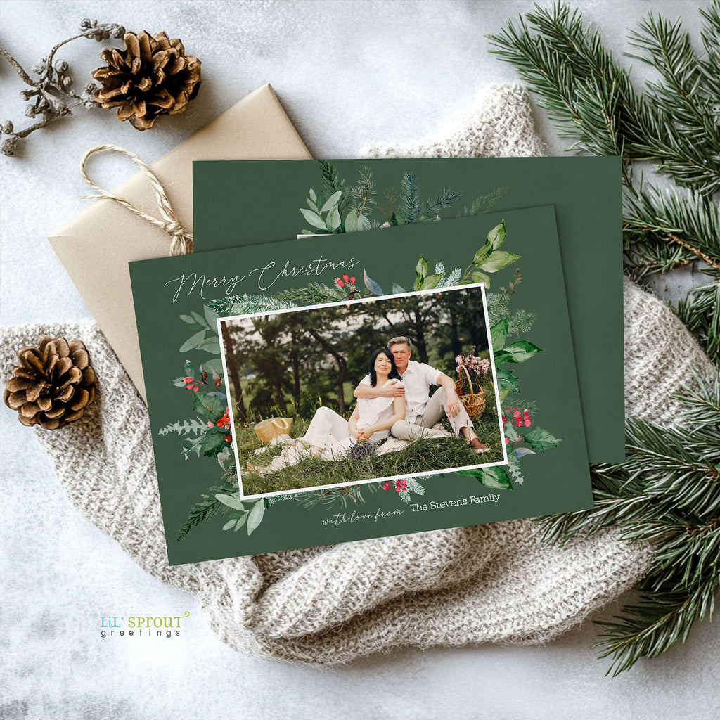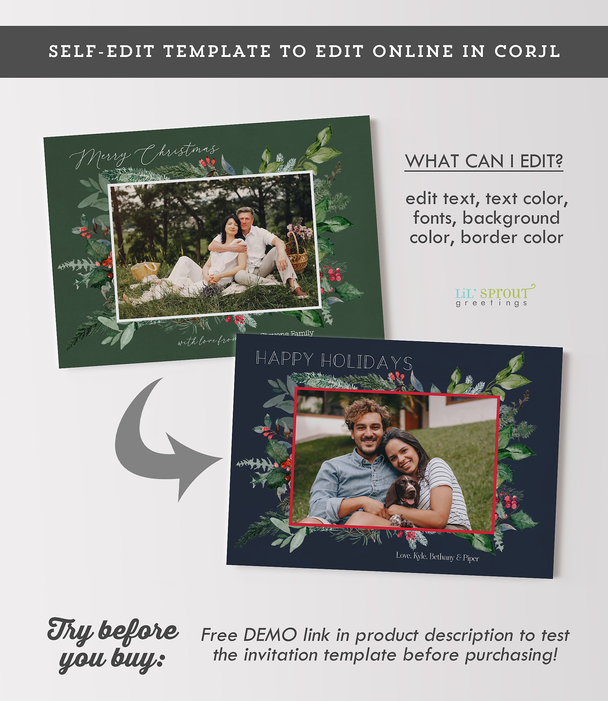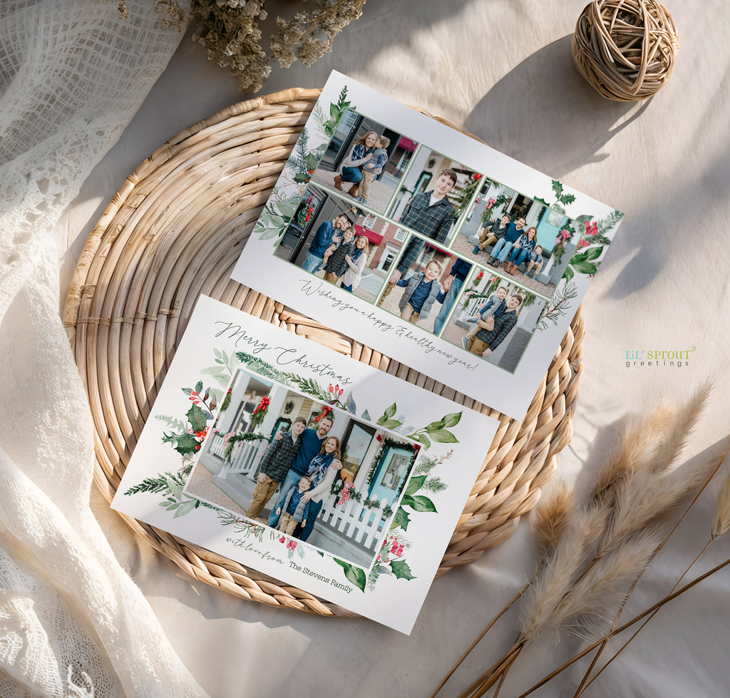 Holiday card featuring photos framed with winter greenery, including holly, berries and evergreen branches. Choose from one of our three color options or customize the background color when editing. Four back side layouts are included-- choose from a 1, 3, 4 or 6 photo design for the back side. If you prefer a single sided card then you only need to download and print the front.